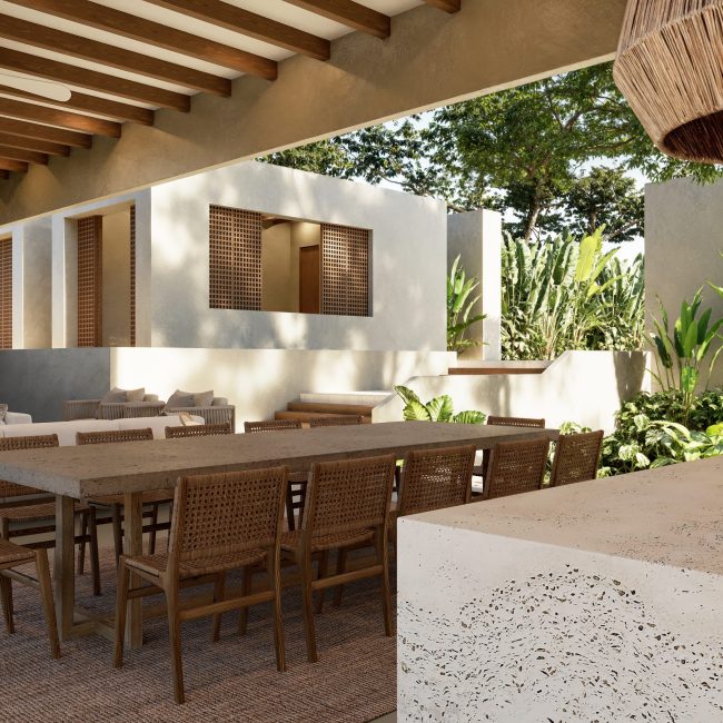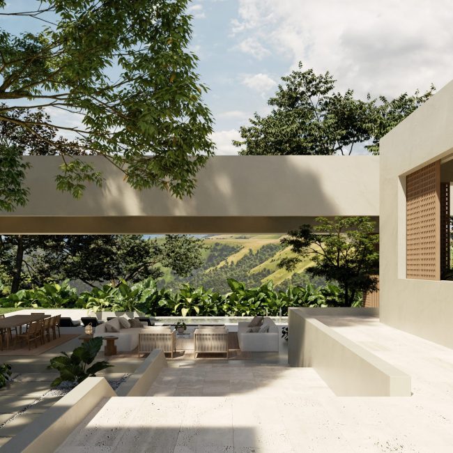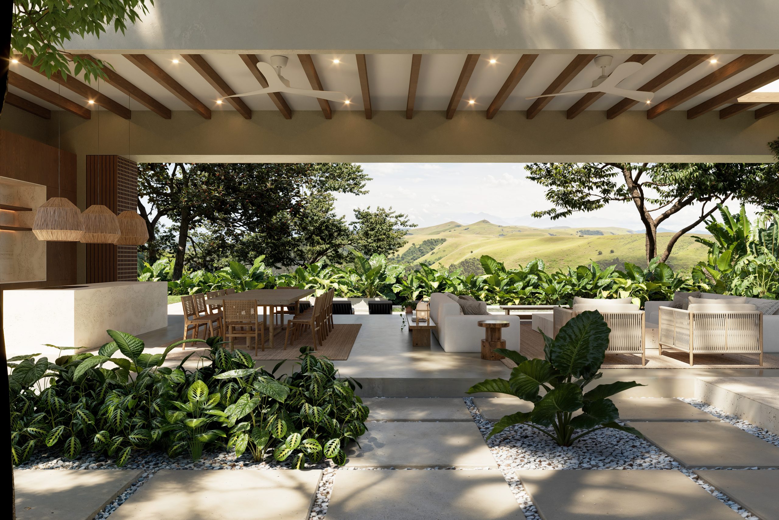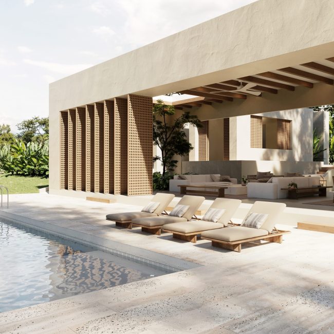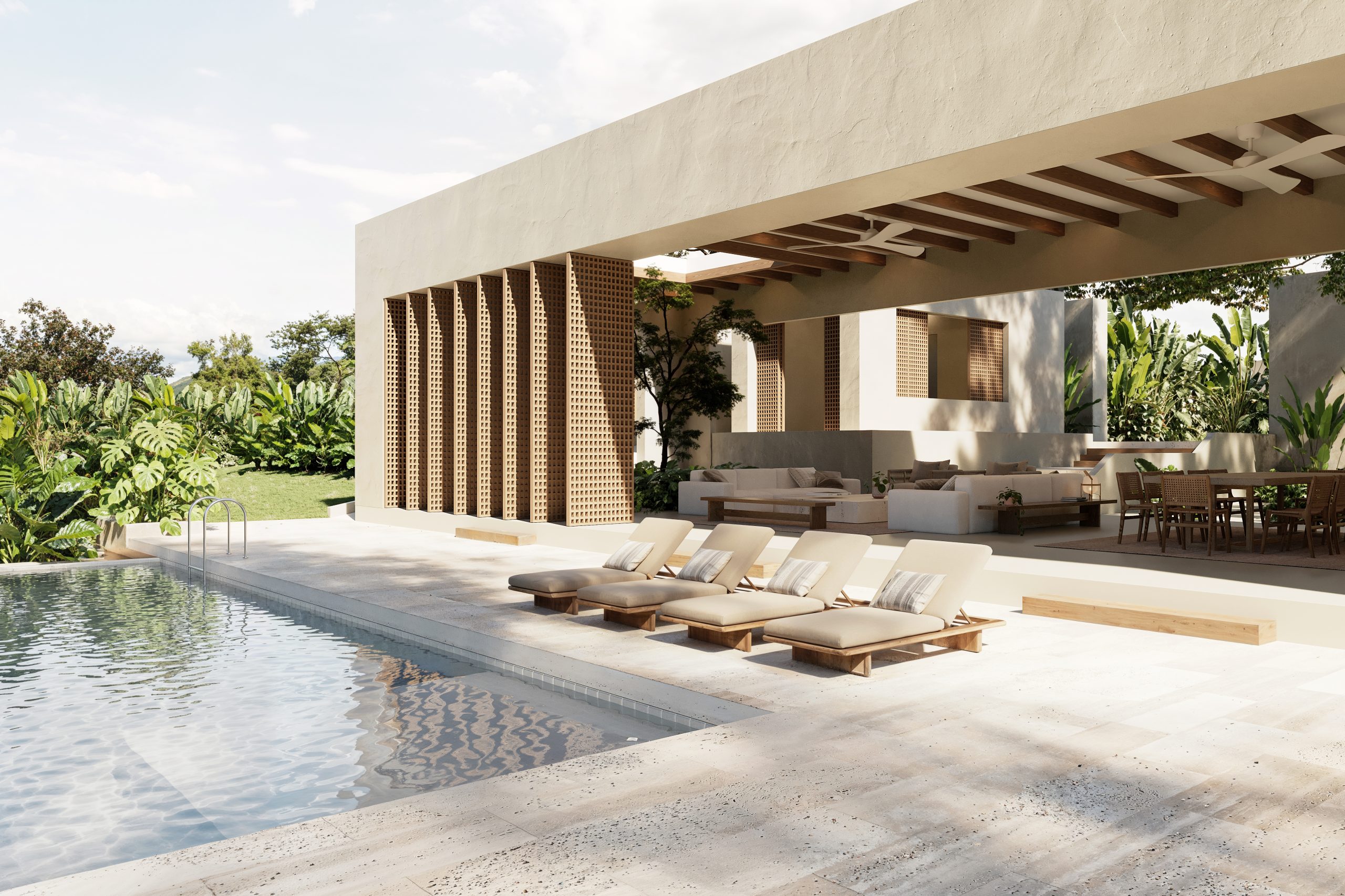 Las zonas sociales se desarrollan en espacios abiertos, bajo cubiertas altas y generosas que protegen sin encerrar. La piscina, rodeada de vegetación tropical, se convierte en el corazón del proyecto, con vistas abiertas a las montañas. Los dormitorios, por su parte, gozan de privacidad y frescura, protegidos por celosías que filtran la luz y garantizan intimidad.