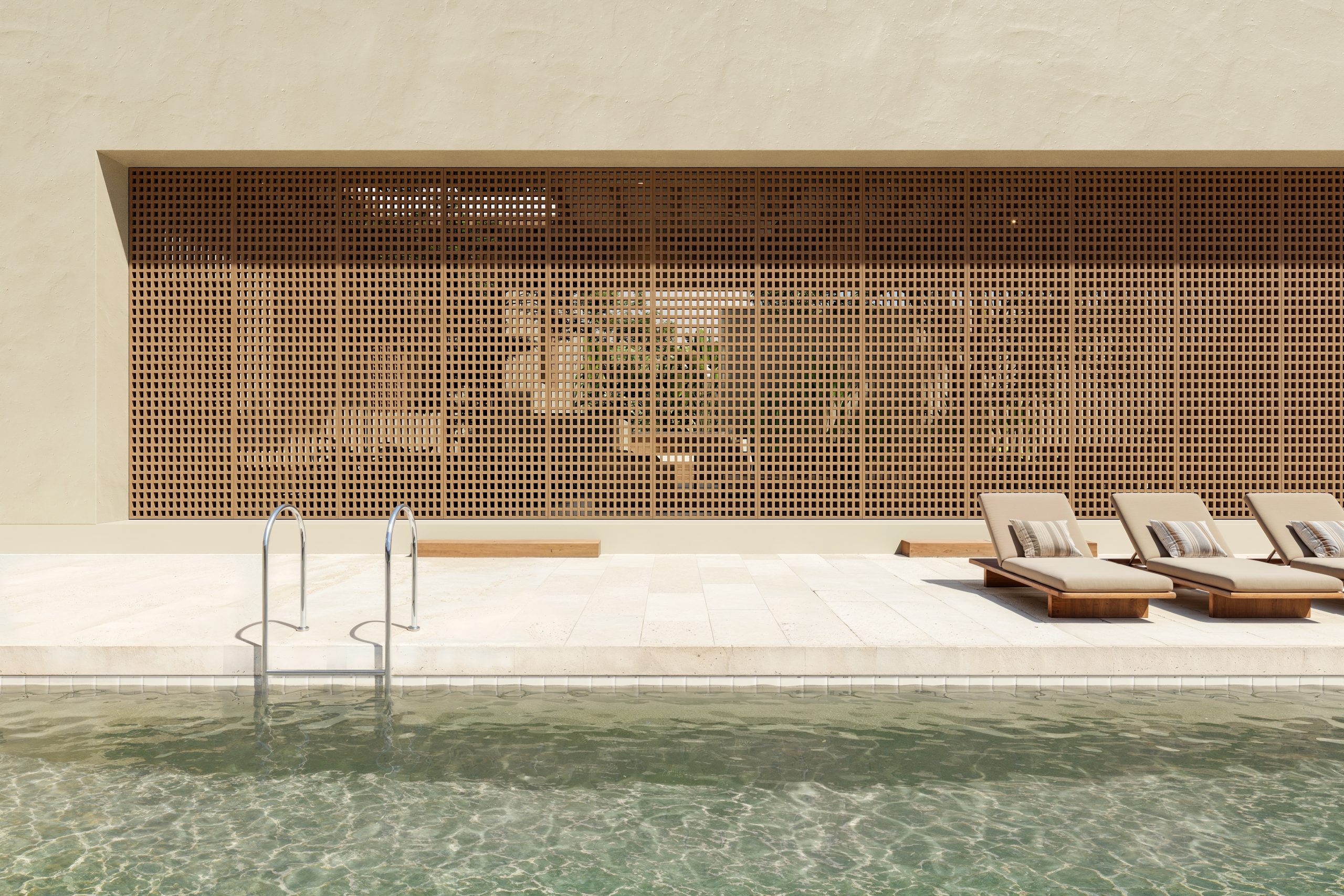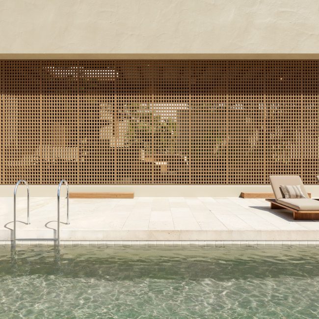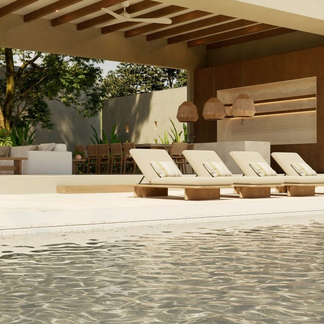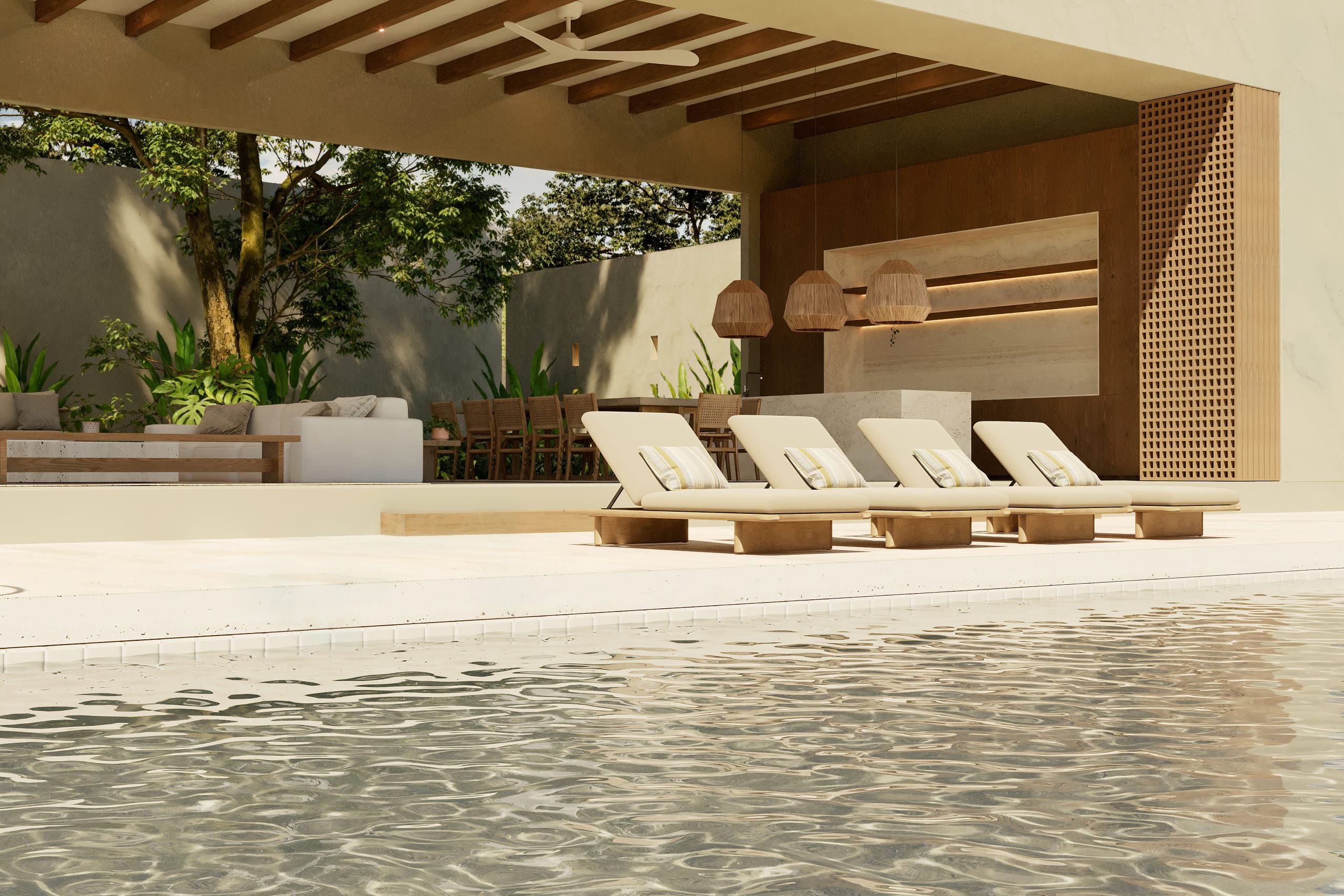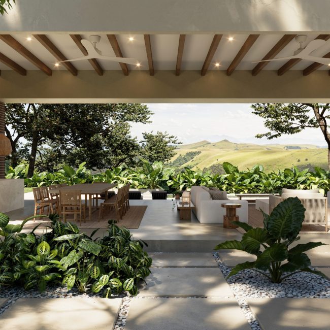 Las zonas sociales se desarrollan en espacios abiertos, bajo cubiertas altas y generosas que protegen sin encerrar. La piscina, rodeada de vegetación tropical, se convierte en el corazón del proyecto, con vistas abiertas a las montañas. Los dormitorios, por su parte, gozan de privacidad y frescura, protegidos por celosías que filtran la luz y garantizan intimidad.