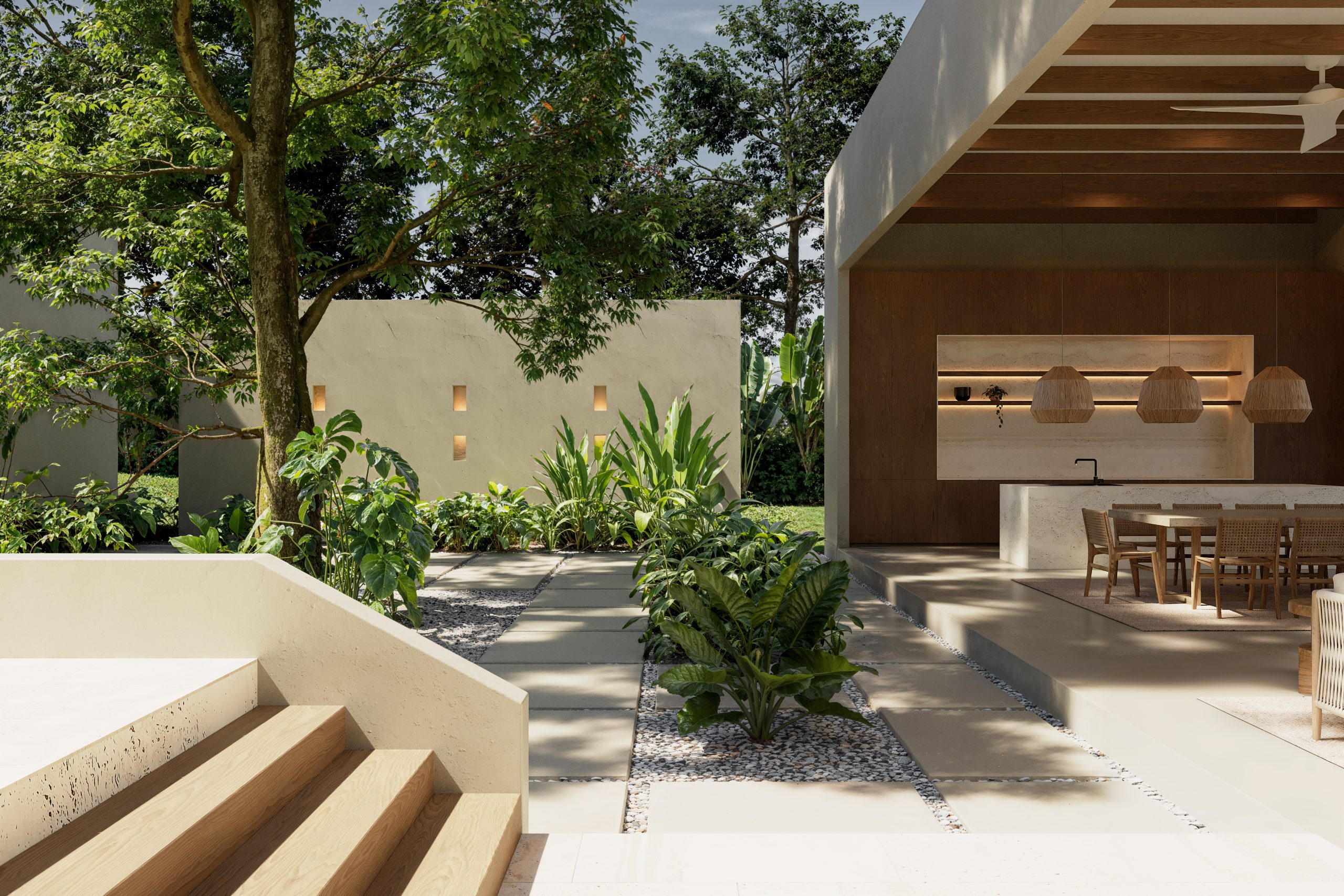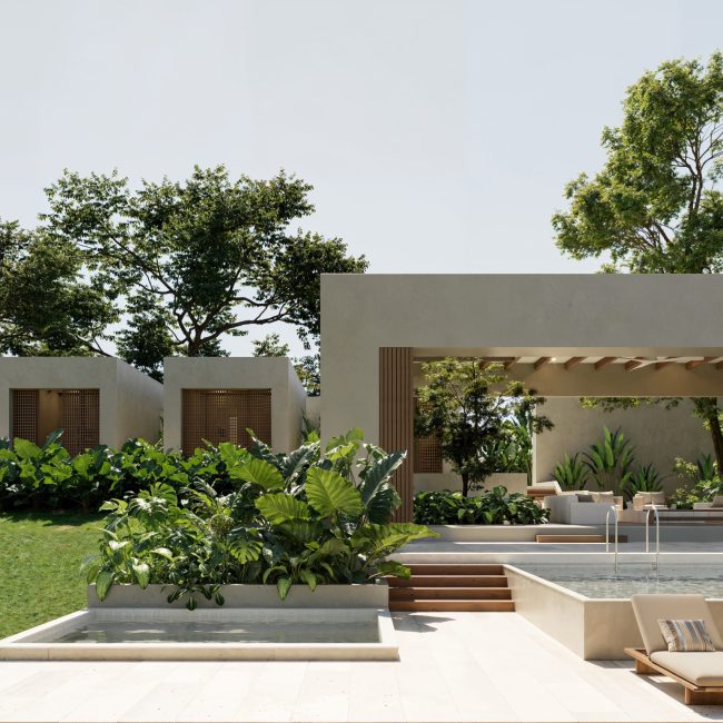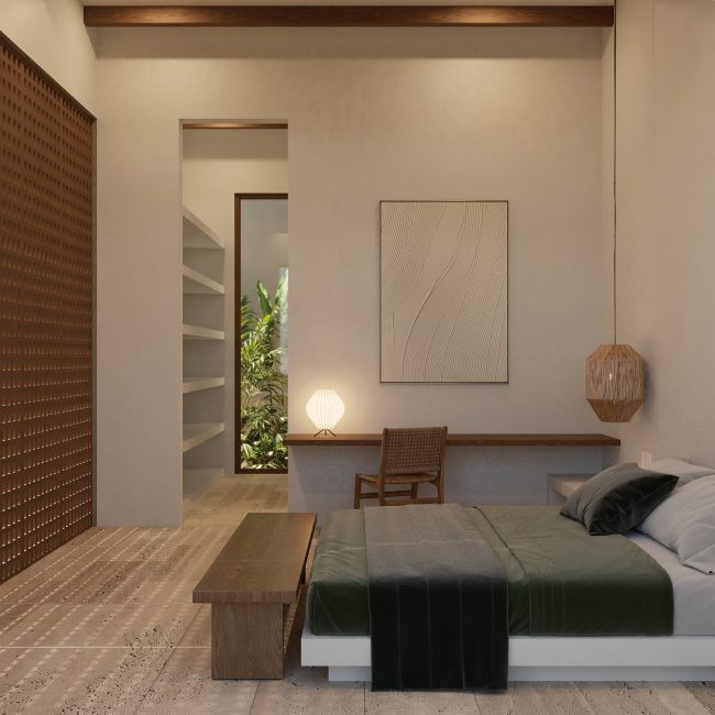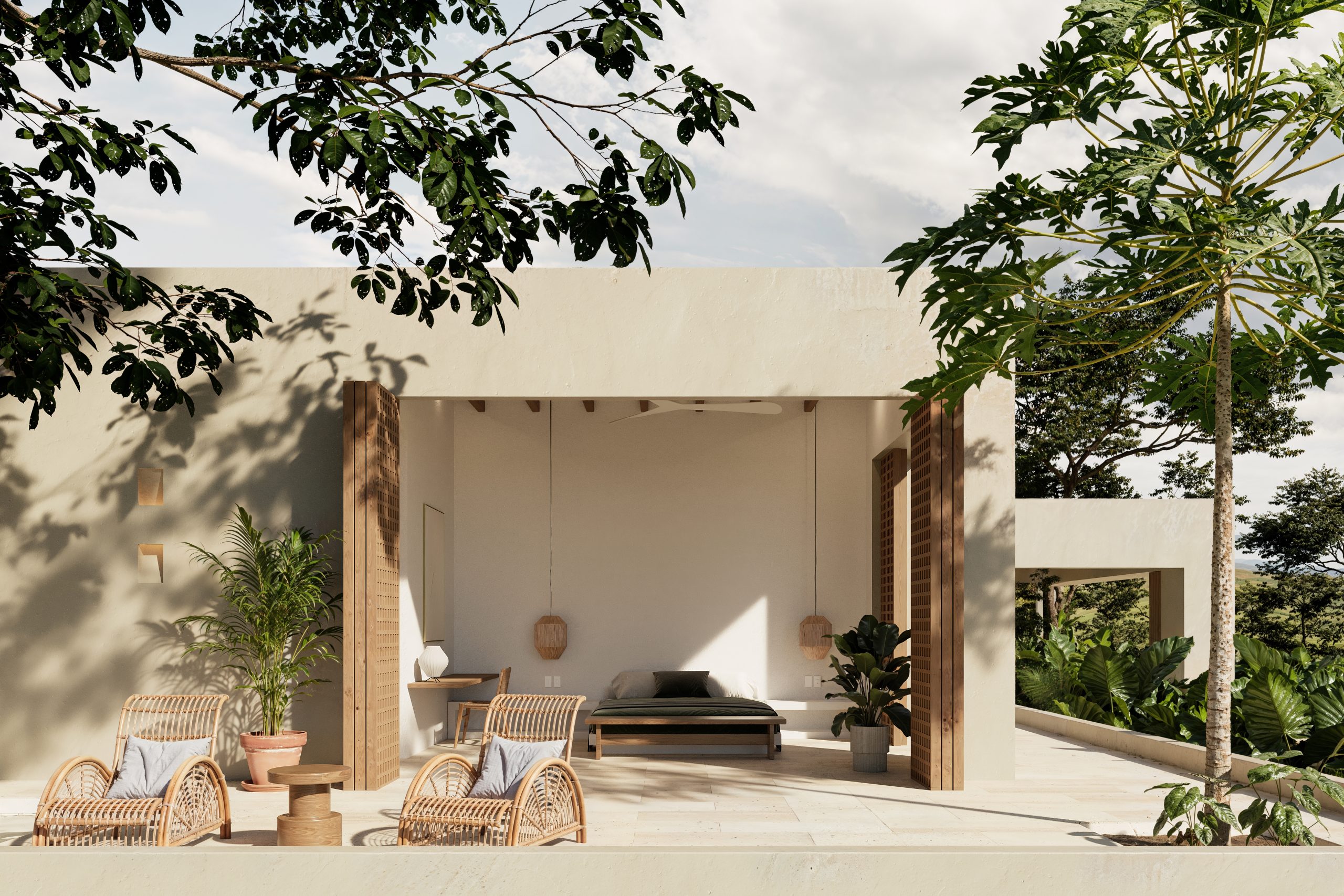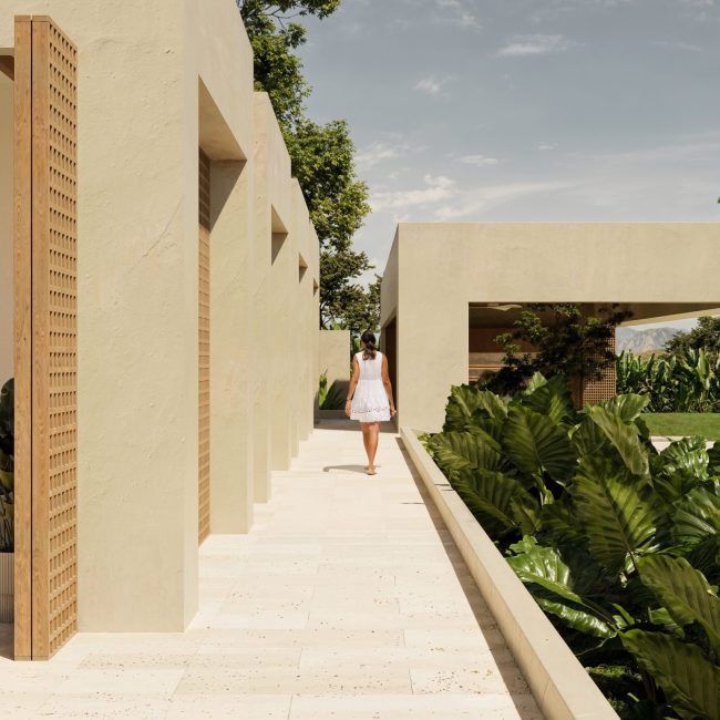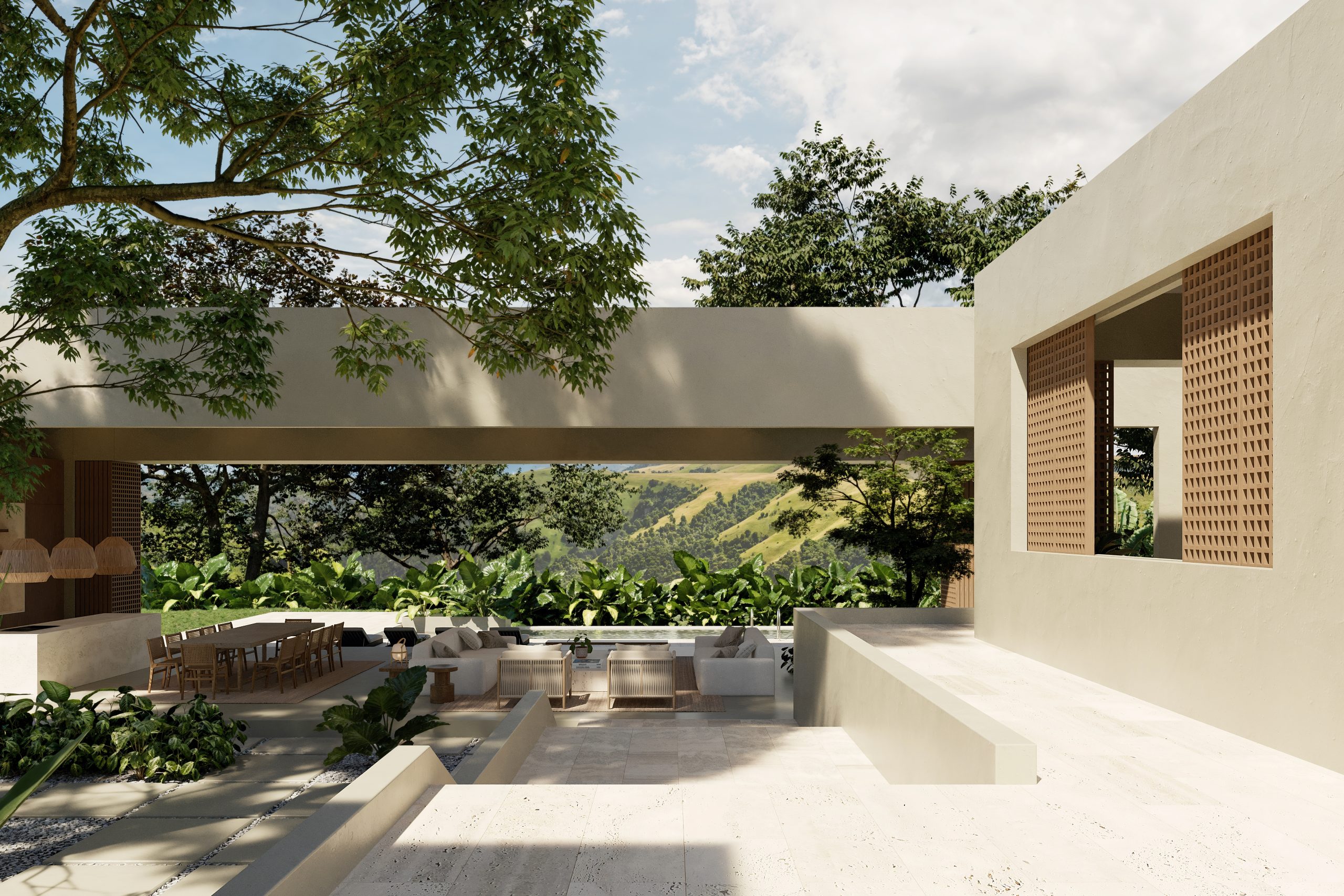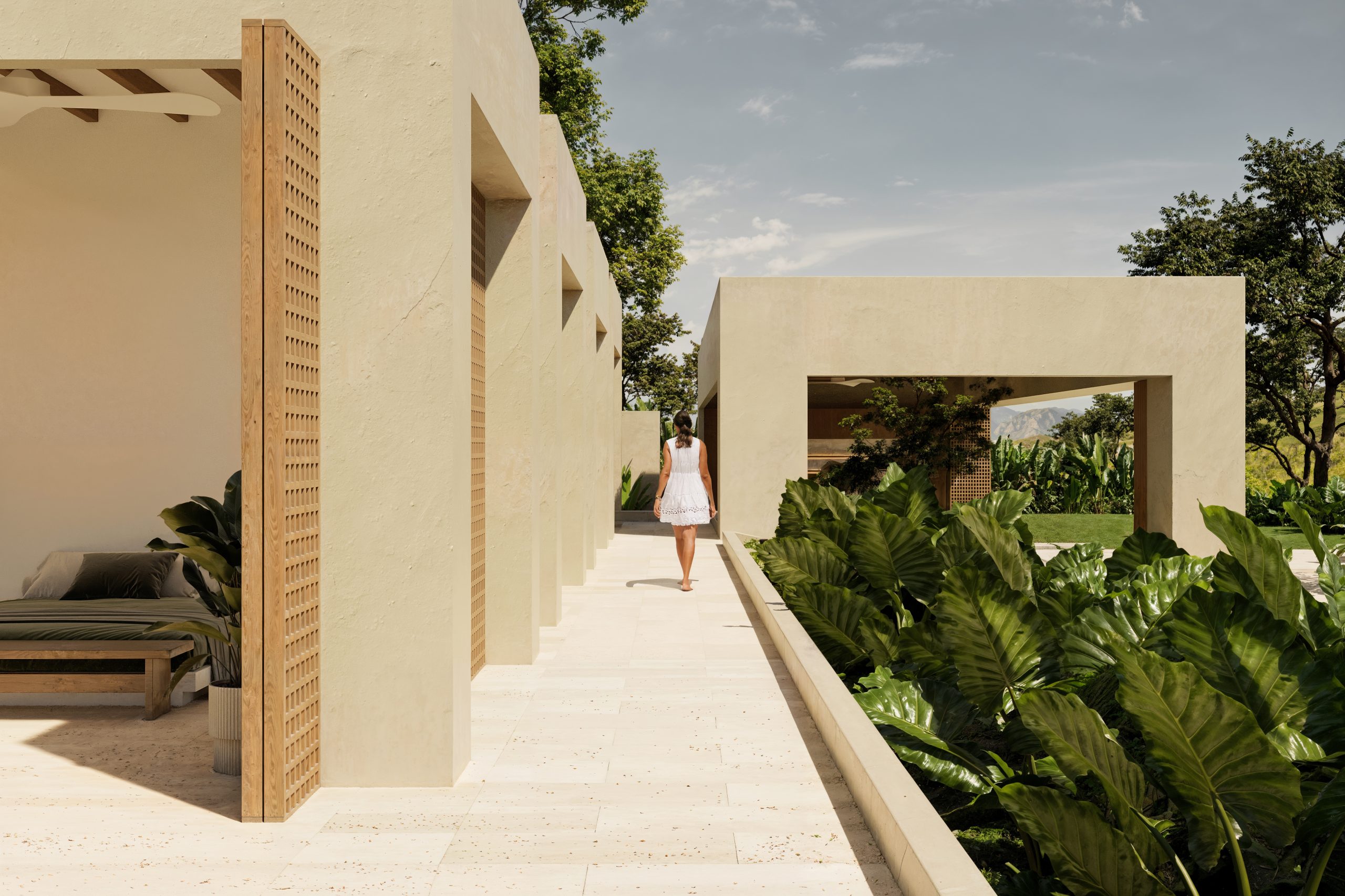 La arquitectura es limpia y minimalista, donde cada línea tiene un propósito y cada muro enmarca el paisaje. El diseño se compone de volúmenes independientes que se conectan a través de senderos abiertos, permitiendo que la vegetación se integre con la vida diaria. La materialidad, compuesta por tonos tierra, texturas naturales y acabados en piedra, madera y fibras naturales, refuerza la sensación de serenidad y calidez.