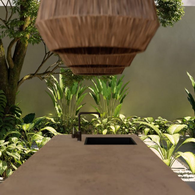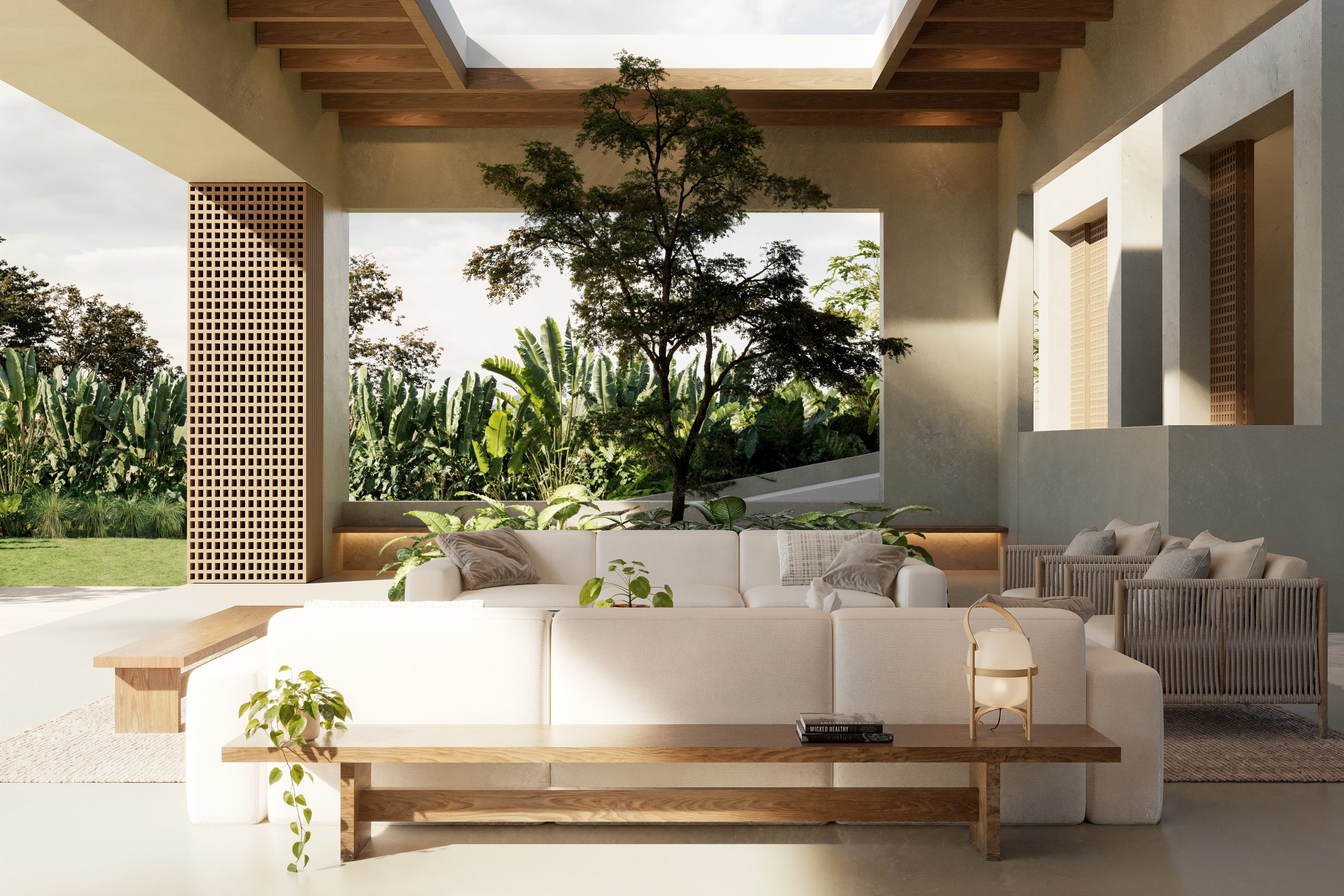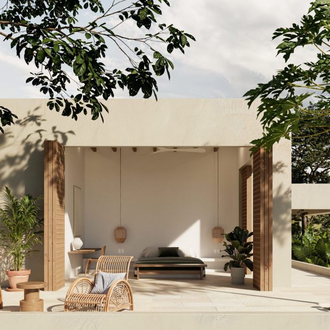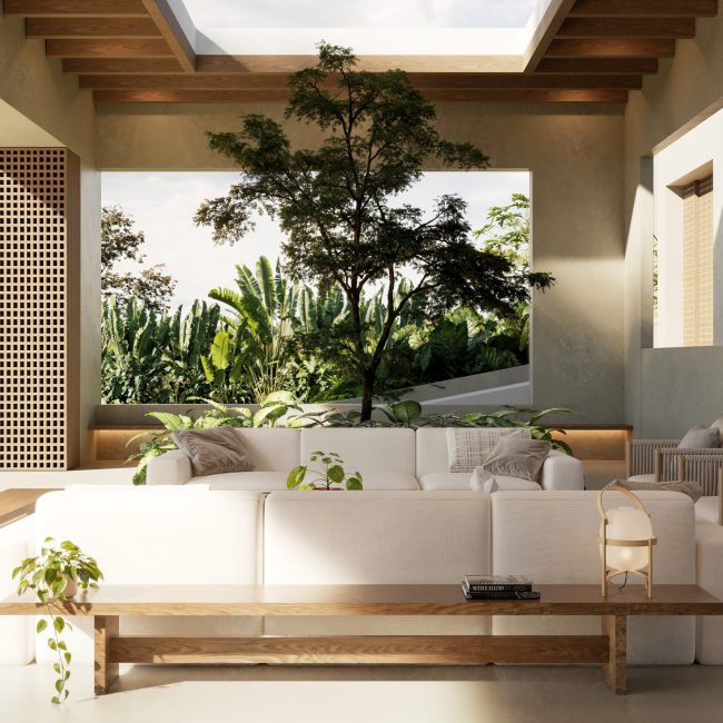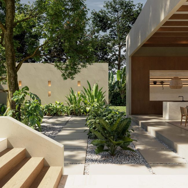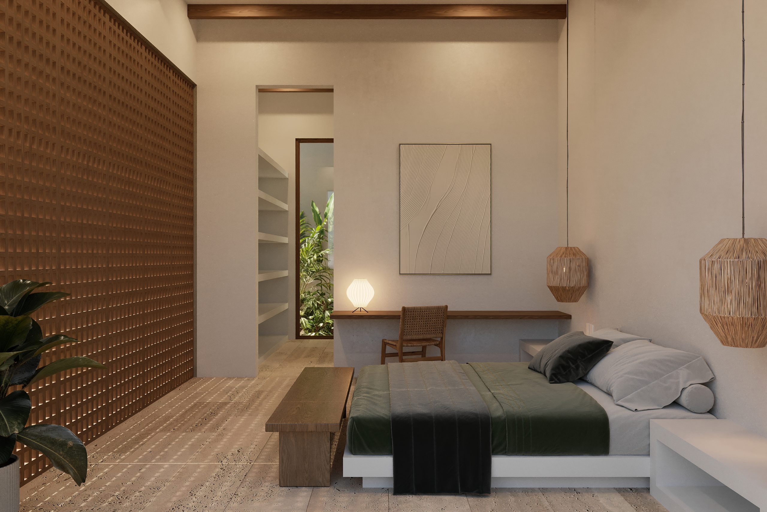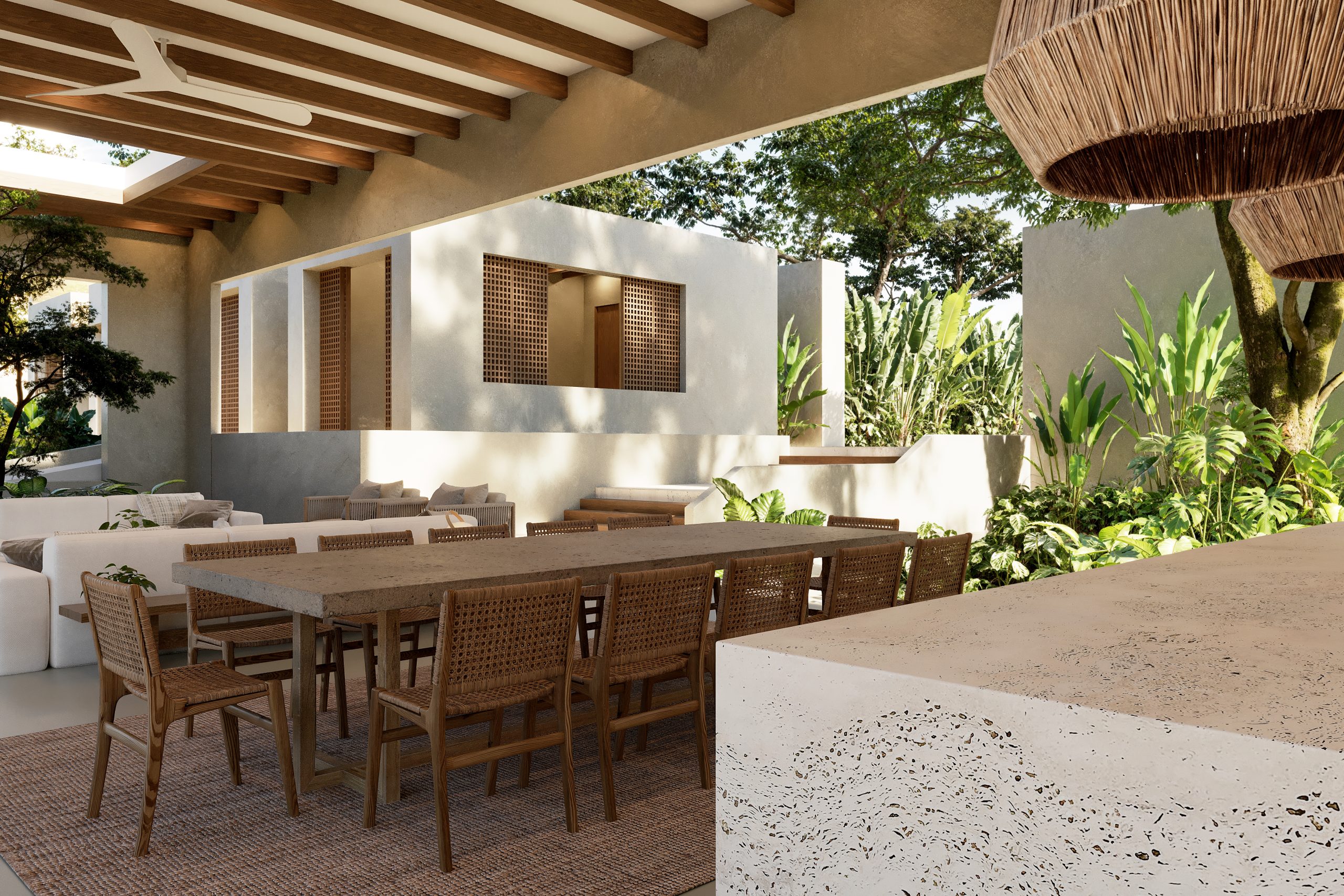 La arquitectura es limpia y minimalista, donde cada línea tiene un propósito y cada muro enmarca el paisaje. El diseño se compone de volúmenes independientes que se conectan a través de senderos abiertos, permitiendo que la vegetación se integre con la vida diaria. La materialidad, compuesta por tonos tierra, texturas naturales y acabados en piedra, madera y fibras naturales, refuerza la sensación de serenidad y calidez.