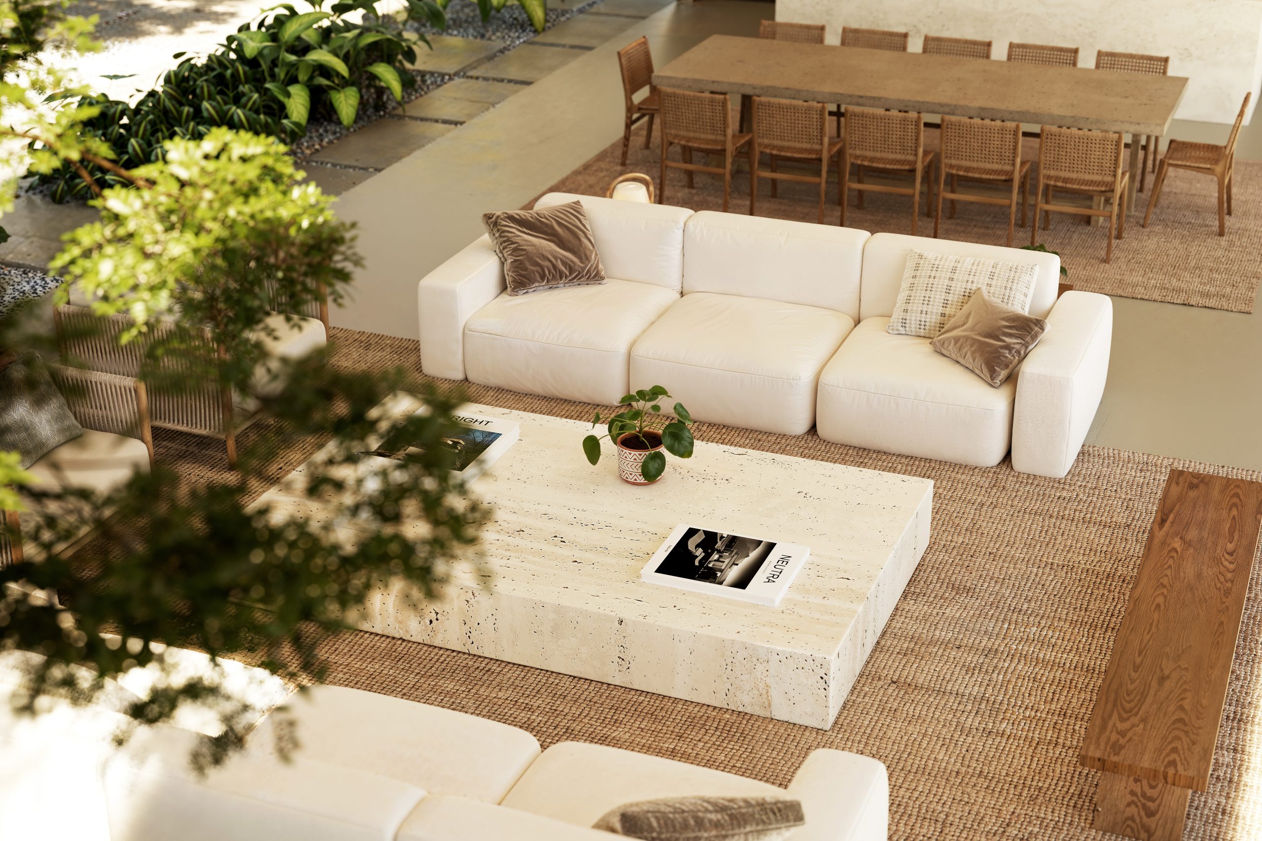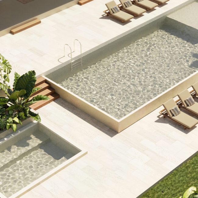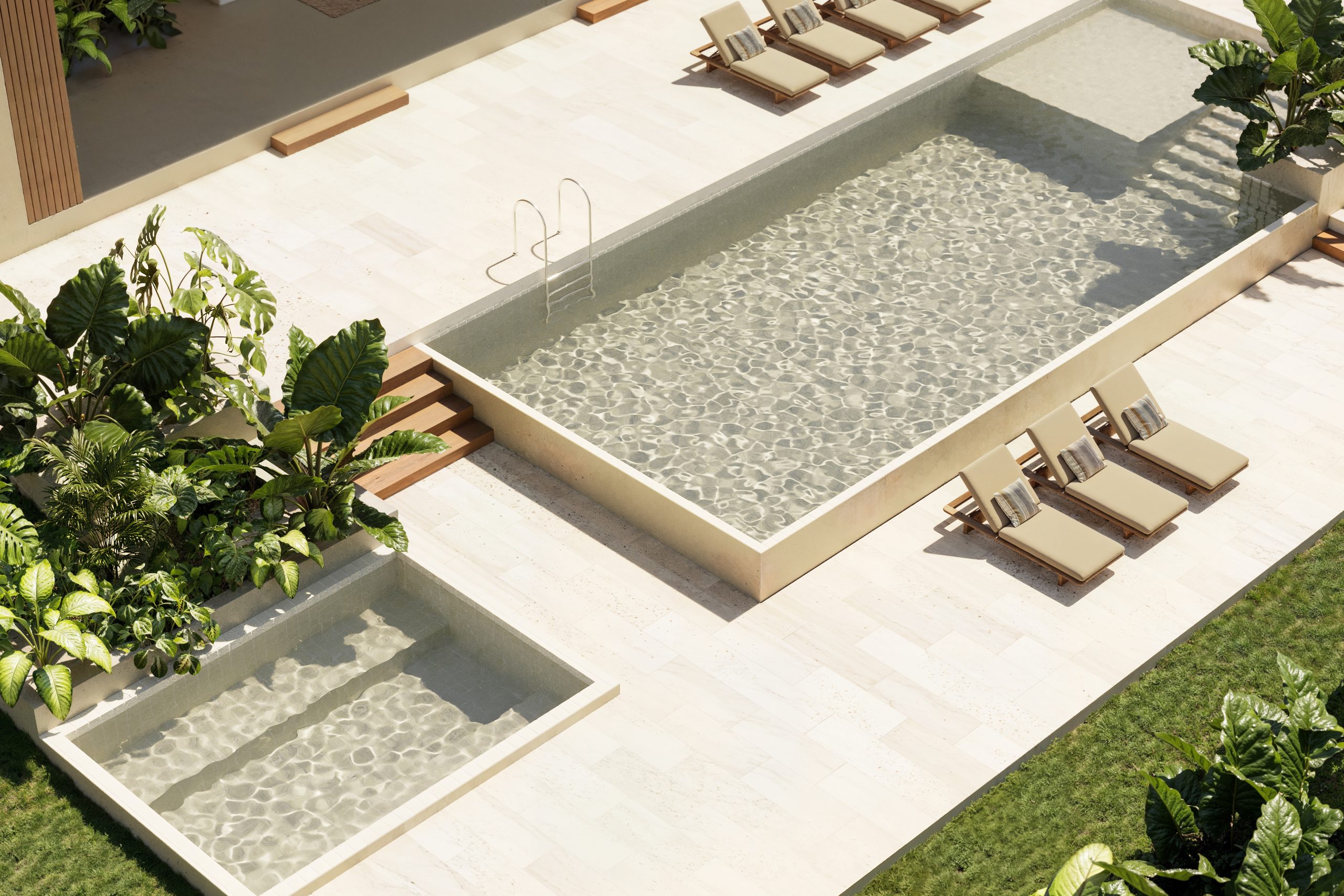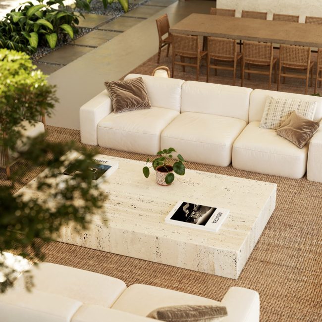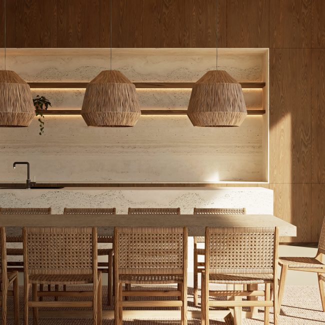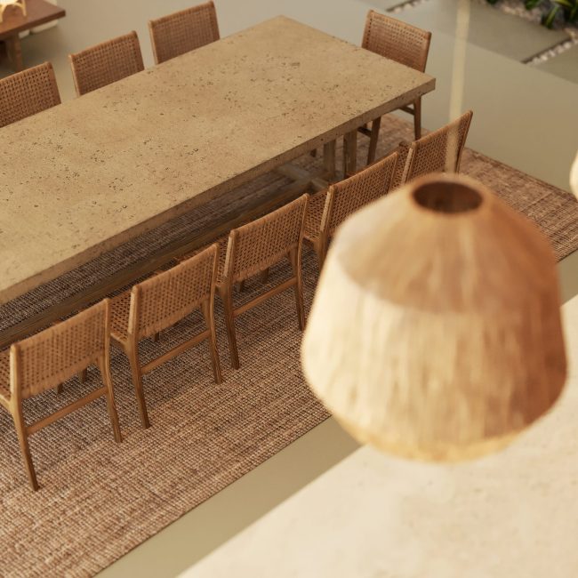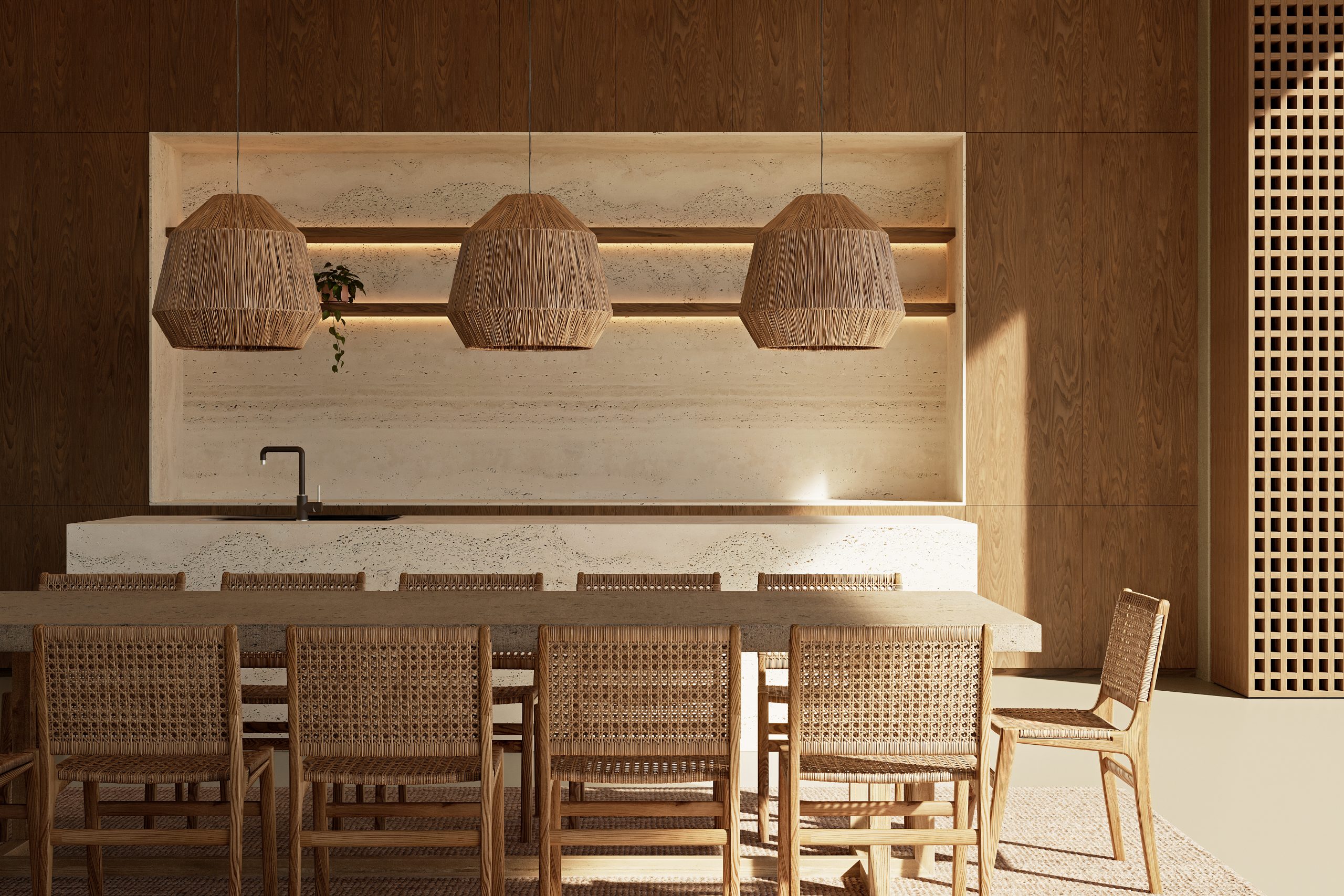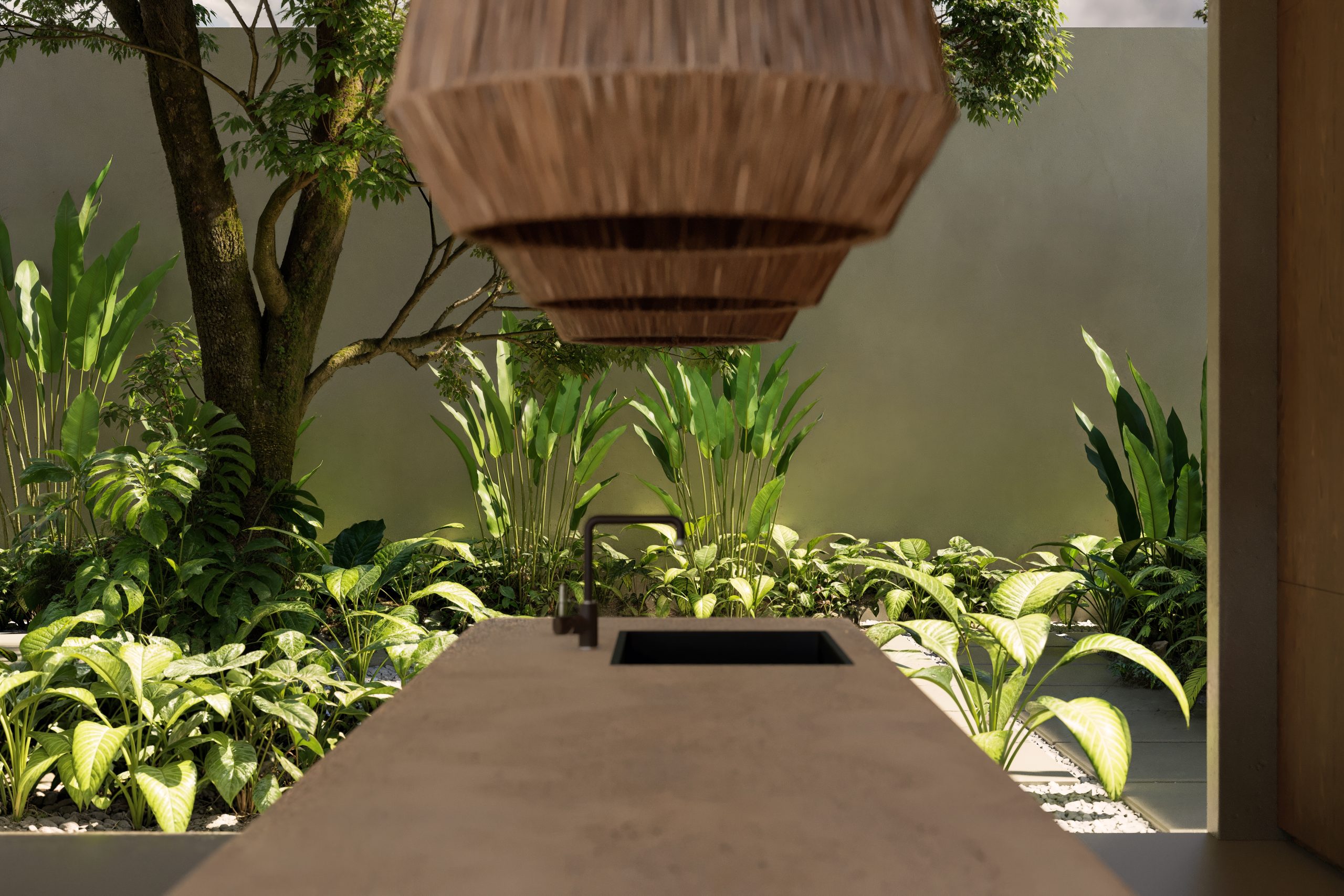 La arquitectura es limpia y minimalista, donde cada línea tiene un propósito y cada muro enmarca el paisaje. El diseño se compone de volúmenes independientes que se conectan a través de senderos abiertos, permitiendo que la vegetación se integre con la vida diaria. La materialidad, compuesta por tonos tierra, texturas naturales y acabados en piedra, madera y fibras naturales, refuerza la sensación de serenidad y calidez.