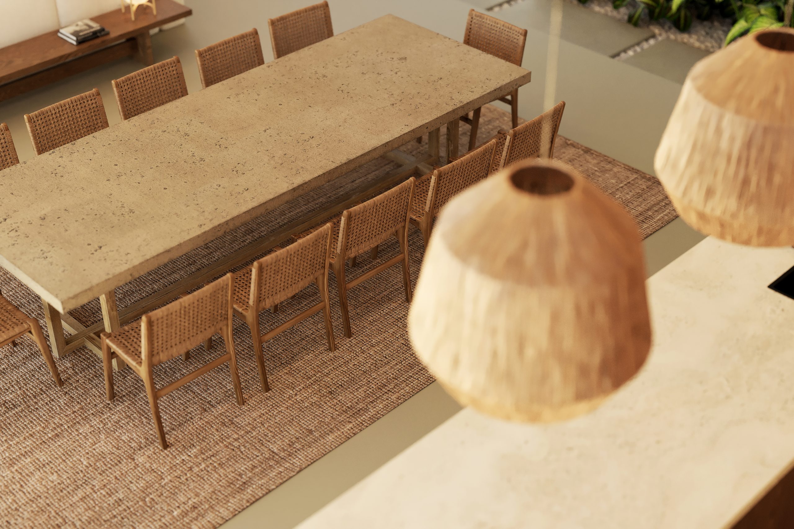 Este proyecto nace de una premisa clara: construir una casa que se adapte al clima cálido, que respire con el paisaje y que genere una conexión profunda con su entorno natural. La volumetría de la casa se desarrolló a partir de las condiciones del lugar. Sus fachadas más extensas se esconden del sol directo y, en cambio, se abren hacia los vientos predominantes para favorecer la ventilación cruzada y mantener una temperatura interior agradable sin recurrir a sistemas mecánicos.