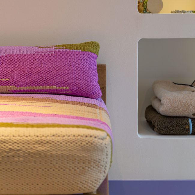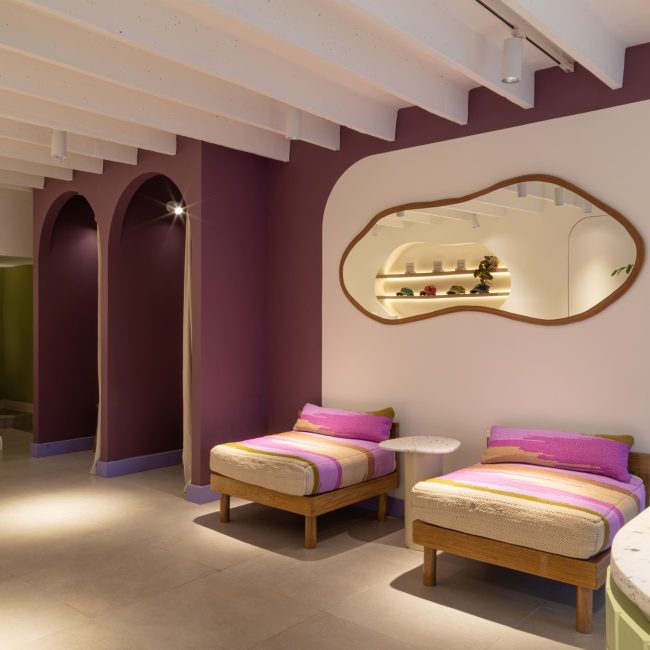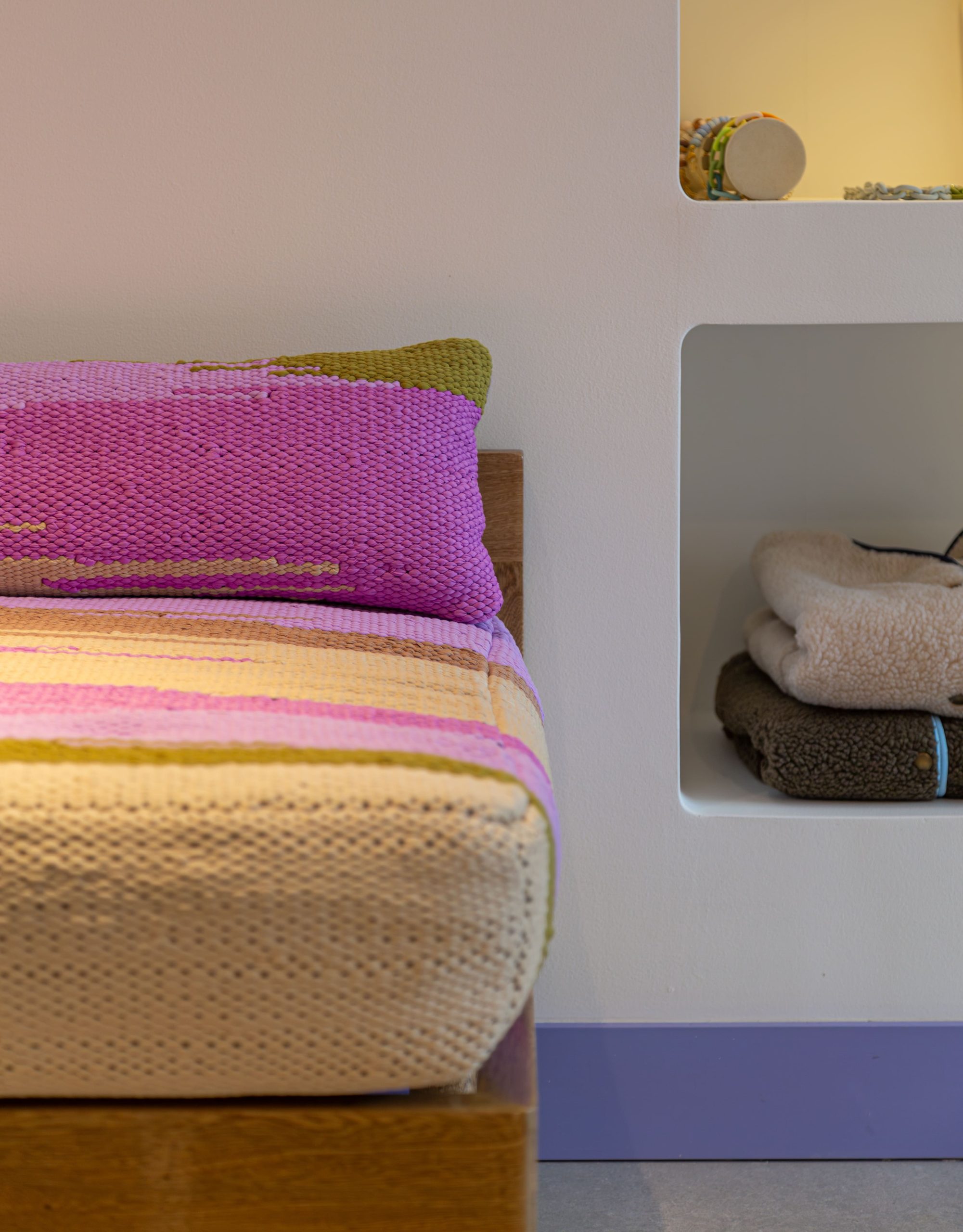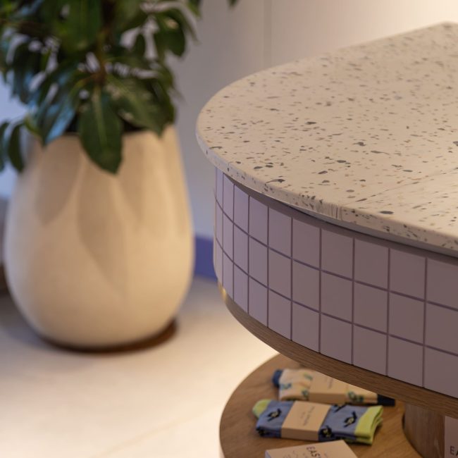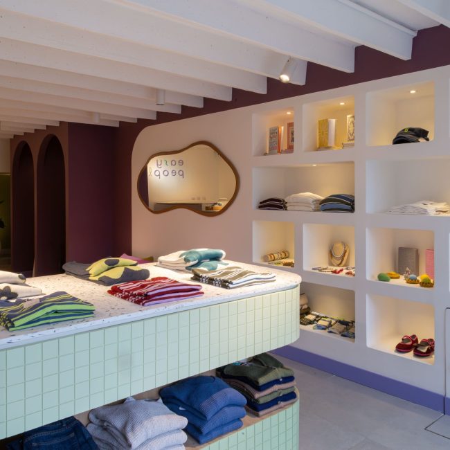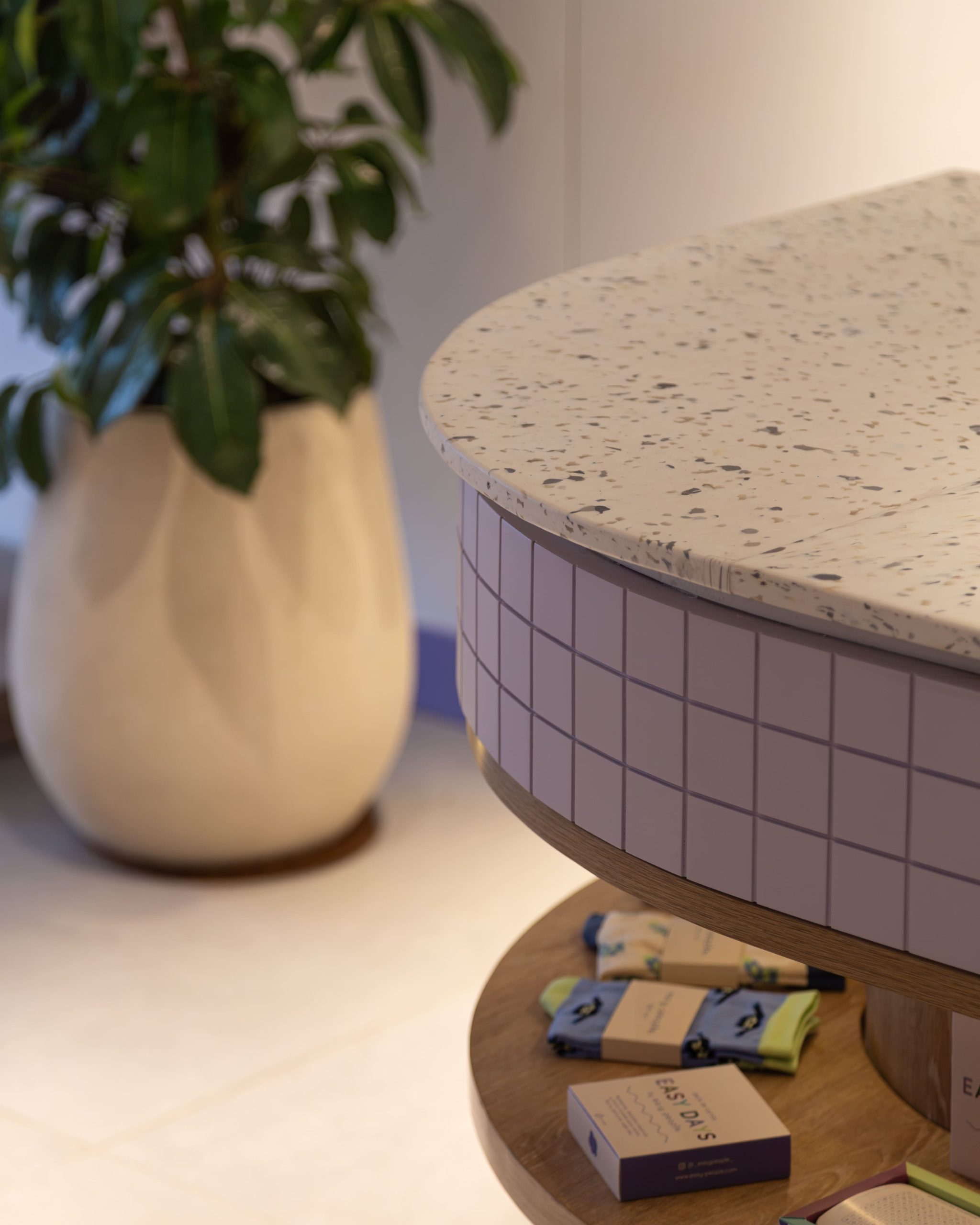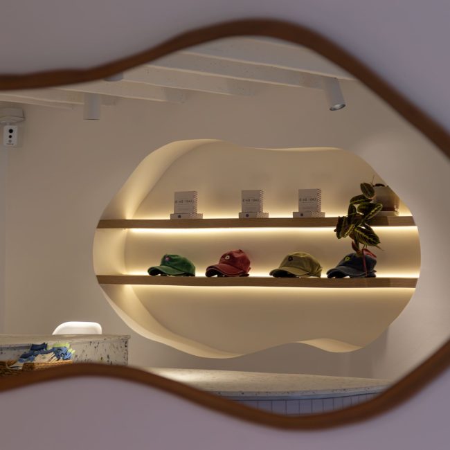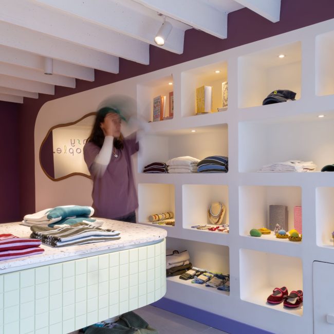 La tienda fue pensada como un lugar amable y cercano, donde los colores suaves, las formas redondeadas y los detalles gráficos generan una atmósfera lúdica y acogedora. Los muebles —diseñados a medida— combinan funcionalidad con carácter, integrándose a una paleta cromática que transmite calma y personalidad a partes iguales. Todo el espacio está organizado para favorecer el recorrido y la interacción, desde el ingreso hasta las zonas de exhibición, el punto de pago y los rincones más contemplativos.