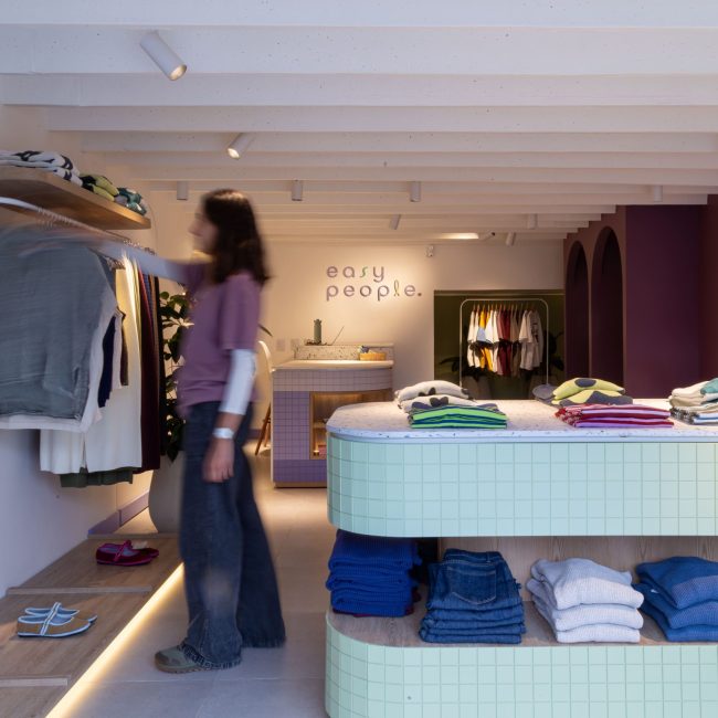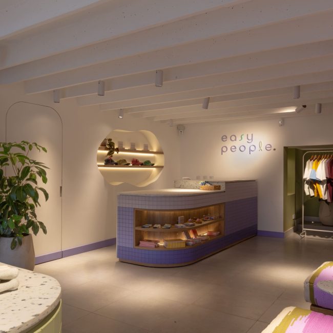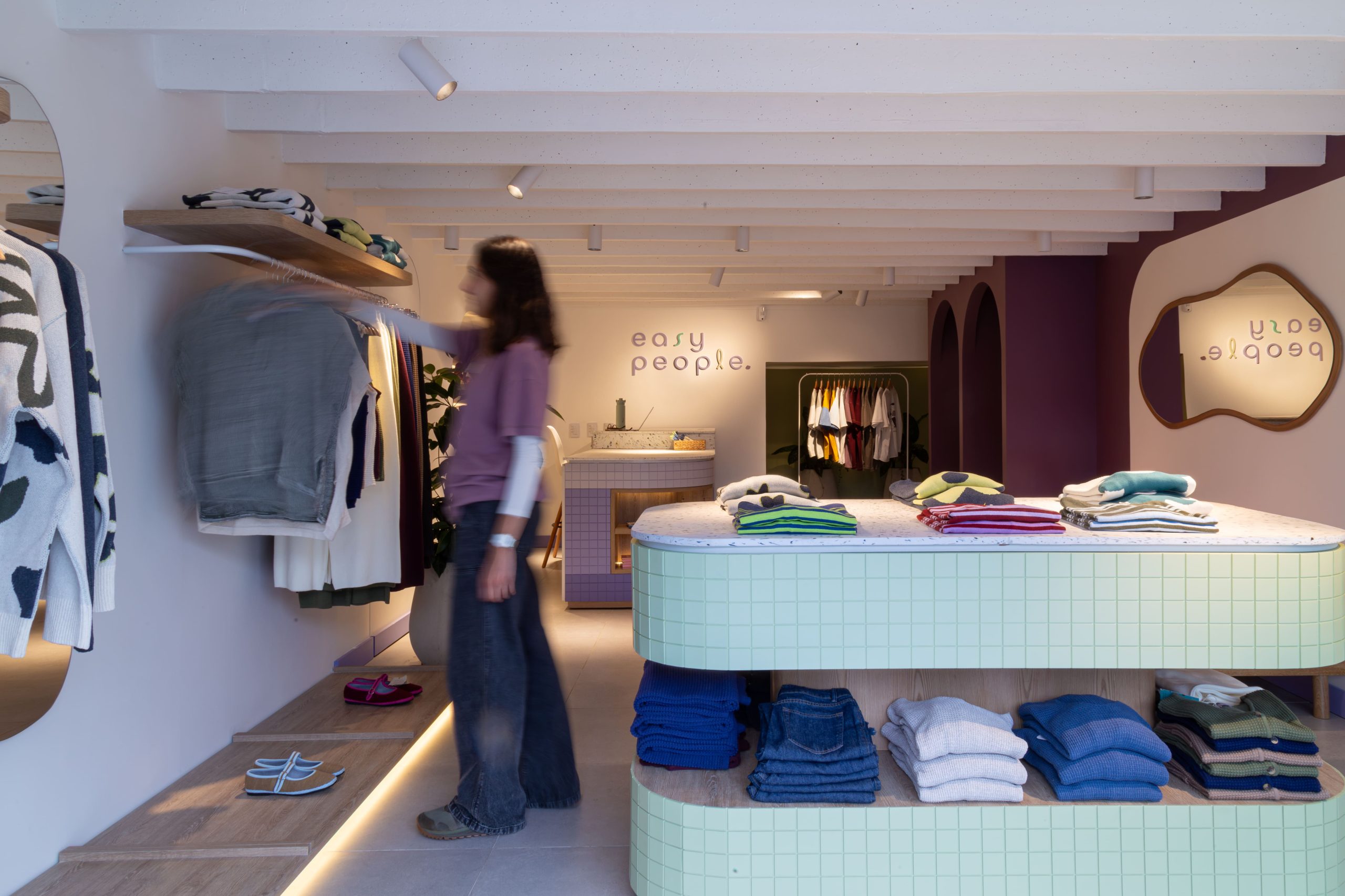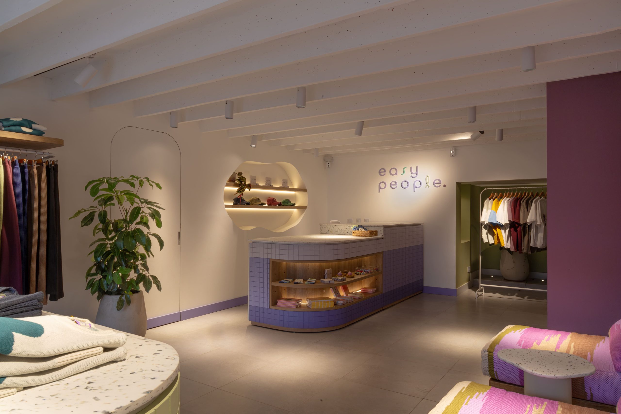 En este proyecto diseñamos la primera tienda física de easy people, una marca que se caracteriza por su autenticidad, su lenguaje descomplicado y su conexión emocional con una comunidad que valora lo simple, lo cómodo y lo feliz. El reto era claro: llevar ese universo de marca al espacio físico, creando una experiencia que se sintiera tan especial y relajada como el mensaje que comunican en sus redes y productos.