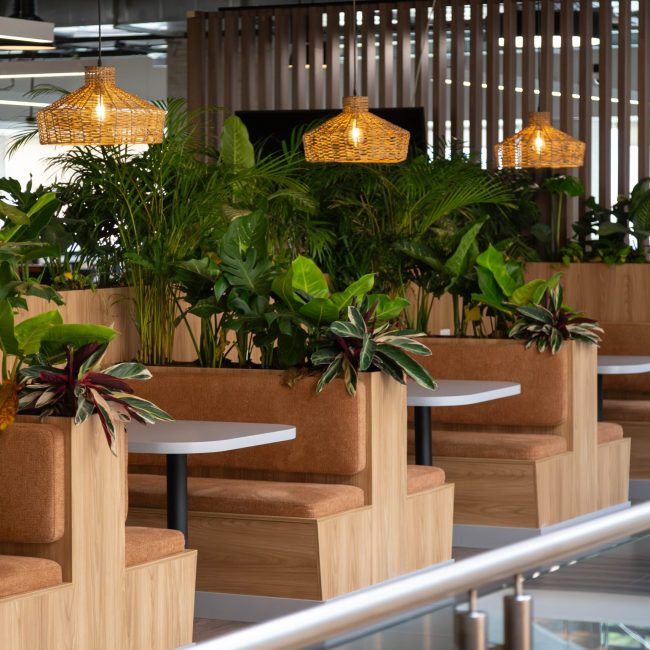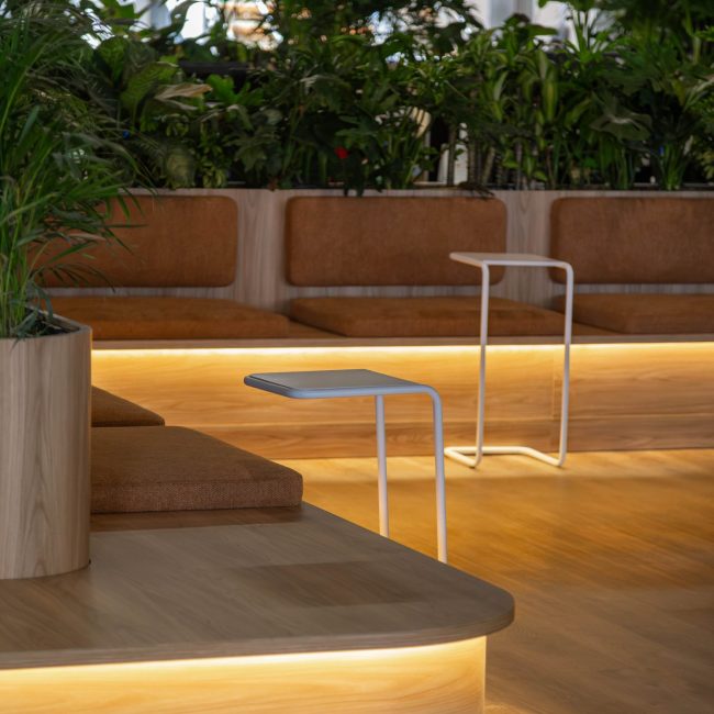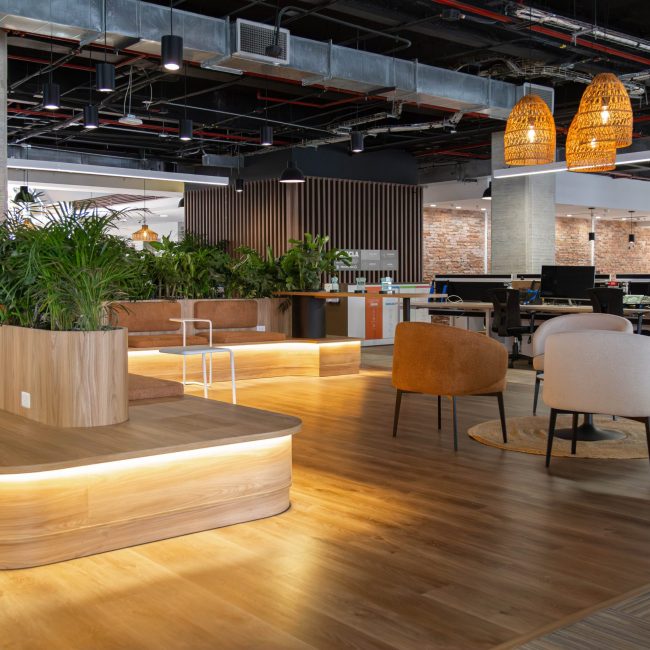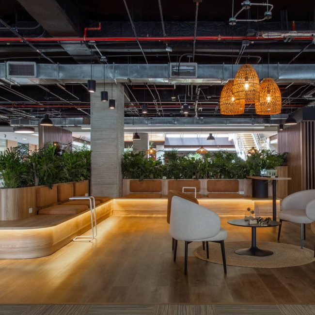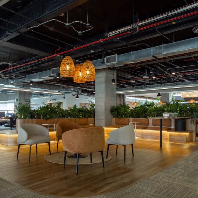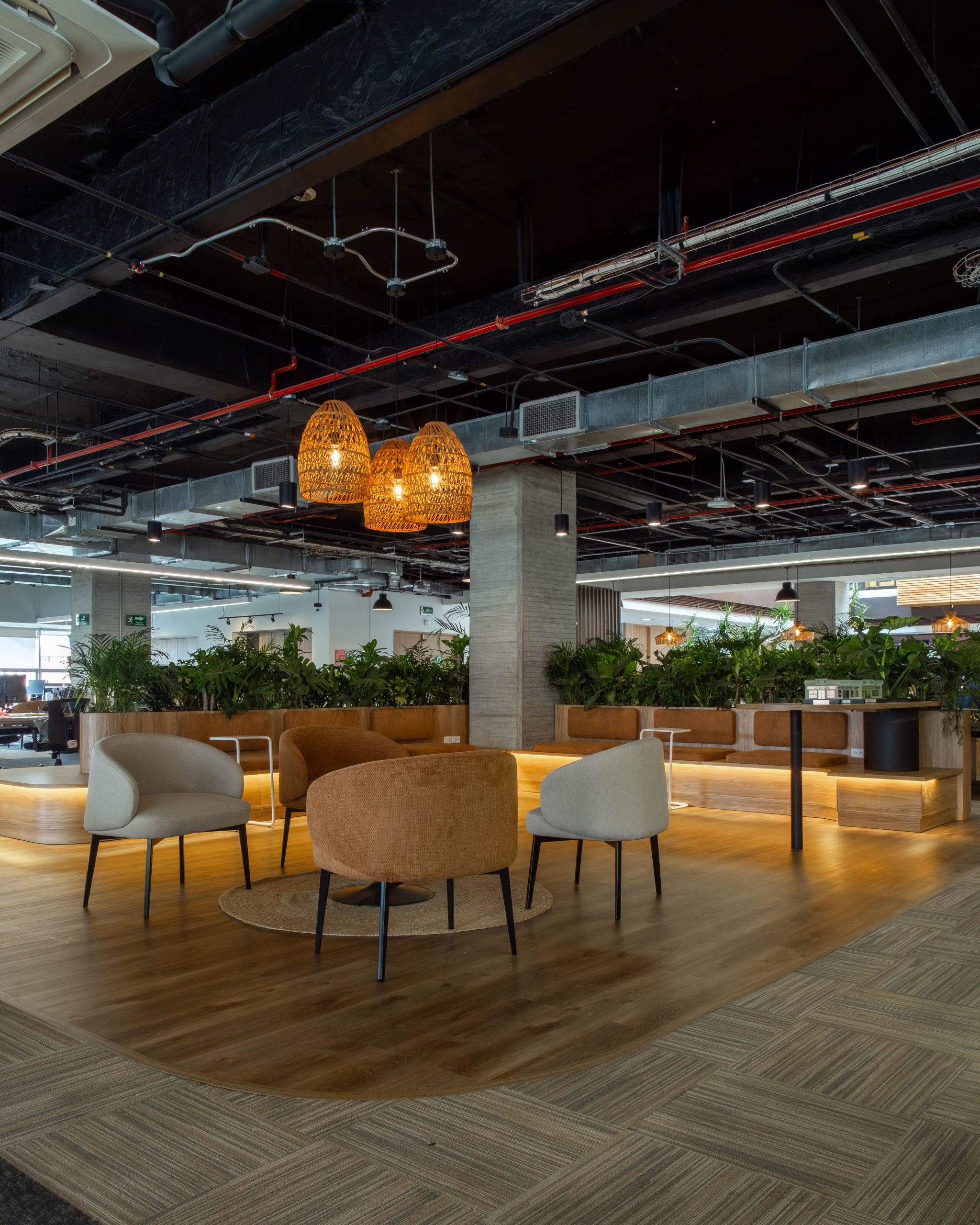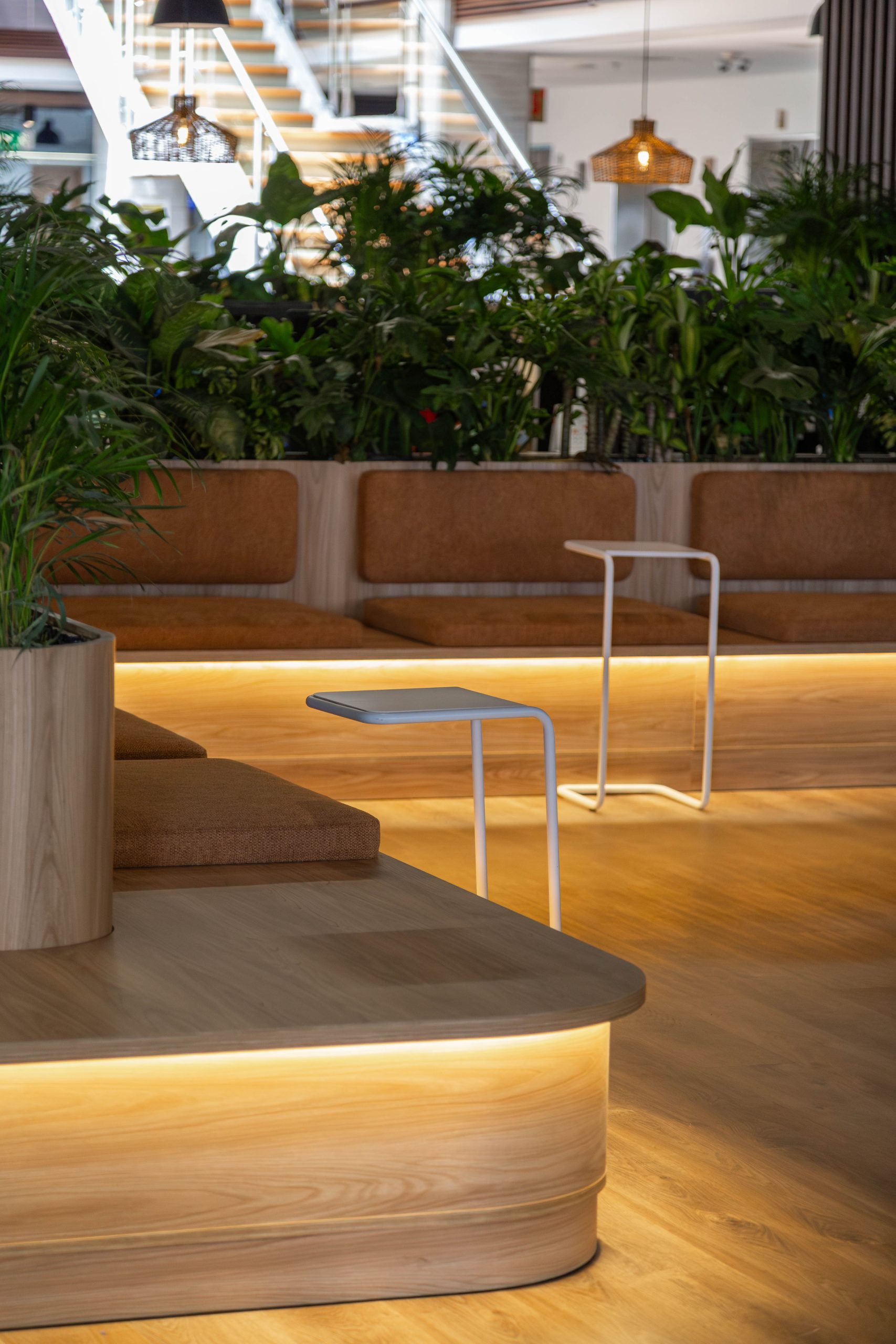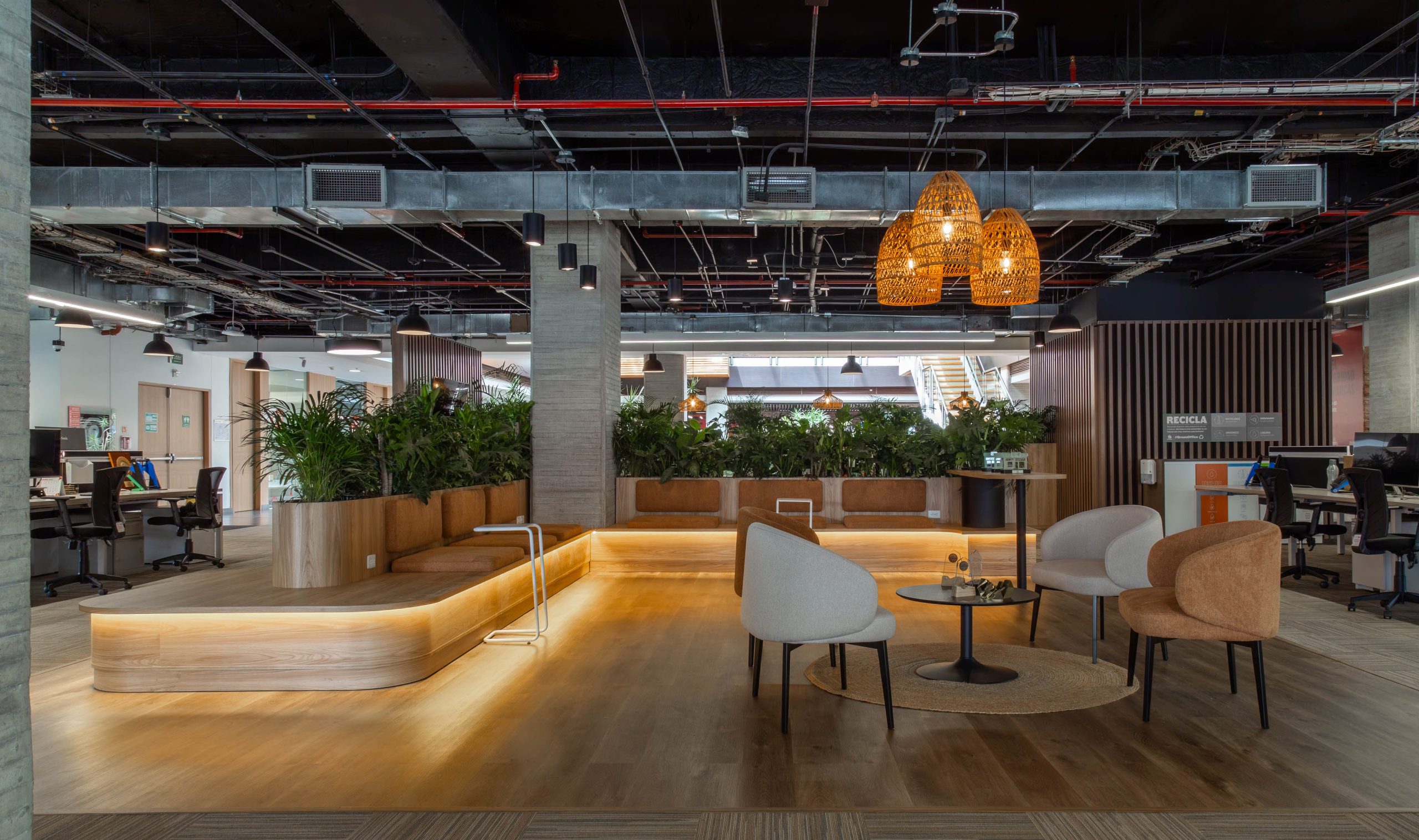 El diseño apuesta por la flexibilidad y la diversidad de ambientes. Bancas integradas con iluminación cálida, rincones de trabajo alternativo con mobiliario cómodo y una paleta de colores neutros acentuada por tonos tierra invitan a los empleados a cambiar de escenario según sus necesidades. La incorporación de lámparas en fibras naturales y texturas suaves aporta cercanía y un carácter humano al espacio corporativo.