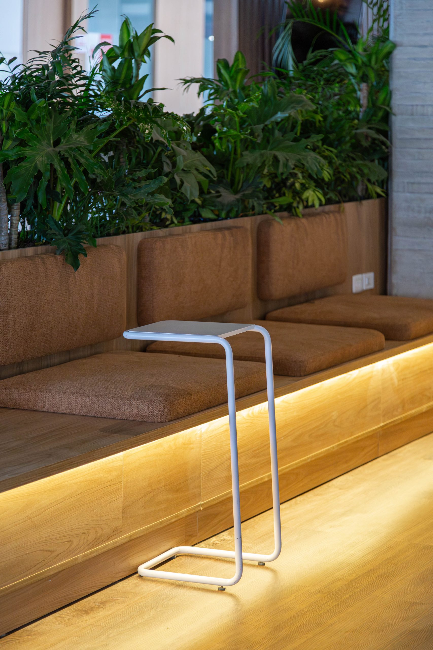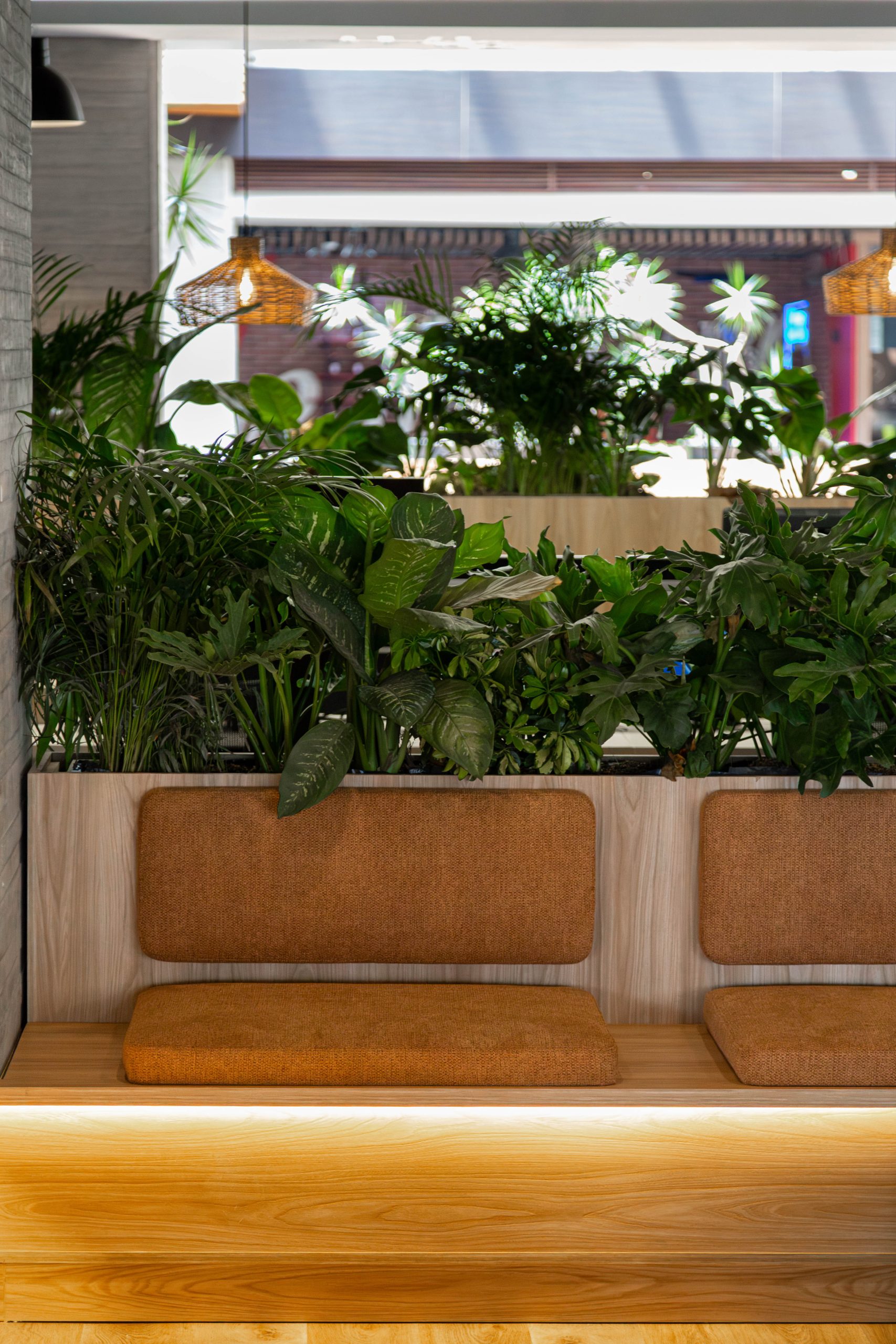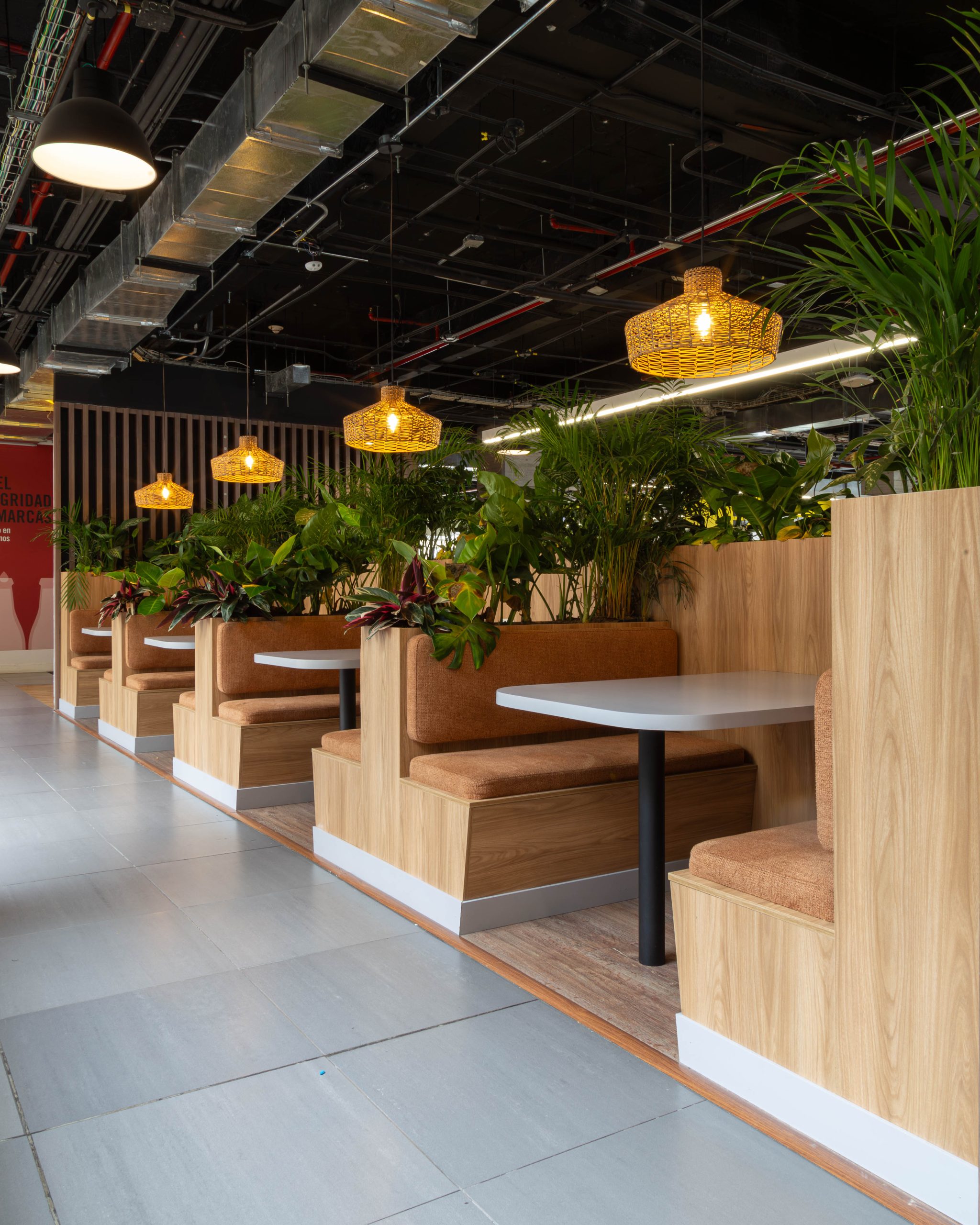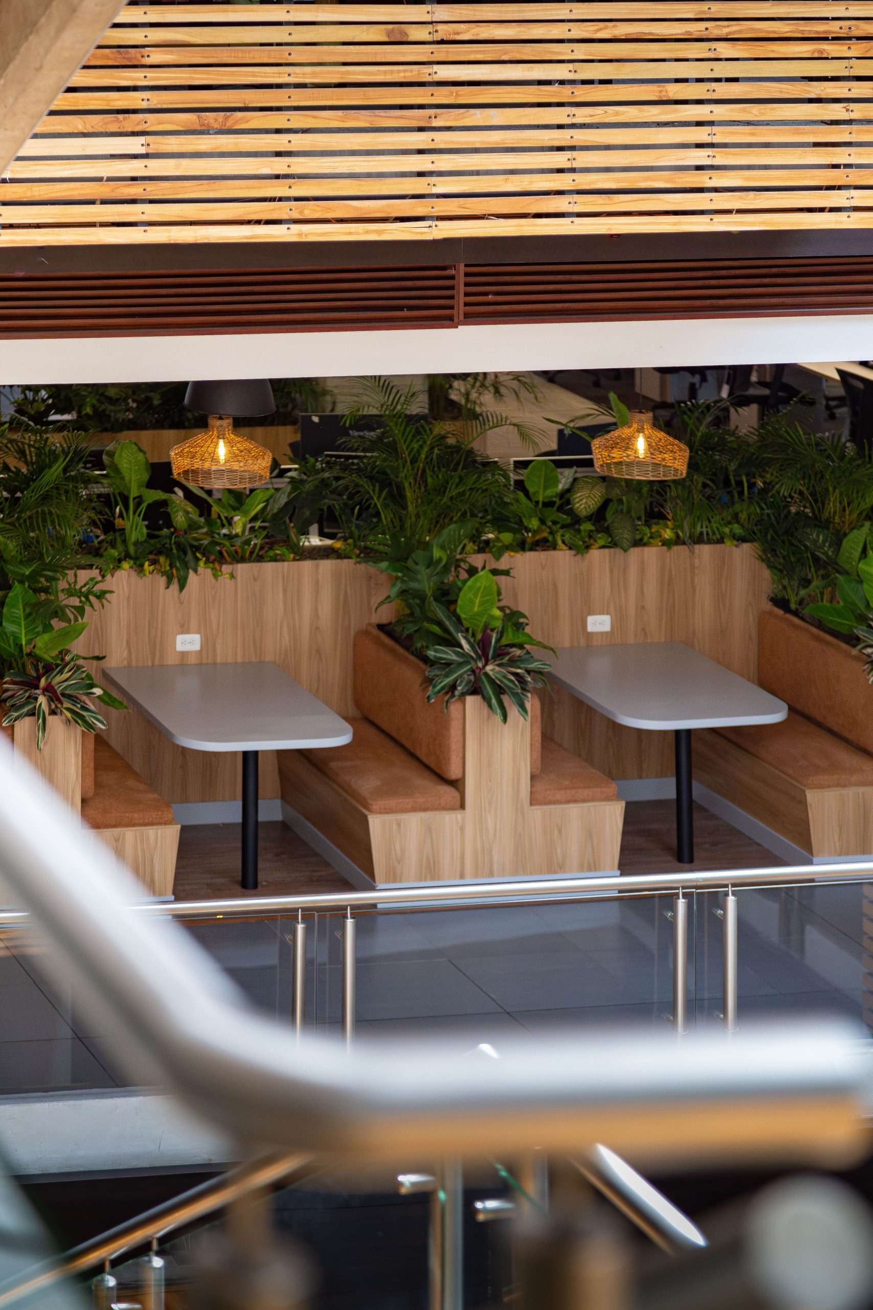 Los materiales juegan un papel fundamental en la propuesta: la calidez de la madera contrasta con la crudeza del concreto visto y los elementos metálicos expuestos en el cielo, logrando un equilibrio entre lo natural y lo industrial. La vegetación se convierte en protagonista, no solo como elemento estético, sino también como un recurso para generar frescura, vitalidad y una mejor calidad ambiental dentro del espacio.