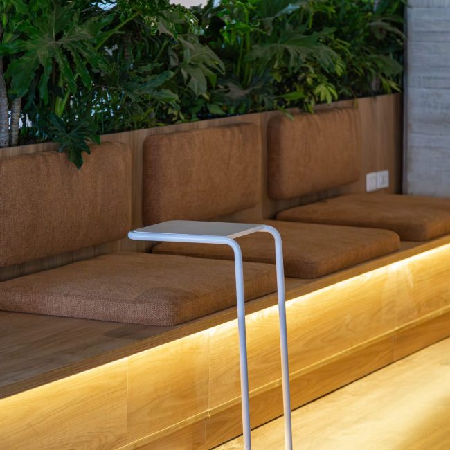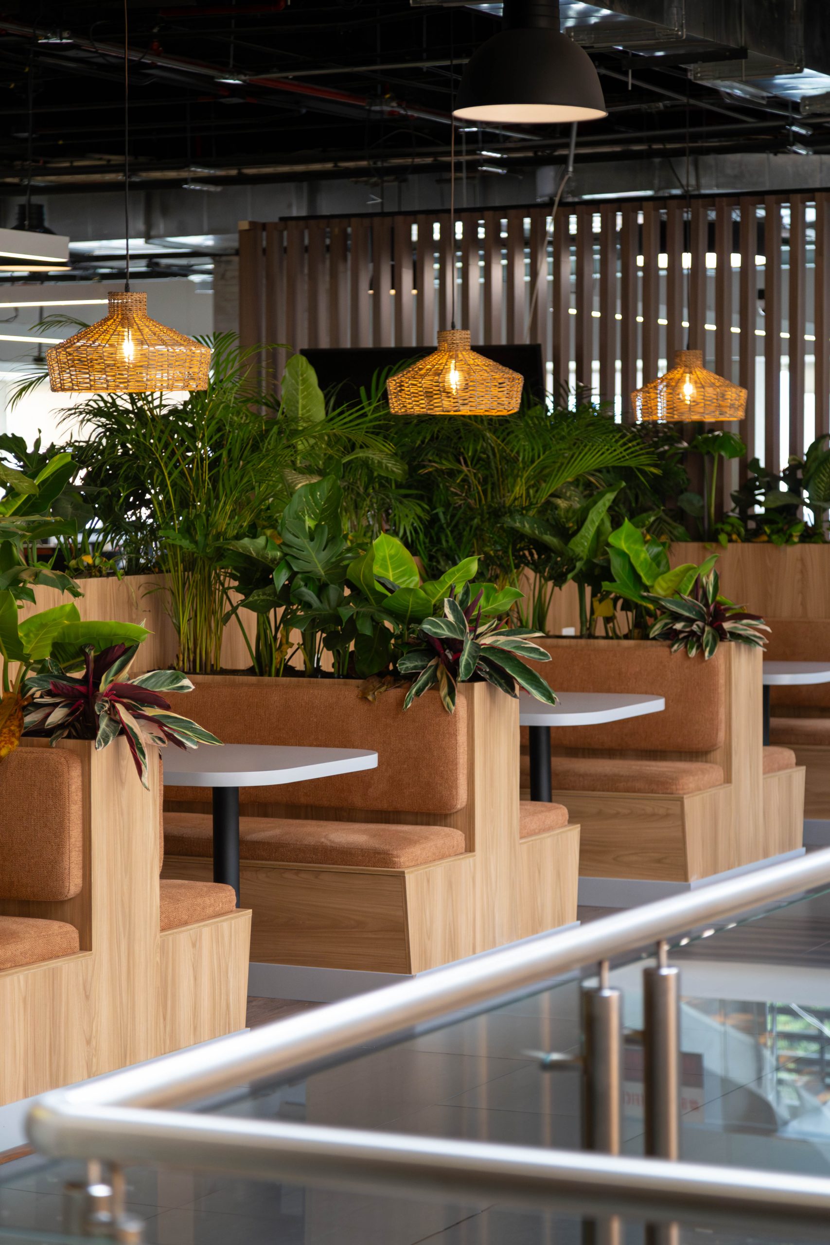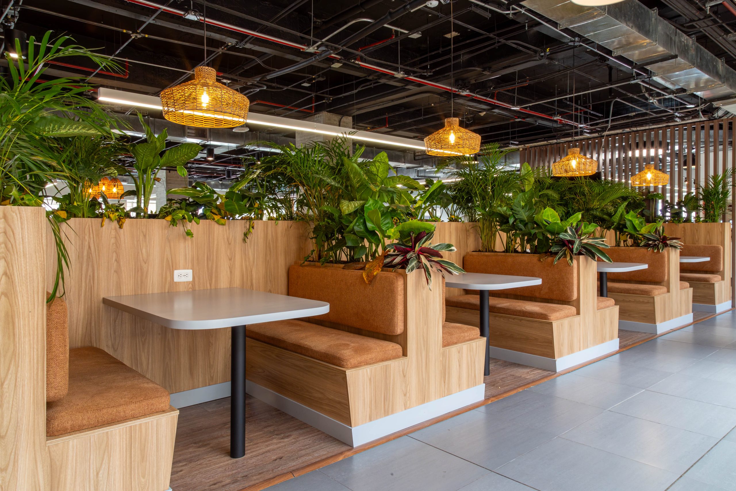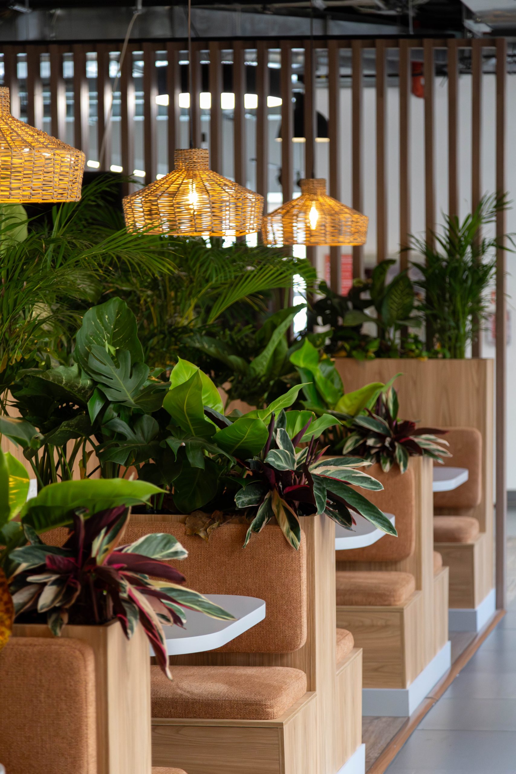 Los materiales juegan un papel fundamental en la propuesta: la calidez de la madera contrasta con la crudeza del concreto visto y los elementos metálicos expuestos en el cielo, logrando un equilibrio entre lo natural y lo industrial. La vegetación se convierte en protagonista, no solo como elemento estético, sino también como un recurso para generar frescura, vitalidad y una mejor calidad ambiental dentro del espacio.