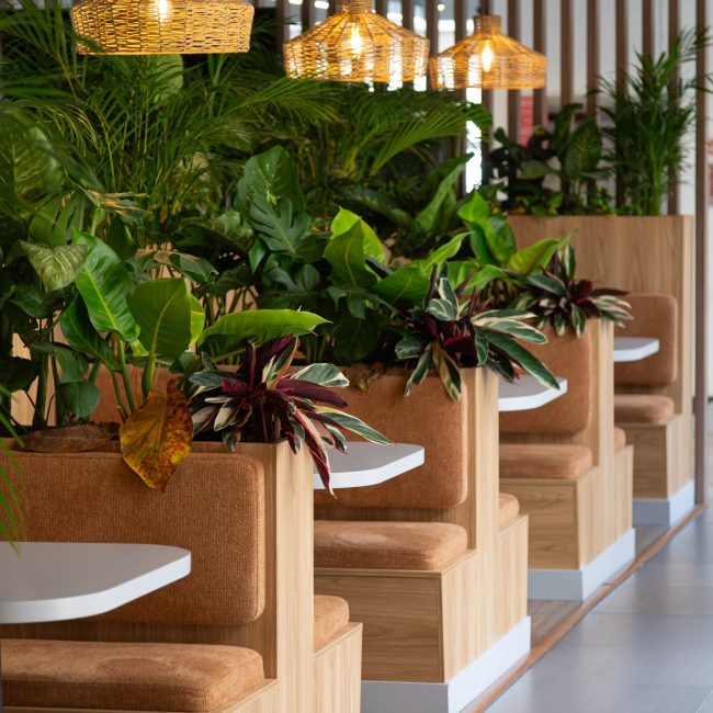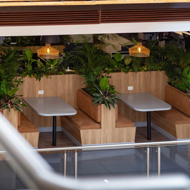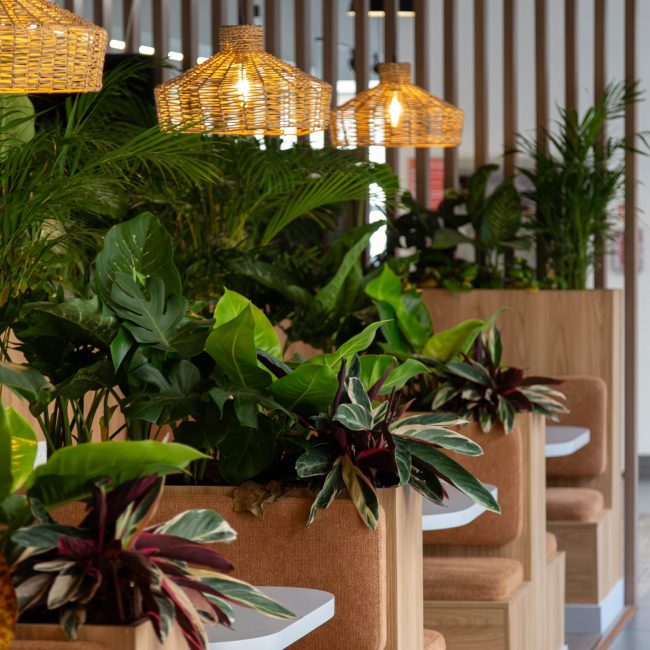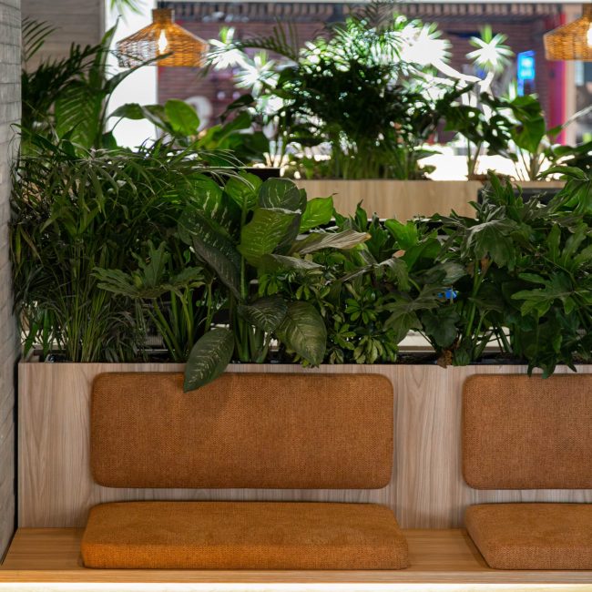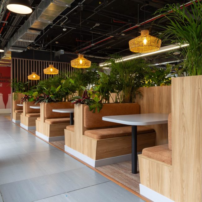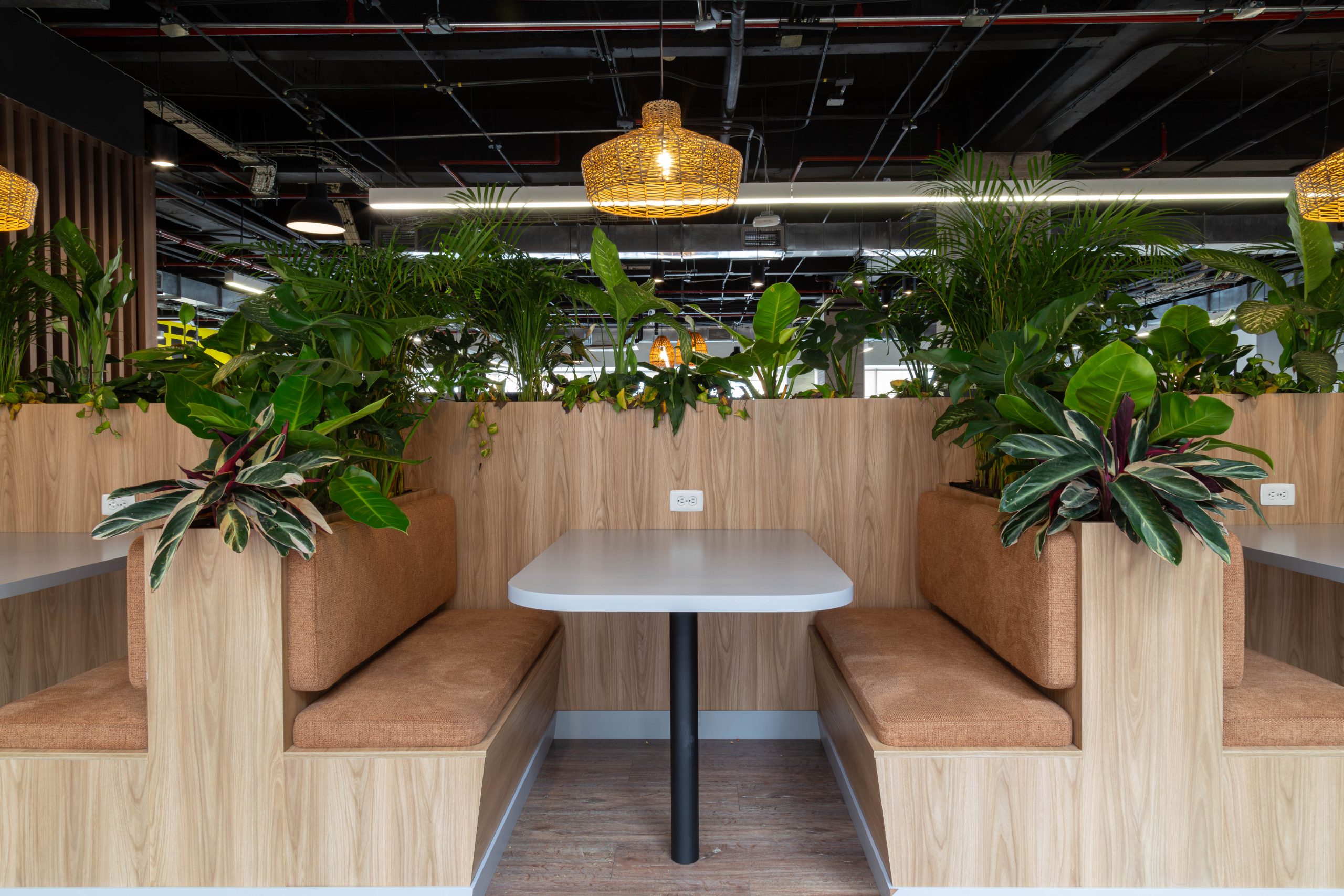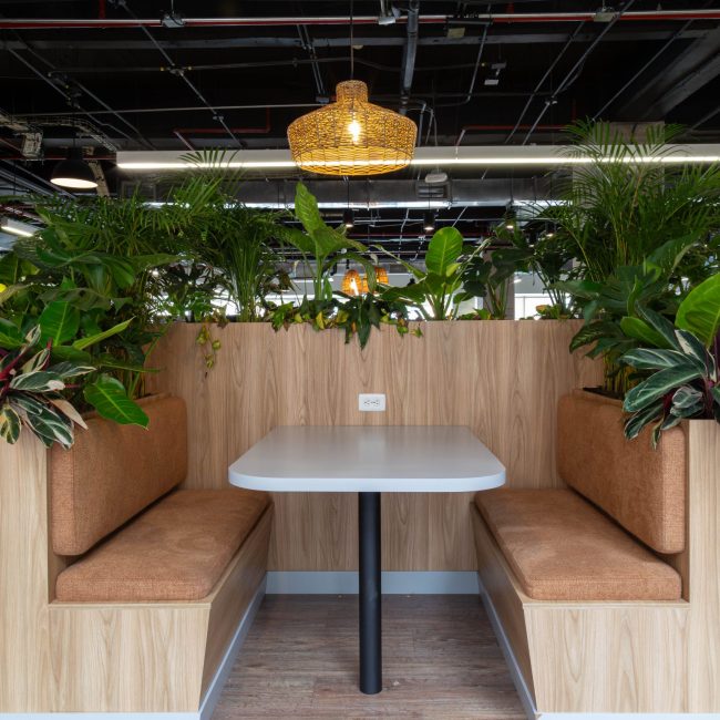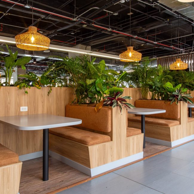 Los materiales juegan un papel fundamental en la propuesta: la calidez de la madera contrasta con la crudeza del concreto visto y los elementos metálicos expuestos en el cielo, logrando un equilibrio entre lo natural y lo industrial. La vegetación se convierte en protagonista, no solo como elemento estético, sino también como un recurso para generar frescura, vitalidad y una mejor calidad ambiental dentro del espacio.