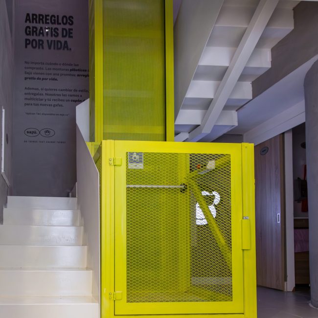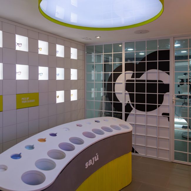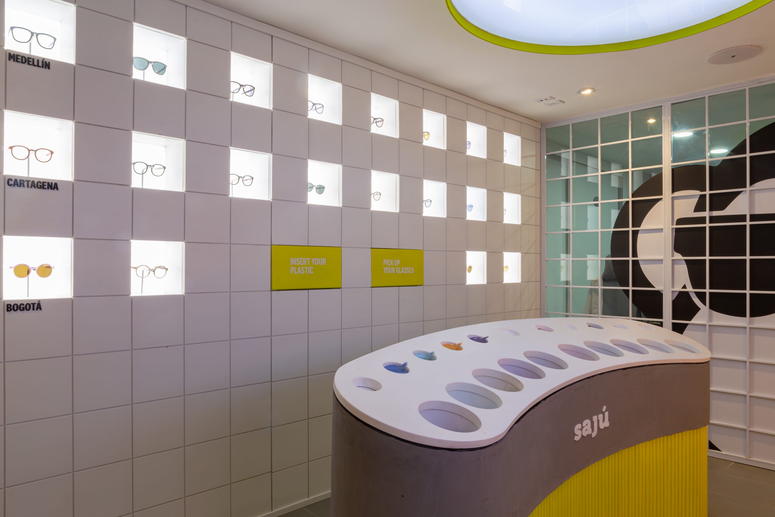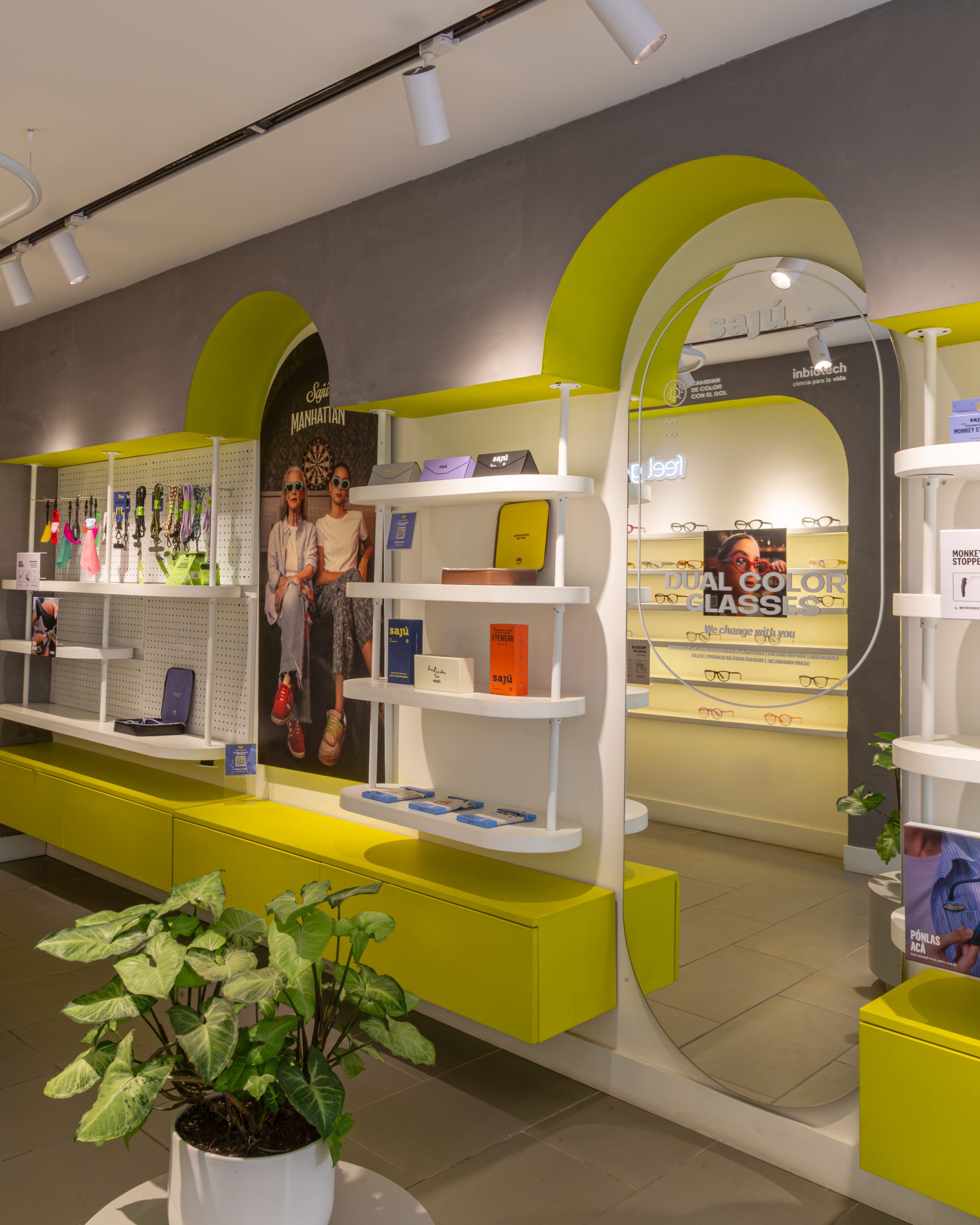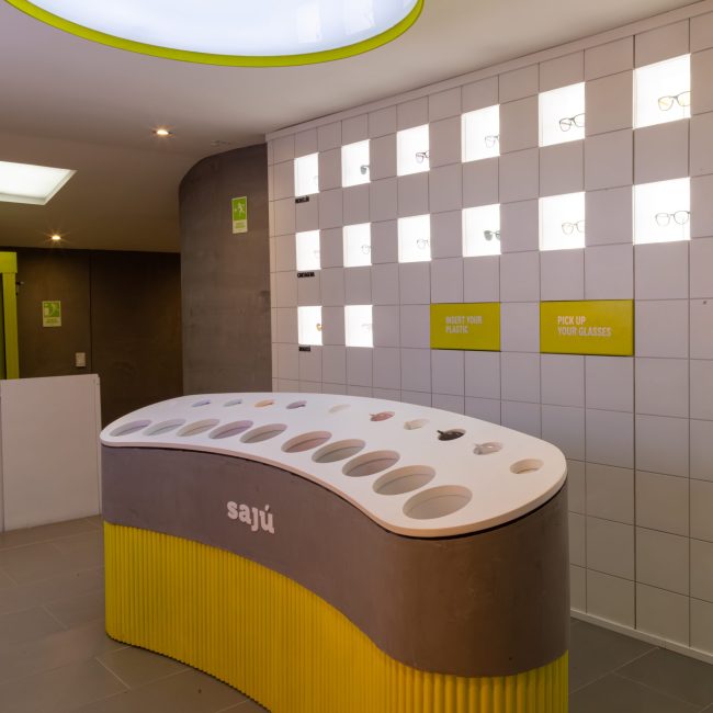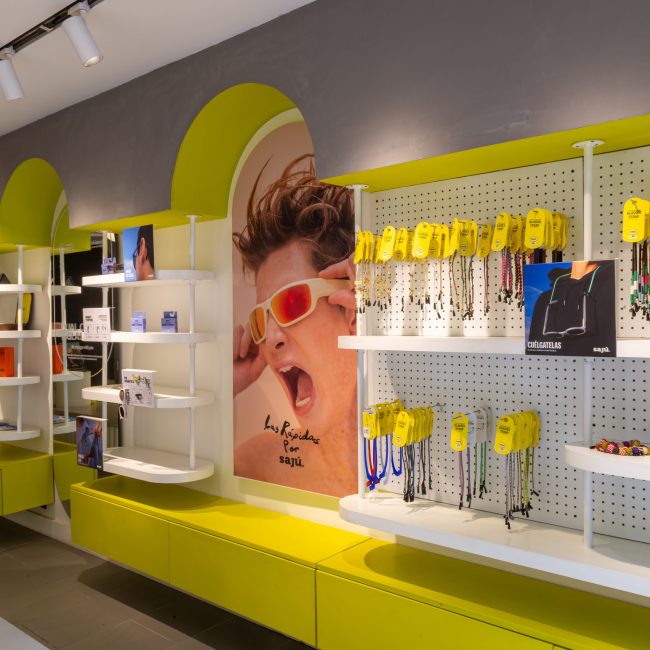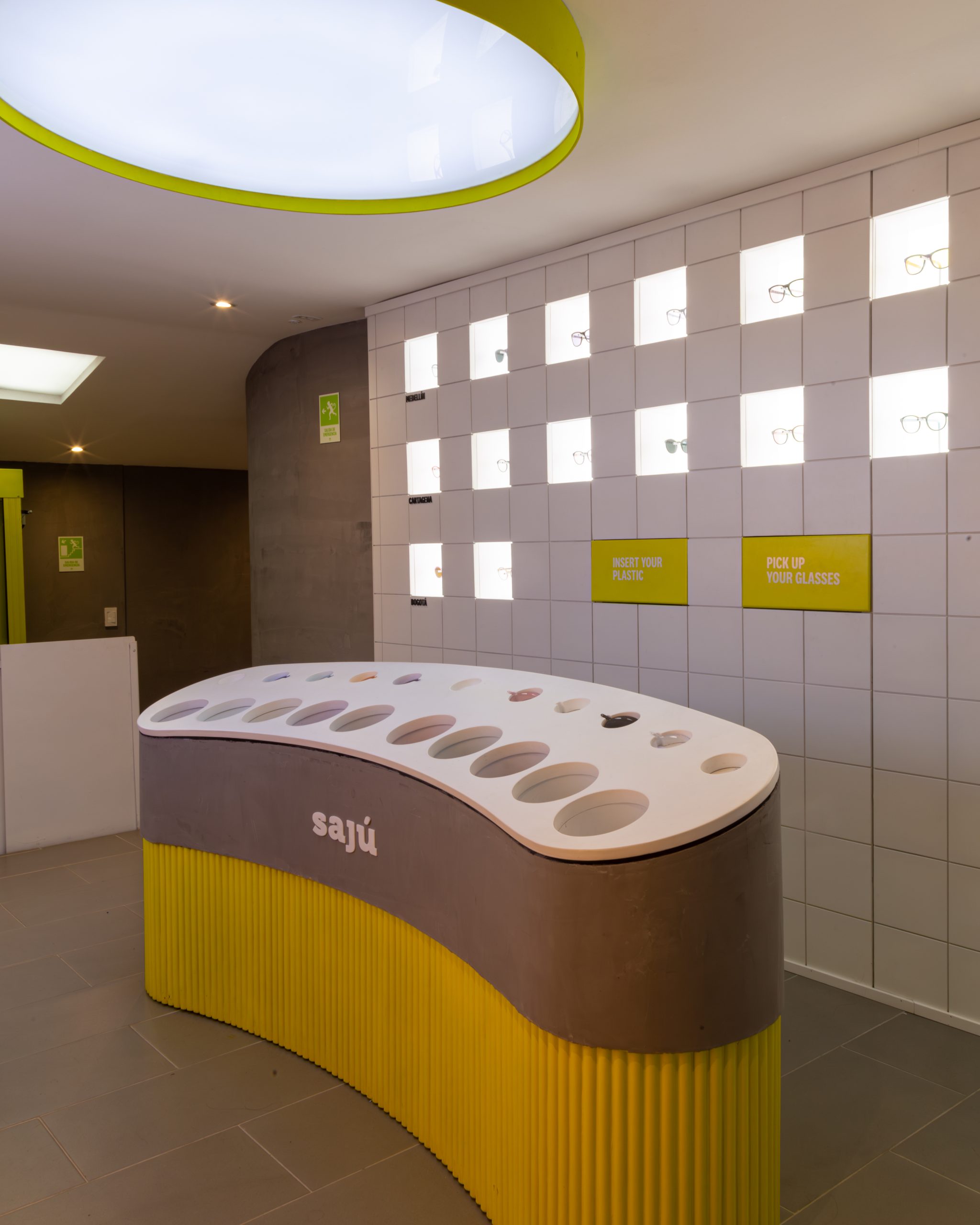 En una de las paredes laterales se encuentra la exhibición de accesorios, mientras que en la otra se exhiben las gafas. En el segundo piso encontramos las monturas especiales, con un mueble diseñado específicamente para resaltar estos productos a través de sencillez e iluminación, mezclado con el “Sajú Experience” que le permite a los usuarios escoger diferentes marcos, colores y lentes para tener un producto único. En el centro contamos con un elemento de descanso para los acompañantes de los compradores. El diseño del local está basado principalmente en microcemento neutro, que permite que los productos brillen, con acentos de color amarillos característicos de la marca, para asi diferenciar el formato de tienda, creando un ambiente sobrio y cool.