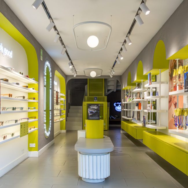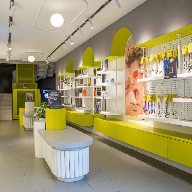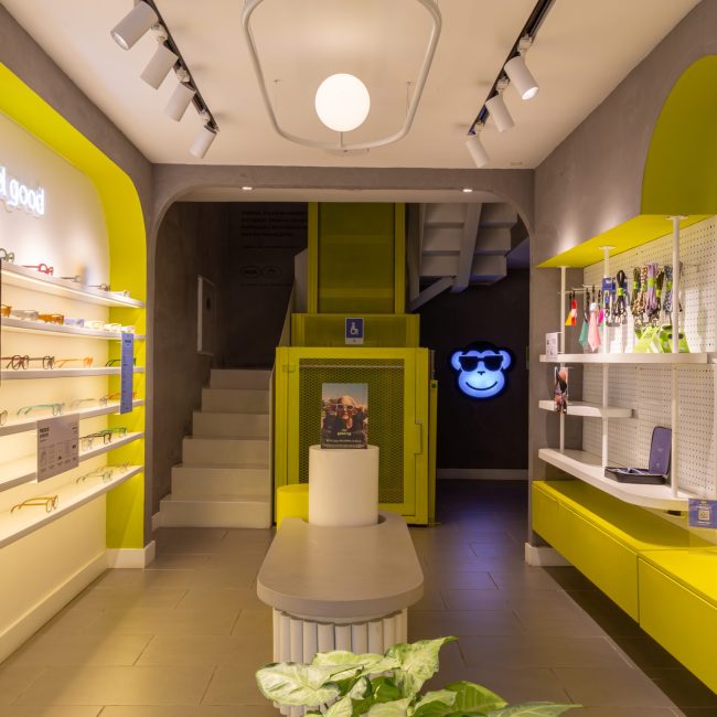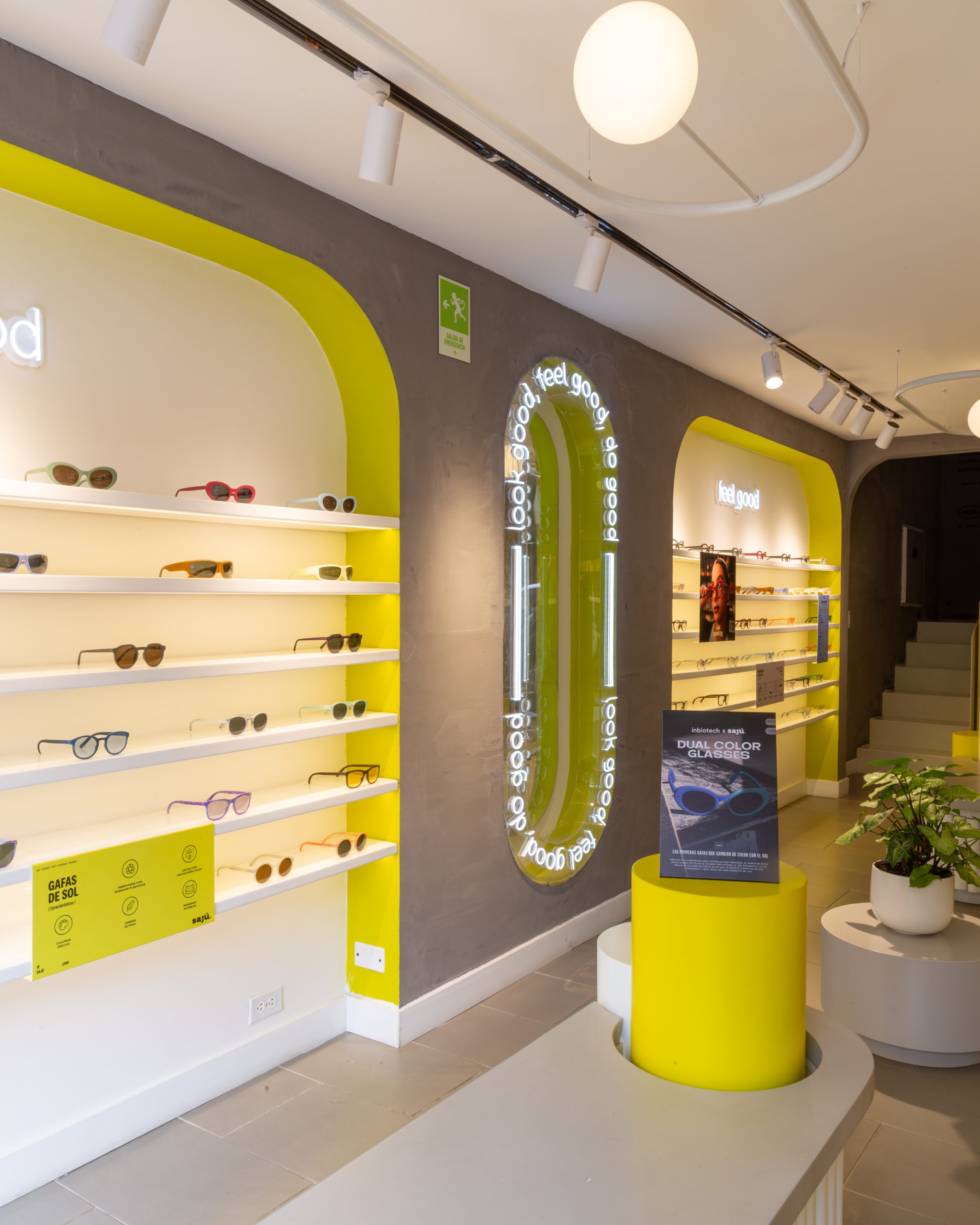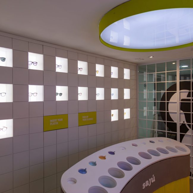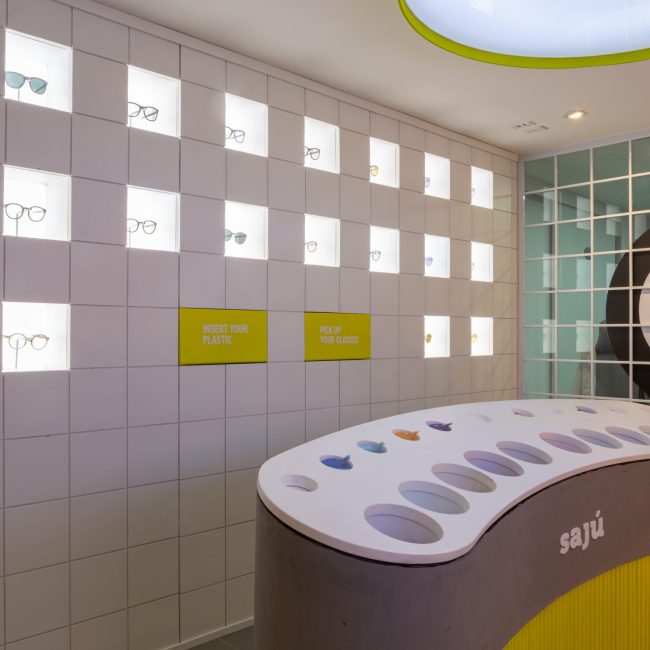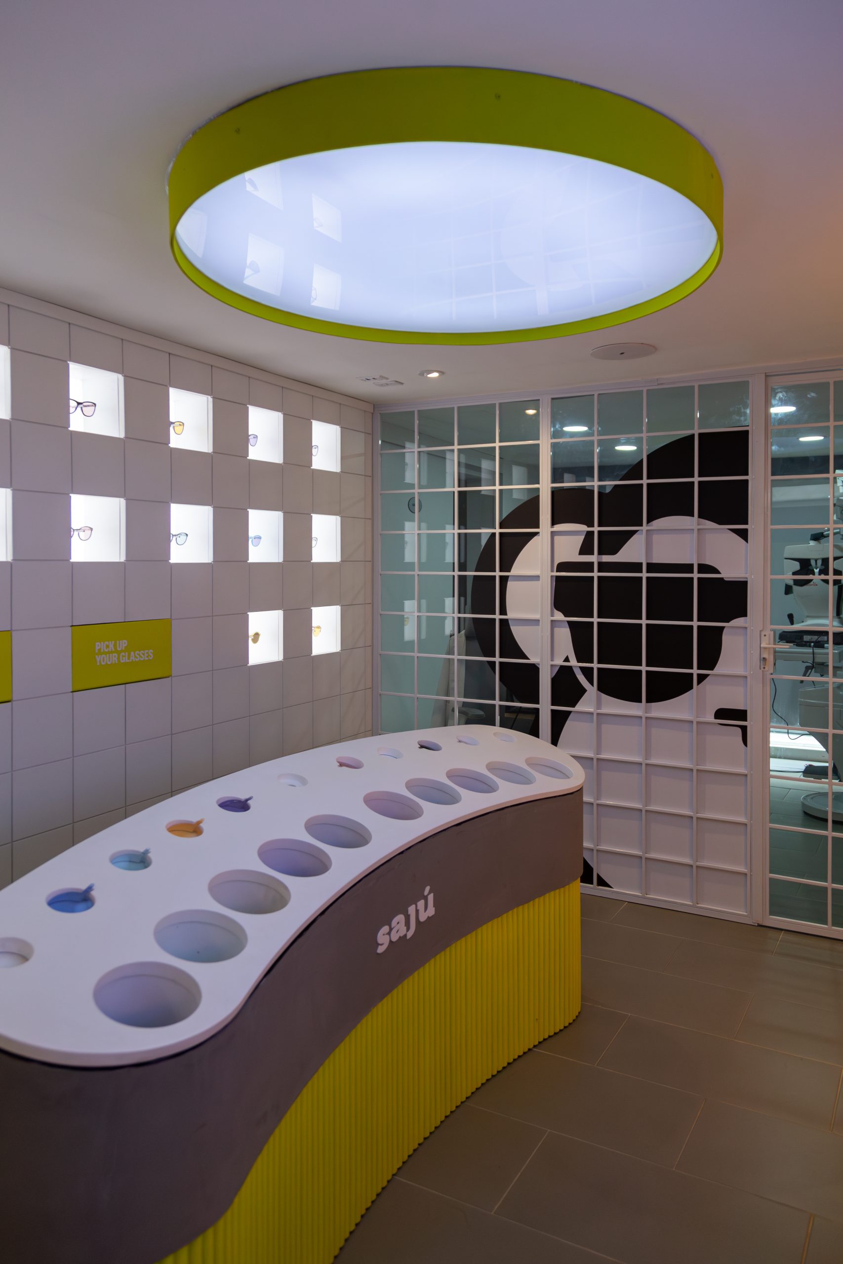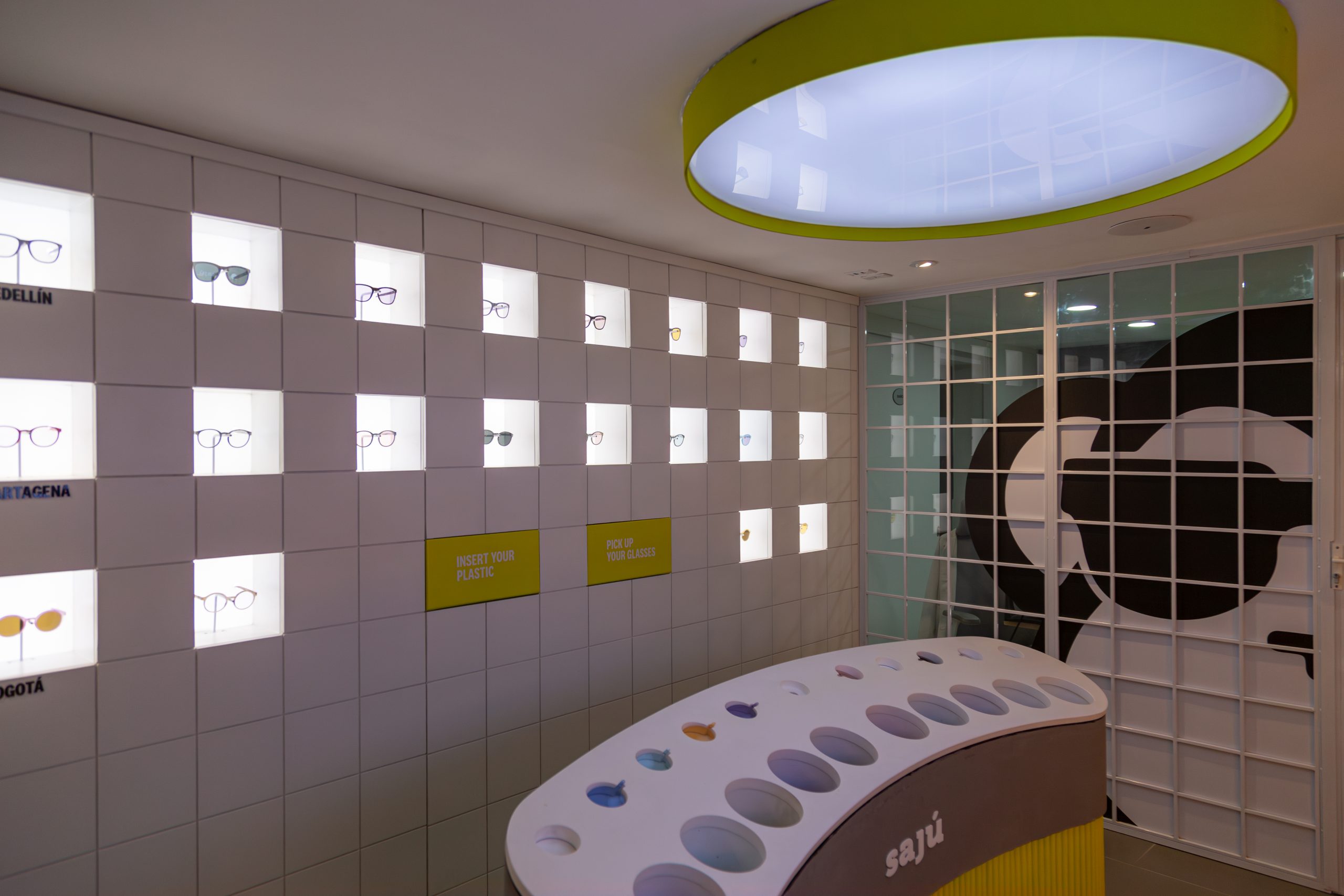 En una de las paredes laterales se encuentra la exhibición de accesorios, mientras que en la otra se exhiben las gafas. En el segundo piso encontramos las monturas especiales, con un mueble diseñado específicamente para resaltar estos productos a través de sencillez e iluminación, mezclado con el “Sajú Experience” que le permite a los usuarios escoger diferentes marcos, colores y lentes para tener un producto único. En el centro contamos con un elemento de descanso para los acompañantes de los compradores. El diseño del local está basado principalmente en microcemento neutro, que permite que los productos brillen, con acentos de color amarillos característicos de la marca, para asi diferenciar el formato de tienda, creando un ambiente sobrio y cool.