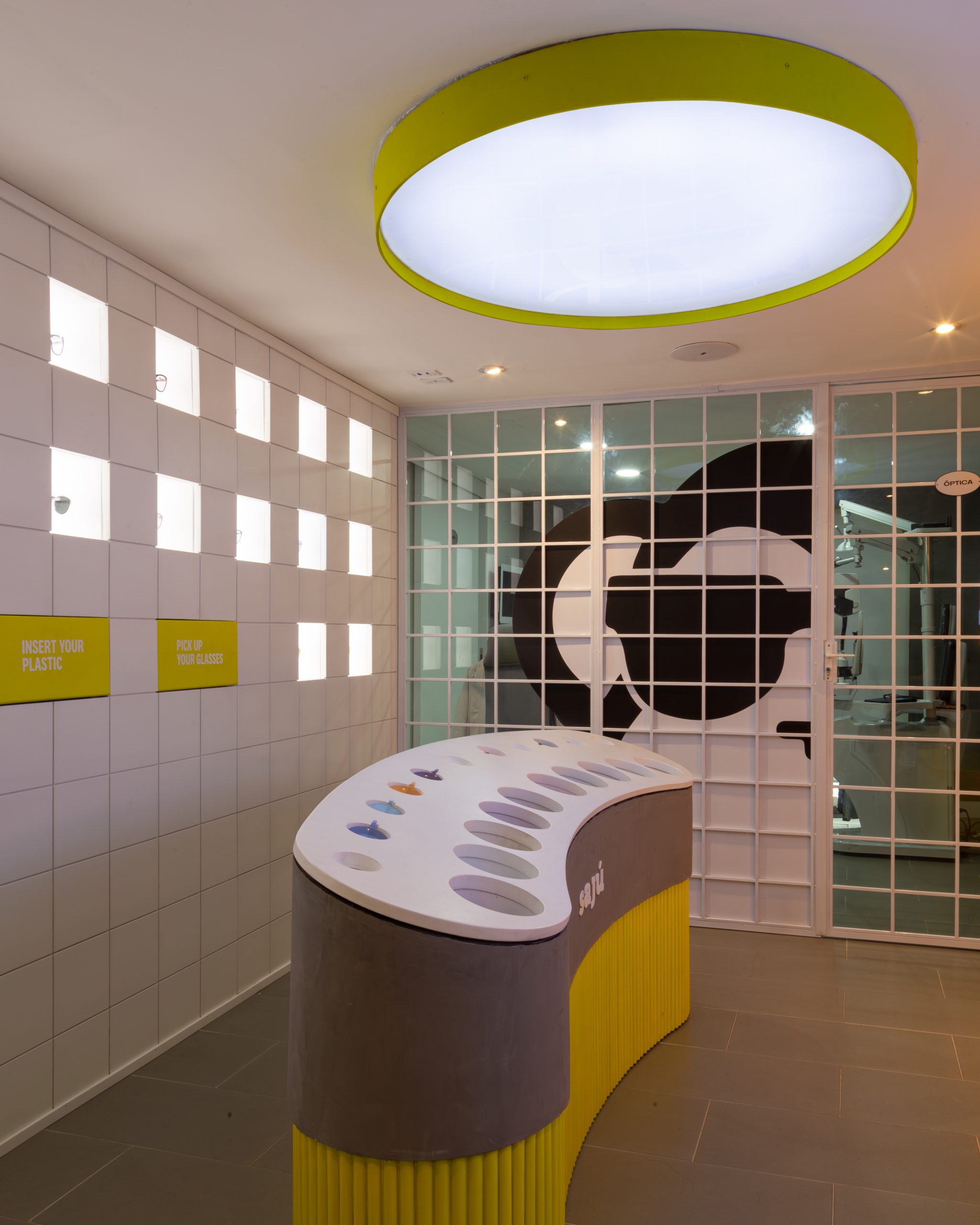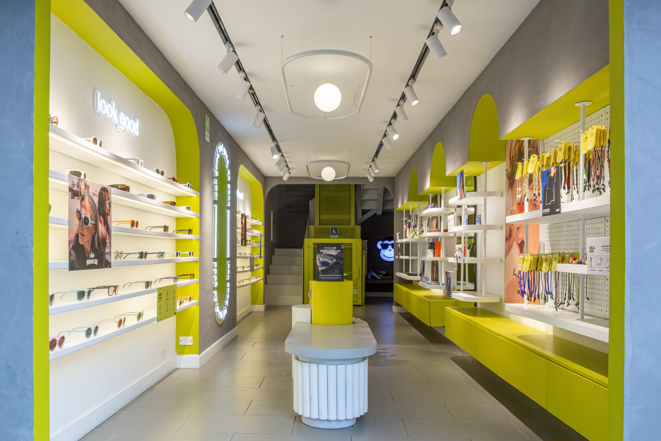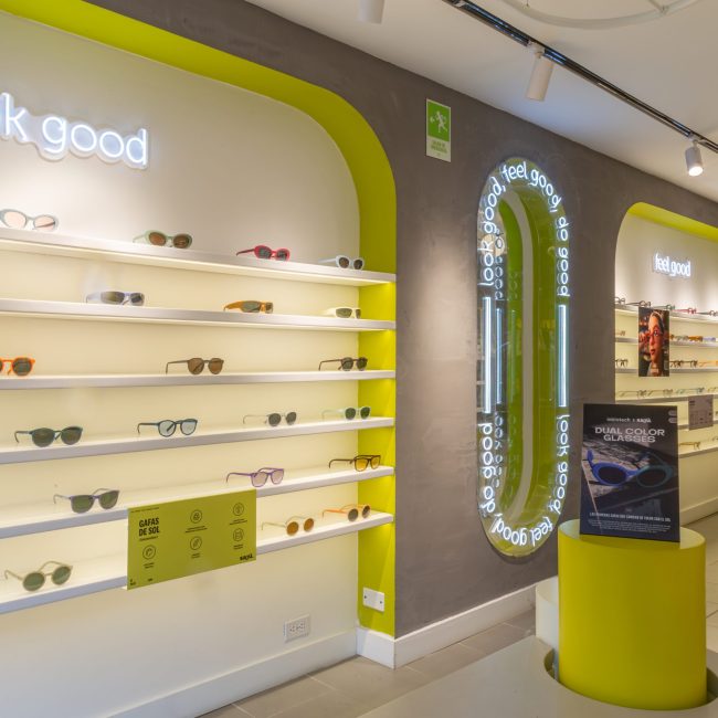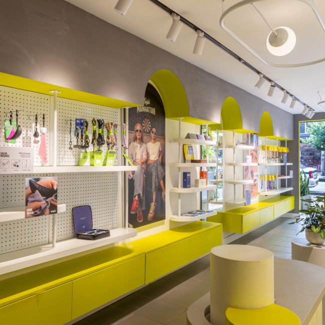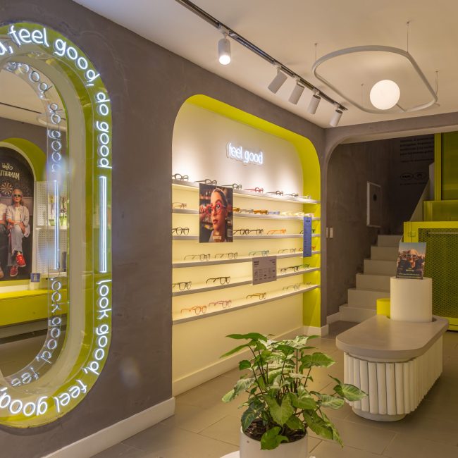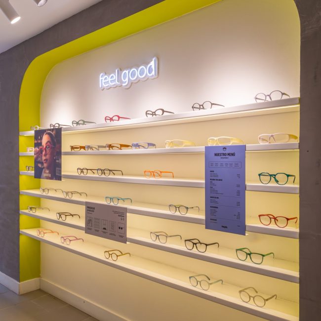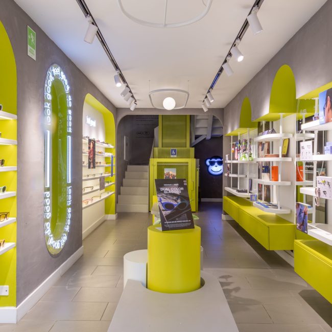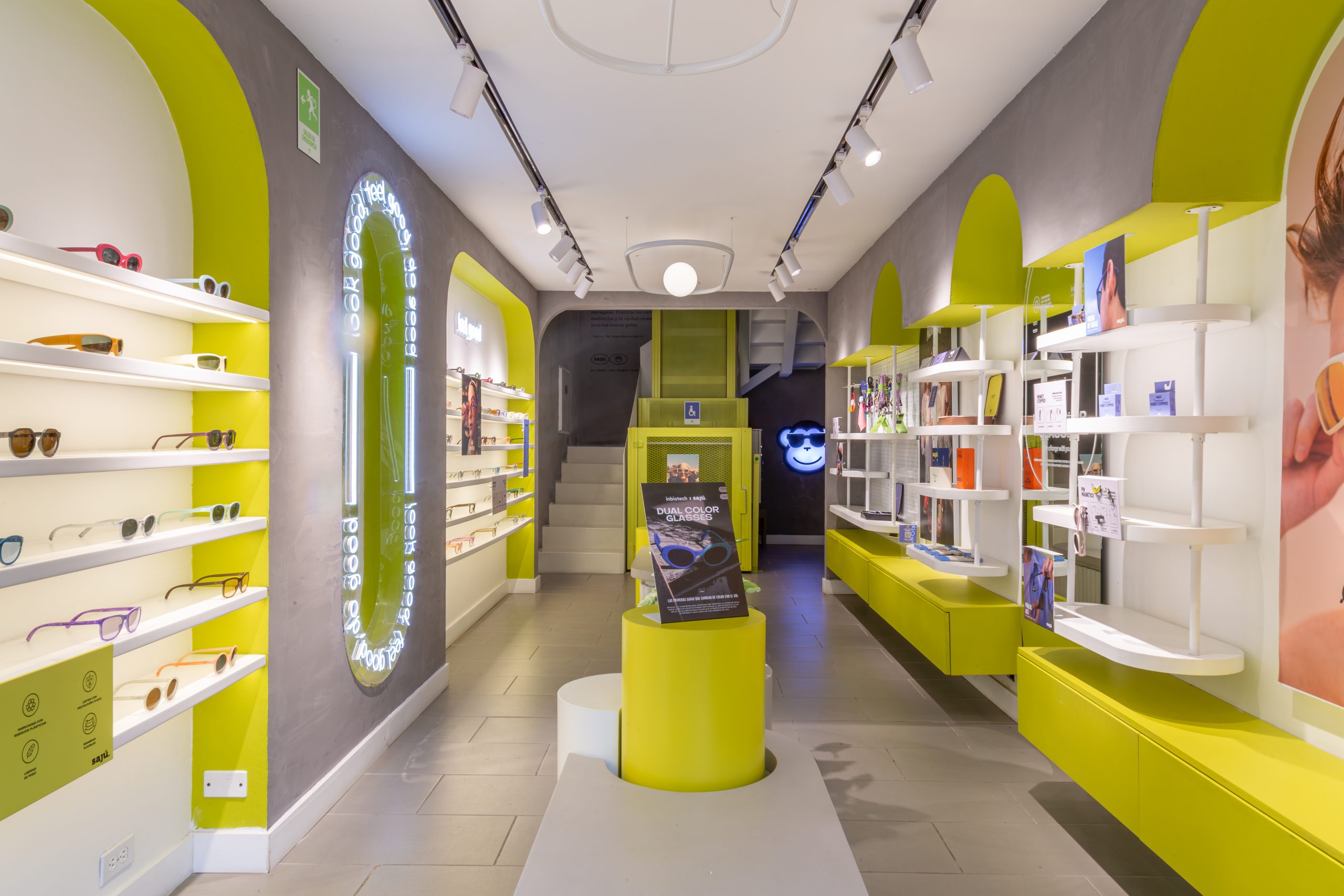 En una de las paredes laterales se encuentra la exhibición de accesorios, mientras que en la otra se exhiben las gafas. En el segundo piso encontramos las monturas especiales, con un mueble diseñado específicamente para resaltar estos productos a través de sencillez e iluminación, mezclado con el “Sajú Experience” que le permite a los usuarios escoger diferentes marcos, colores y lentes para tener un producto único. En el centro contamos con un elemento de descanso para los acompañantes de los compradores. El diseño del local está basado principalmente en microcemento neutro, que permite que los productos brillen, con acentos de color amarillos característicos de la marca, para asi diferenciar el formato de tienda, creando un ambiente sobrio y cool.
