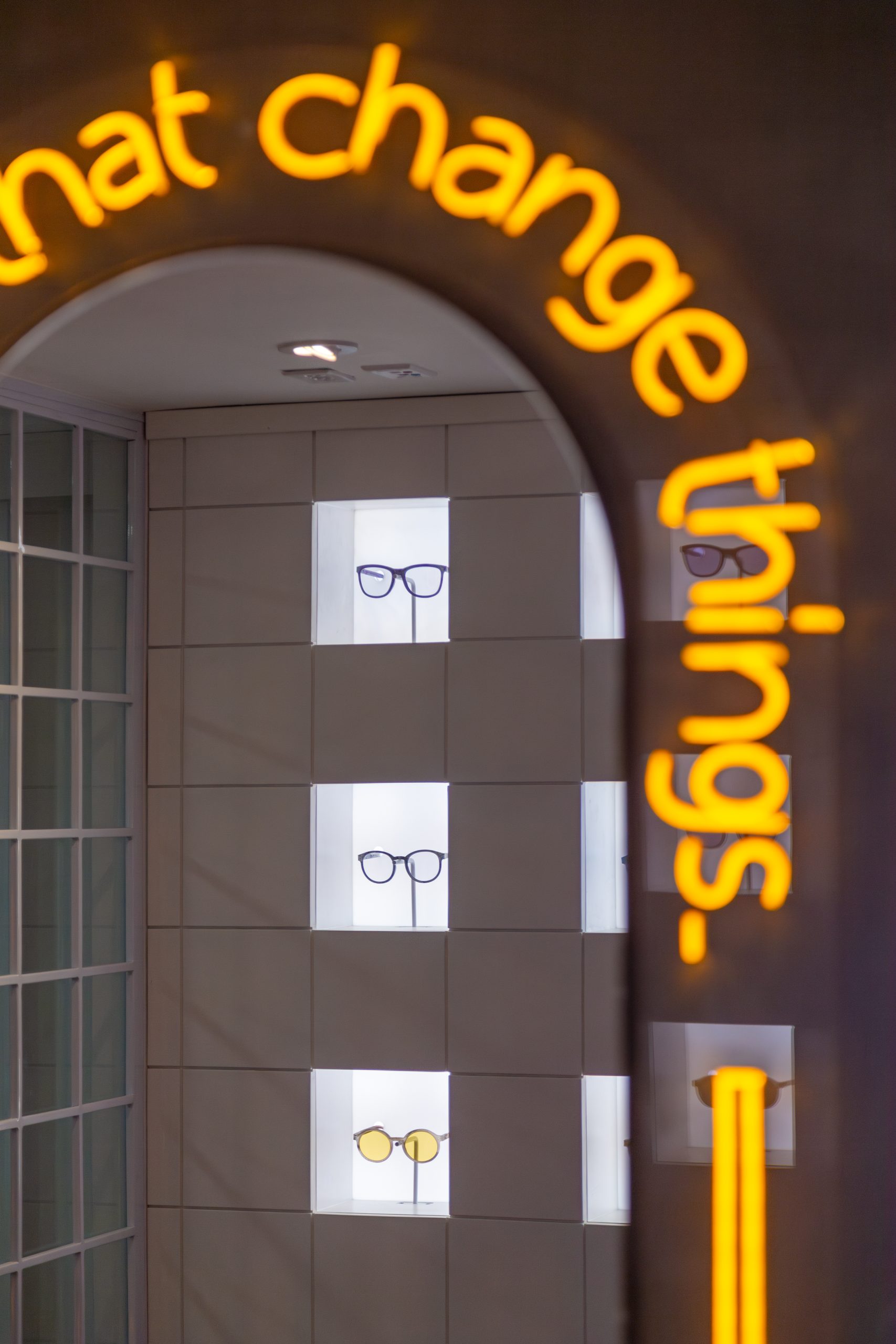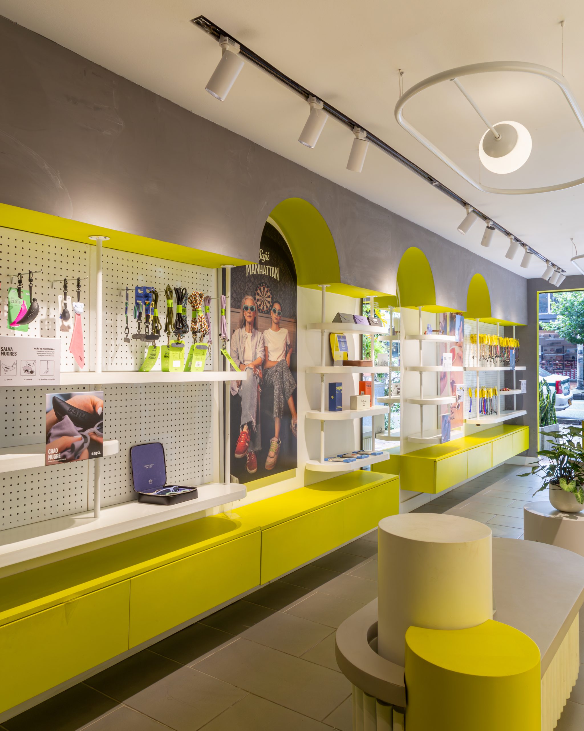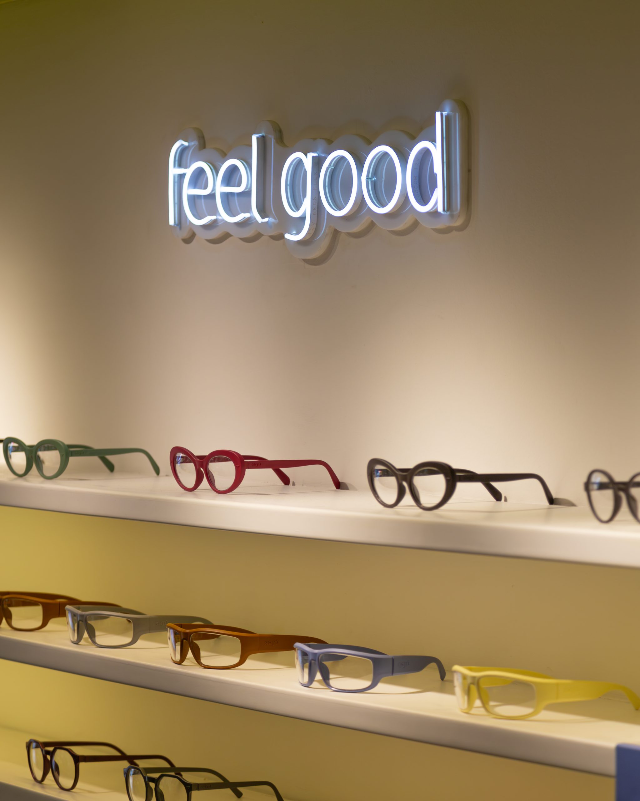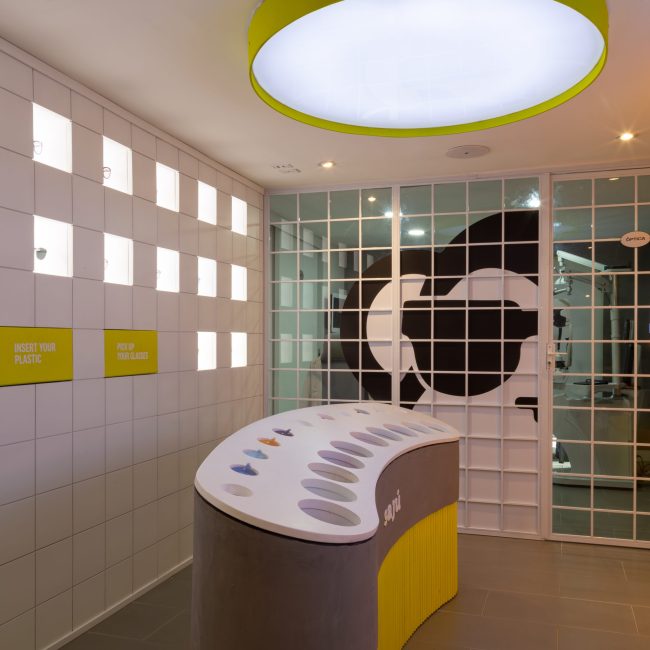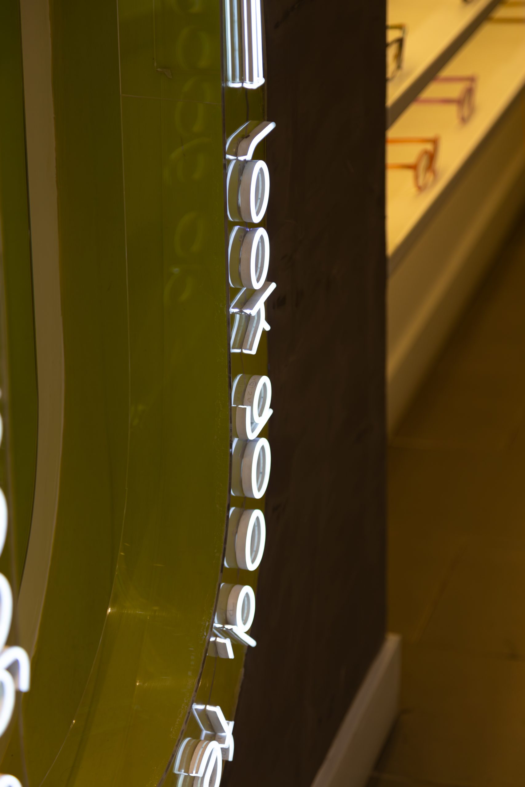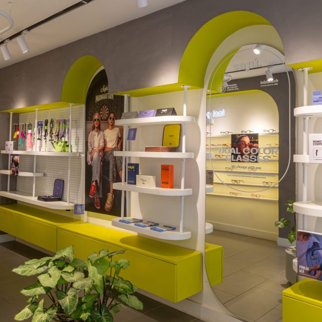 En una de las paredes laterales se encuentra la exhibición de accesorios, mientras que en la otra se exhiben las gafas. En el segundo piso encontramos las monturas especiales, con un mueble diseñado específicamente para resaltar estos productos a través de sencillez e iluminación, mezclado con el “Sajú Experience” que le permite a los usuarios escoger diferentes marcos, colores y lentes para tener un producto único. En el centro contamos con un elemento de descanso para los acompañantes de los compradores. El diseño del local está basado principalmente en microcemento neutro, que permite que los productos brillen, con acentos de color amarillos característicos de la marca, para asi diferenciar el formato de tienda, creando un ambiente sobrio y cool.