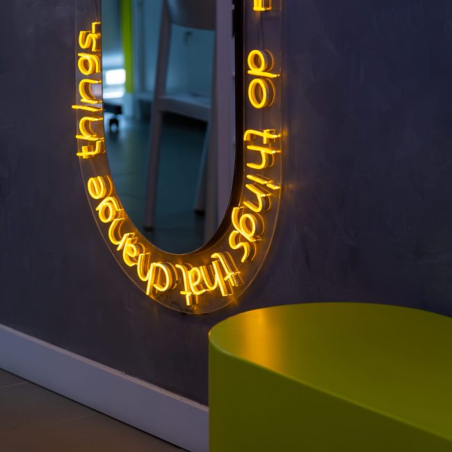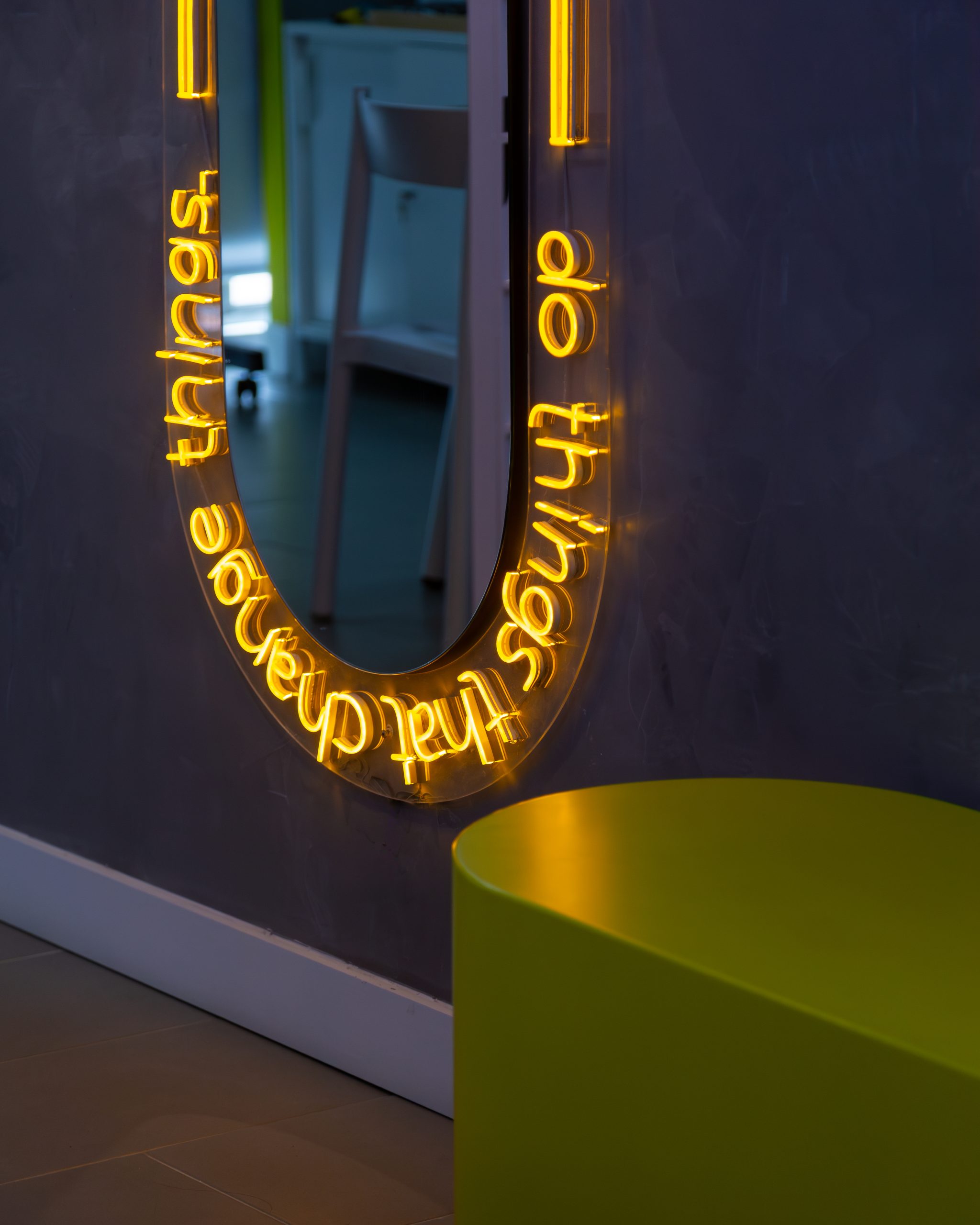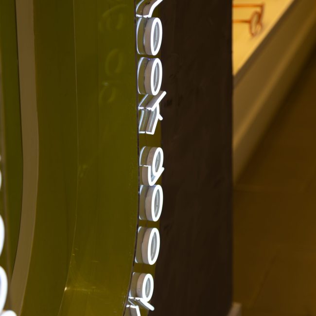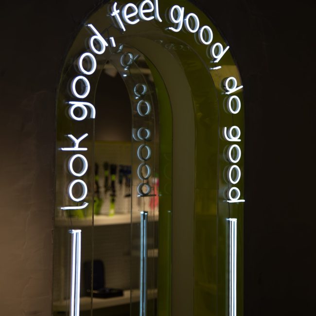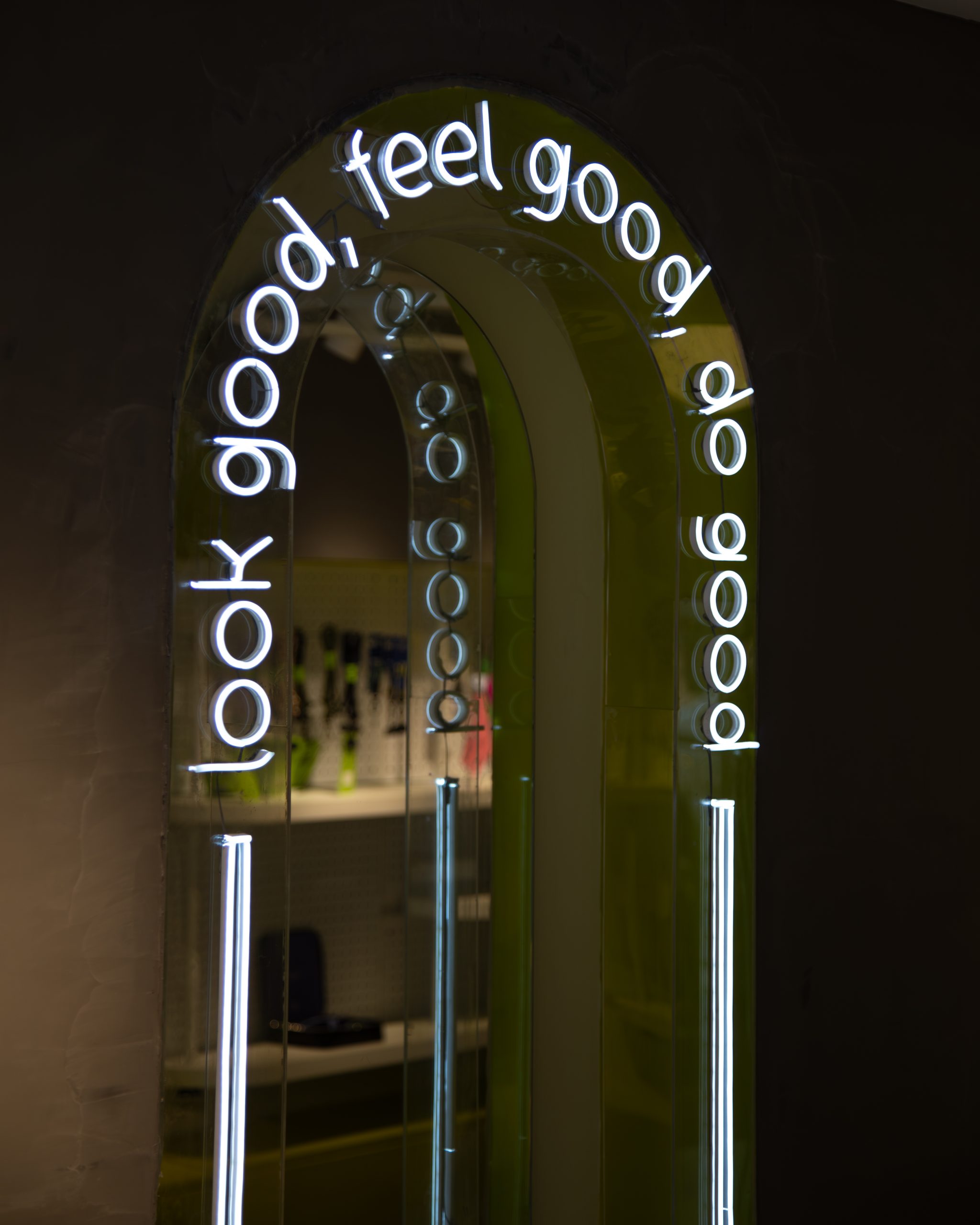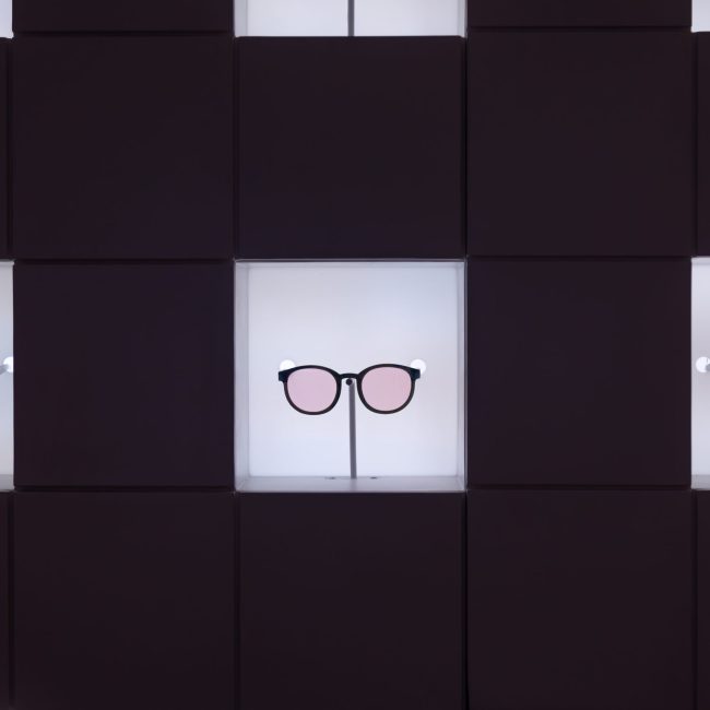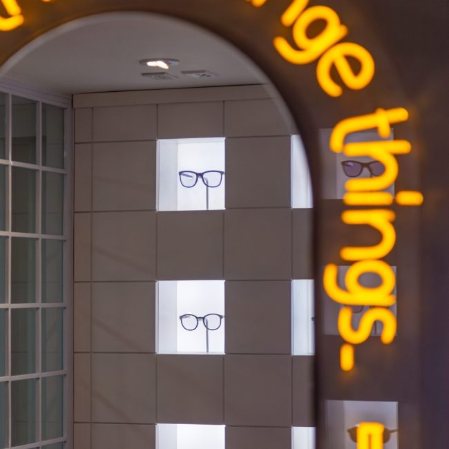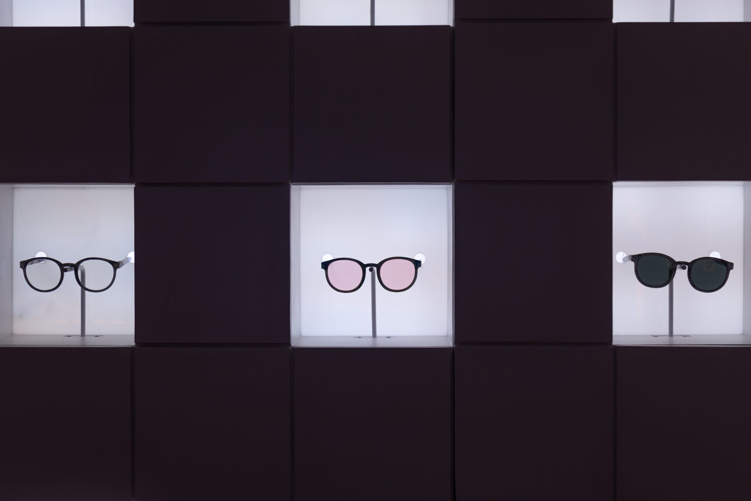En una de las paredes laterales se encuentra la exhibición de accesorios, mientras que en la otra se exhiben las gafas. En el segundo piso encontramos las monturas especiales, con un mueble diseñado específicamente para resaltar estos productos a través de sencillez e iluminación, mezclado con el “Sajú Experience” que le permite a los usuarios escoger diferentes marcos, colores y lentes para tener un producto único. En el centro contamos con un elemento de descanso para los acompañantes de los compradores. El diseño del local está basado principalmente en microcemento neutro, que permite que los productos brillen, con acentos de color amarillos característicos de la marca, para asi diferenciar el formato de tienda, creando un ambiente sobrio y cool.