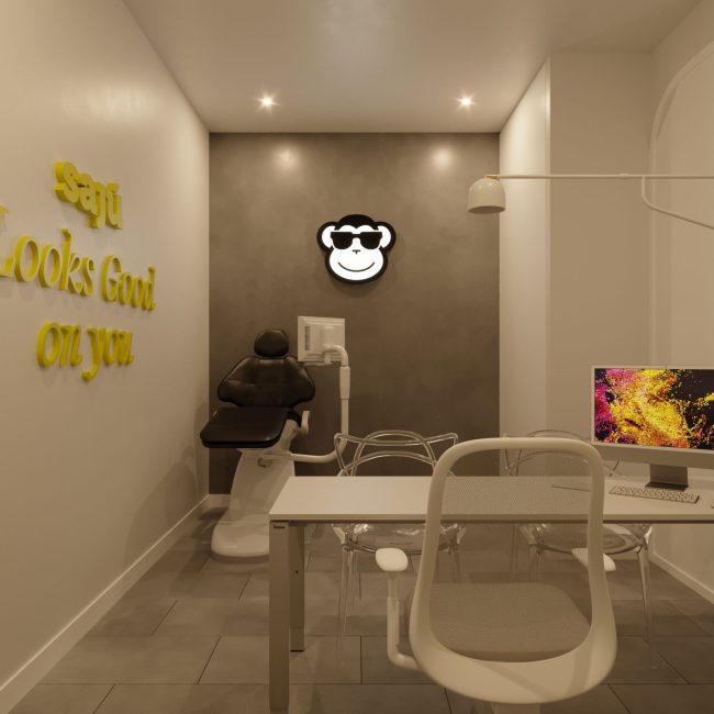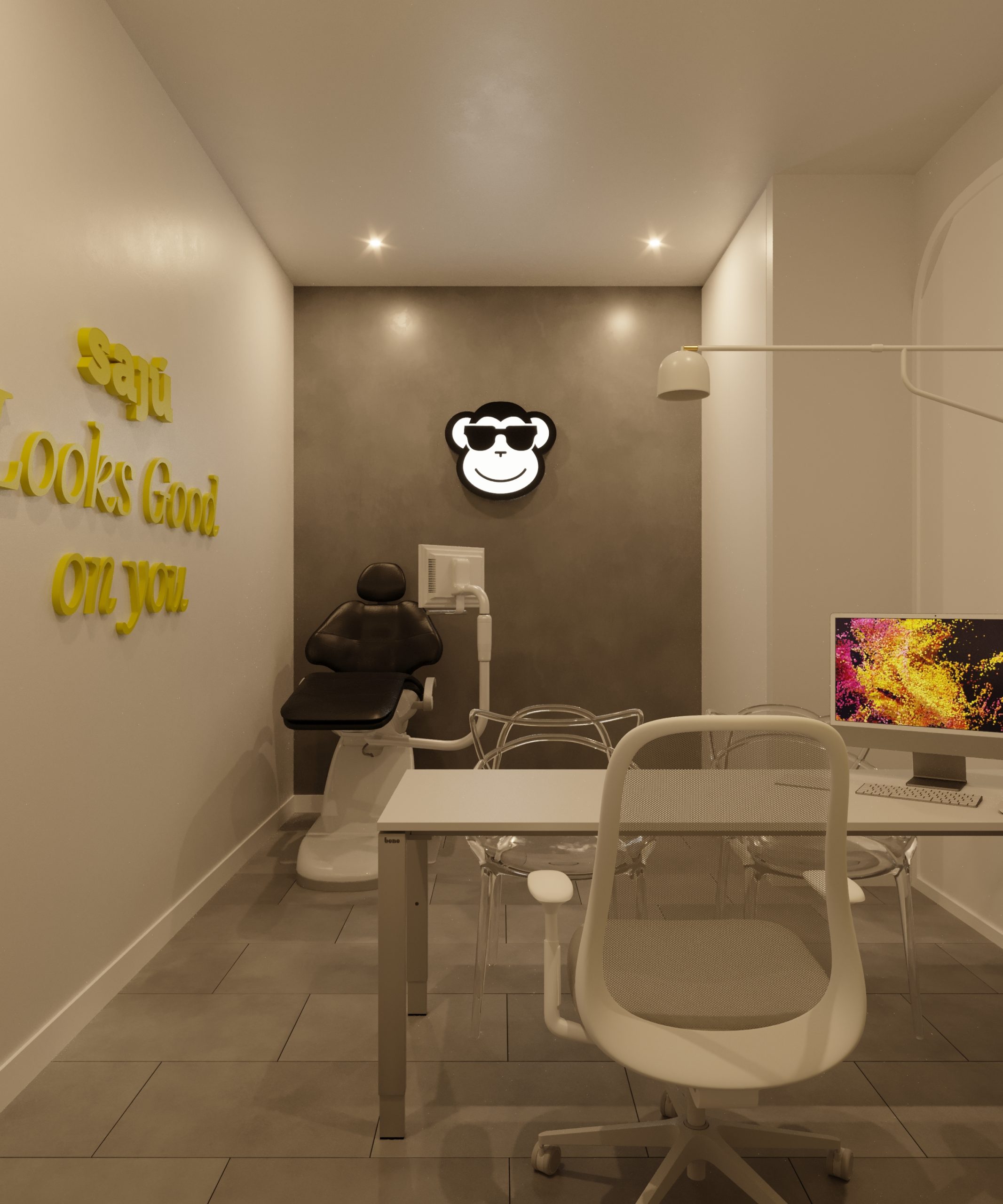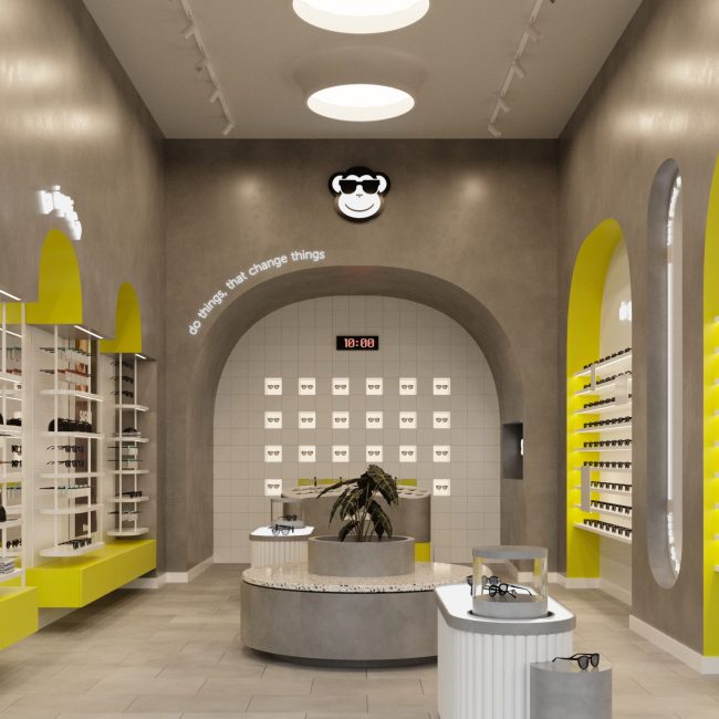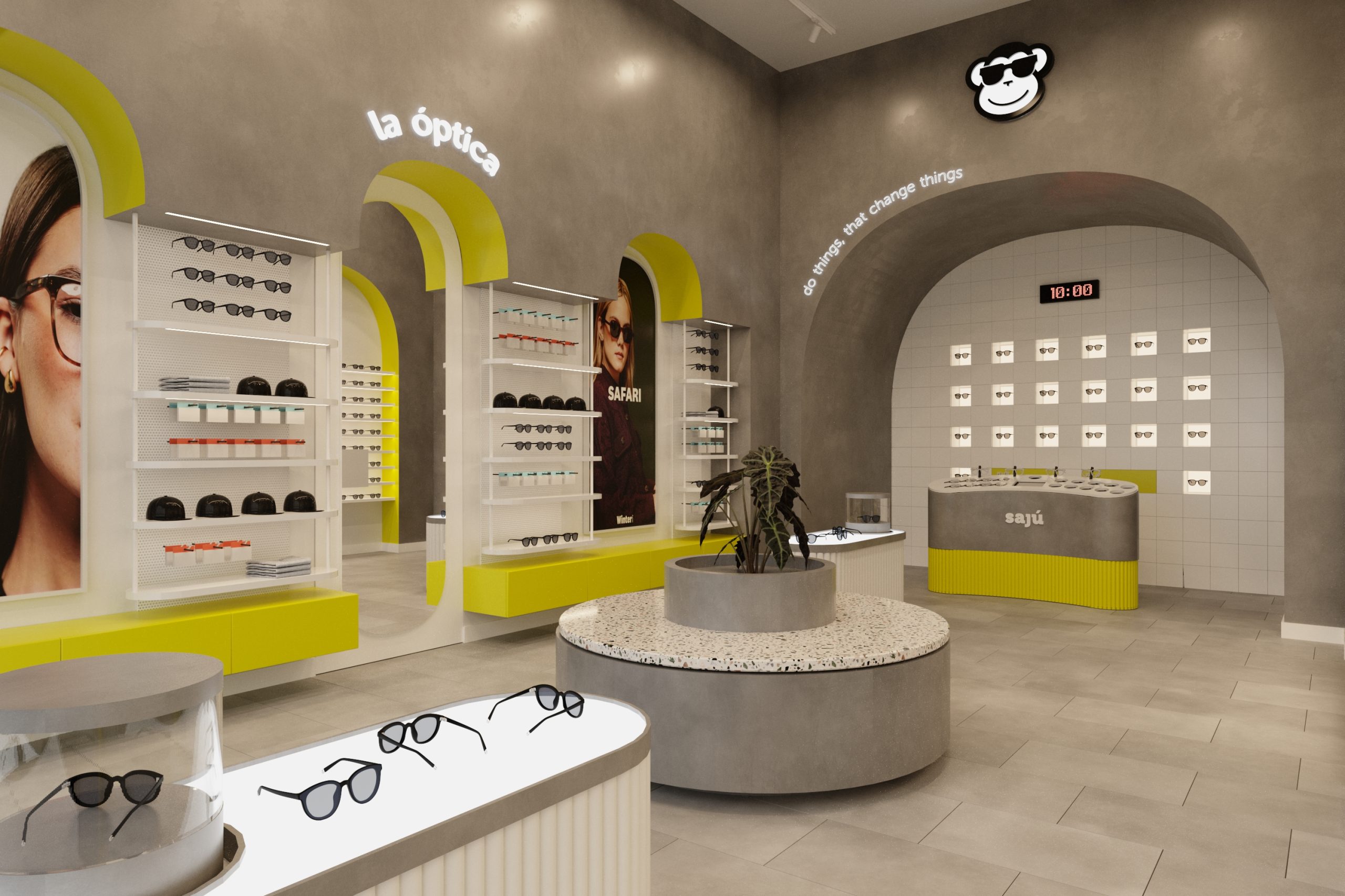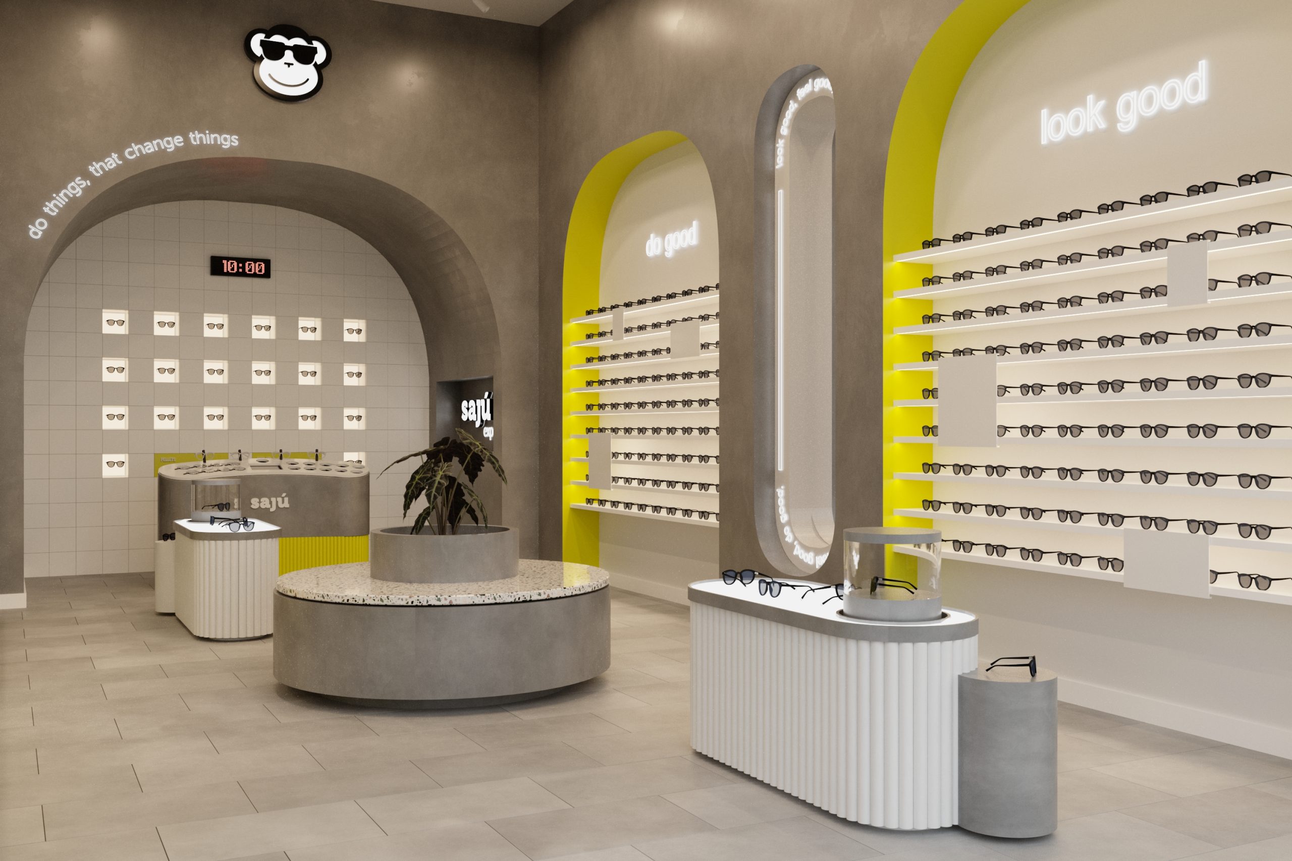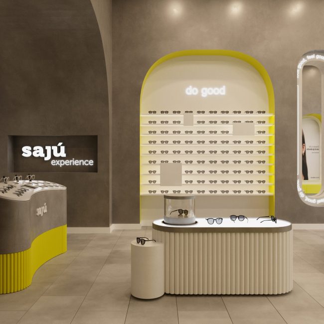 En una de las paredes laterales se encuentra la exhibición de accesorios, mientras que en la otra se exhiben las gafas. La pared frontal se dedica a las monturas especiales, con un mueble diseñado específicamente para resaltar estos productos a través de sencillez e iluminación, mezclado con el “Sajú Experience” que le permite a los usuarios escoger diferentes marcos, colores y lentes para tener un producto único. En el centro contamos con un elemento de descanso para los acompañantes de los compradores. El diseño del local está basado principalmente en microcemento neutro, que permite que los productos brillen, con acentos de color amarillos característicos de la marca, para asi diferenciar el formato de tienda, creando un ambiente sobrio y cool.