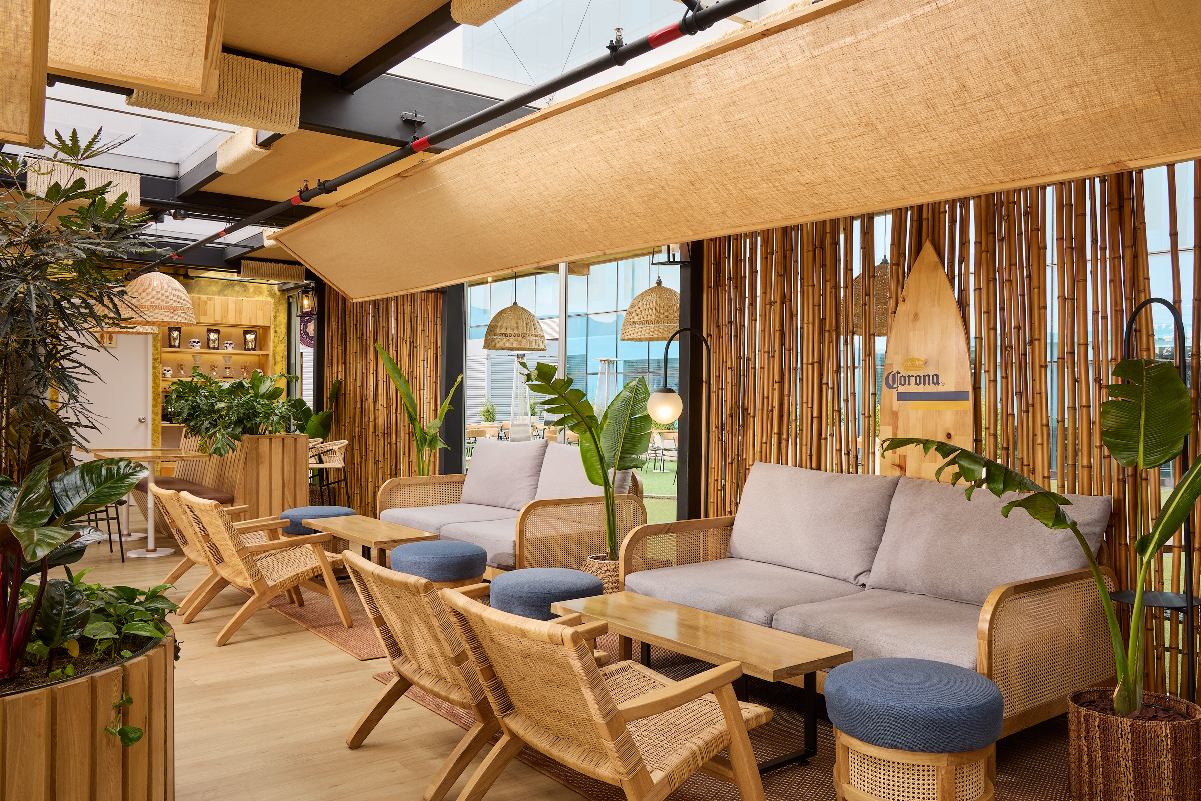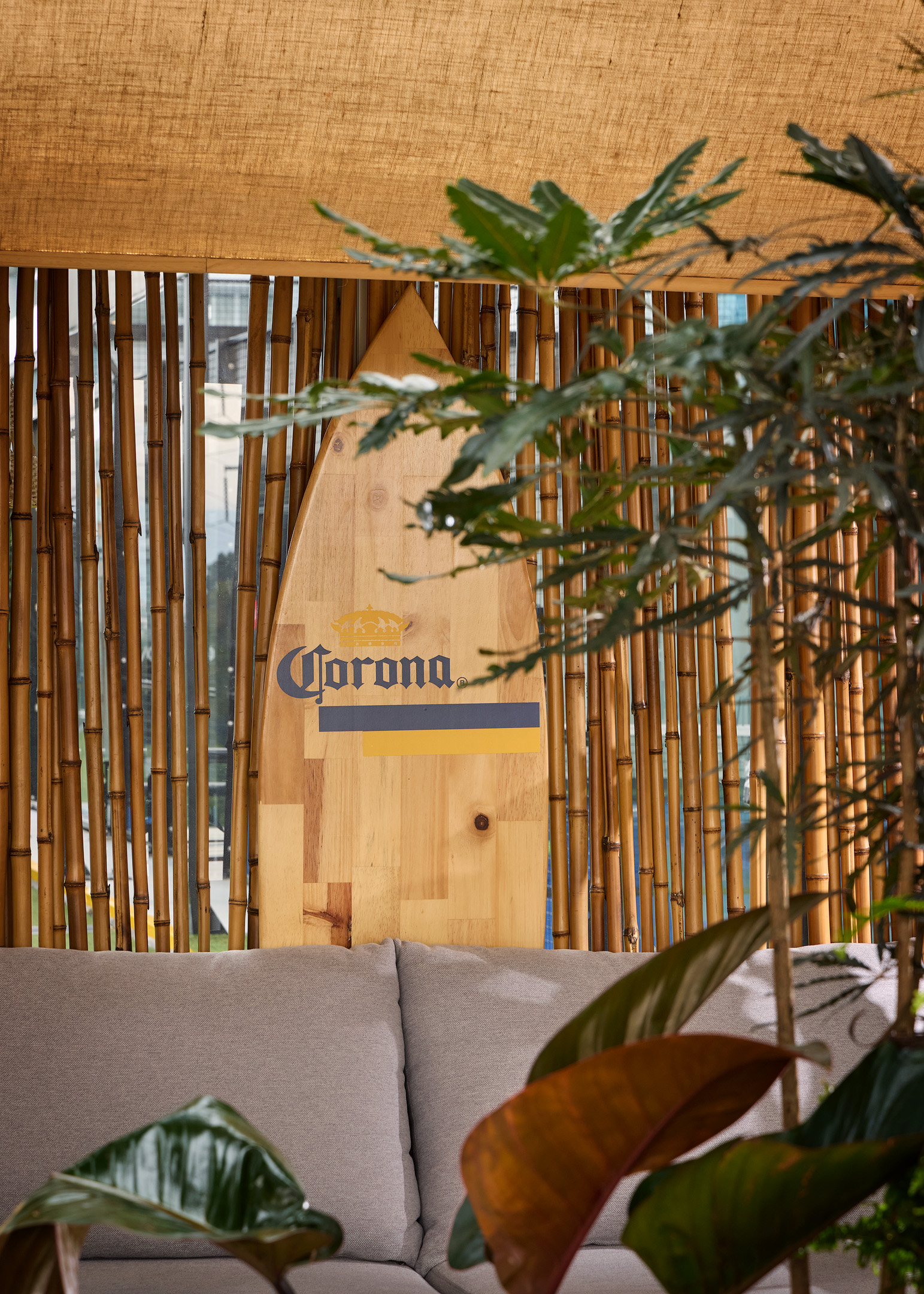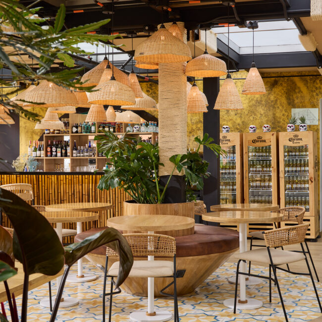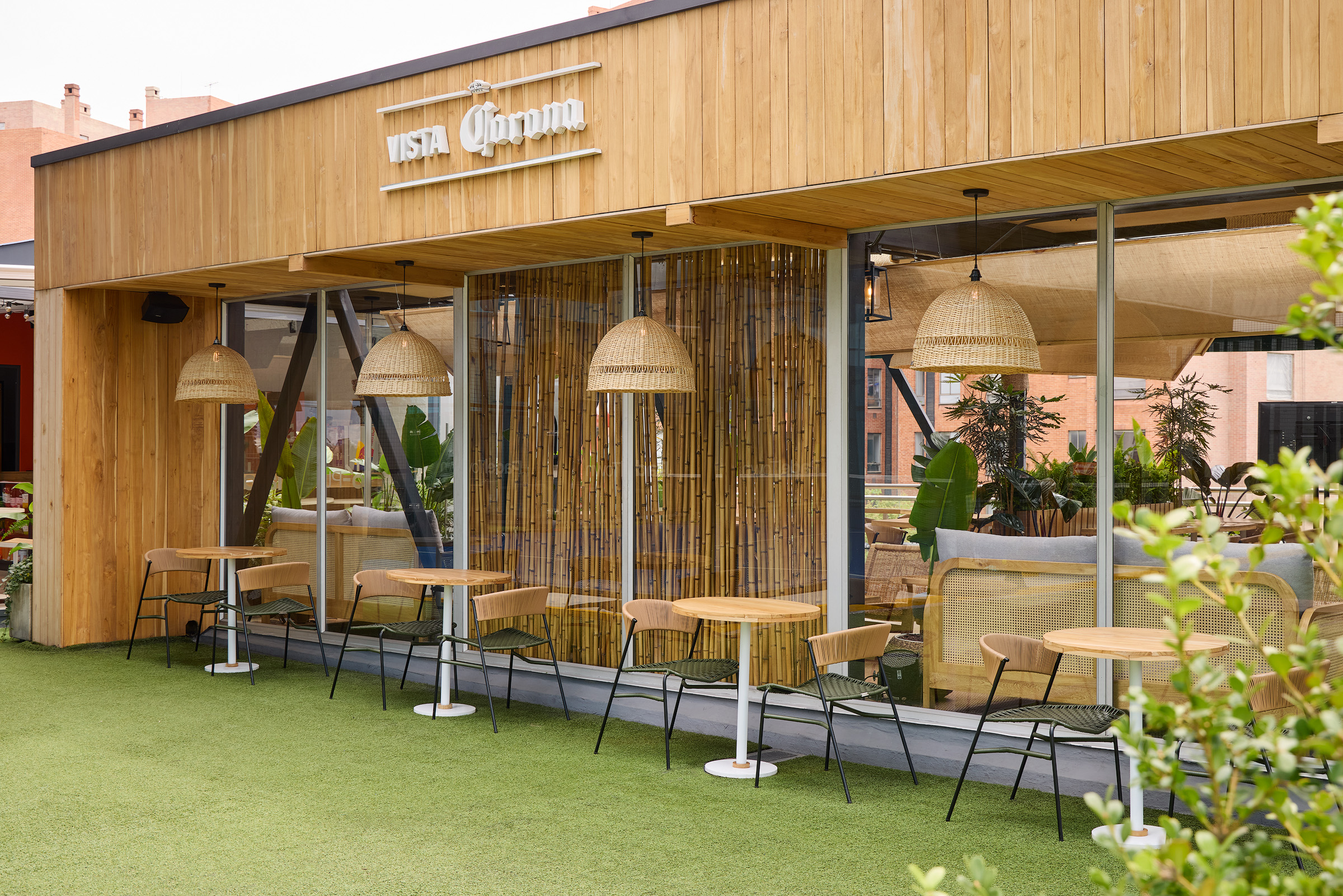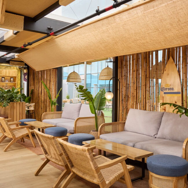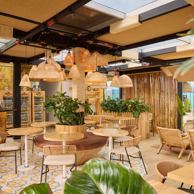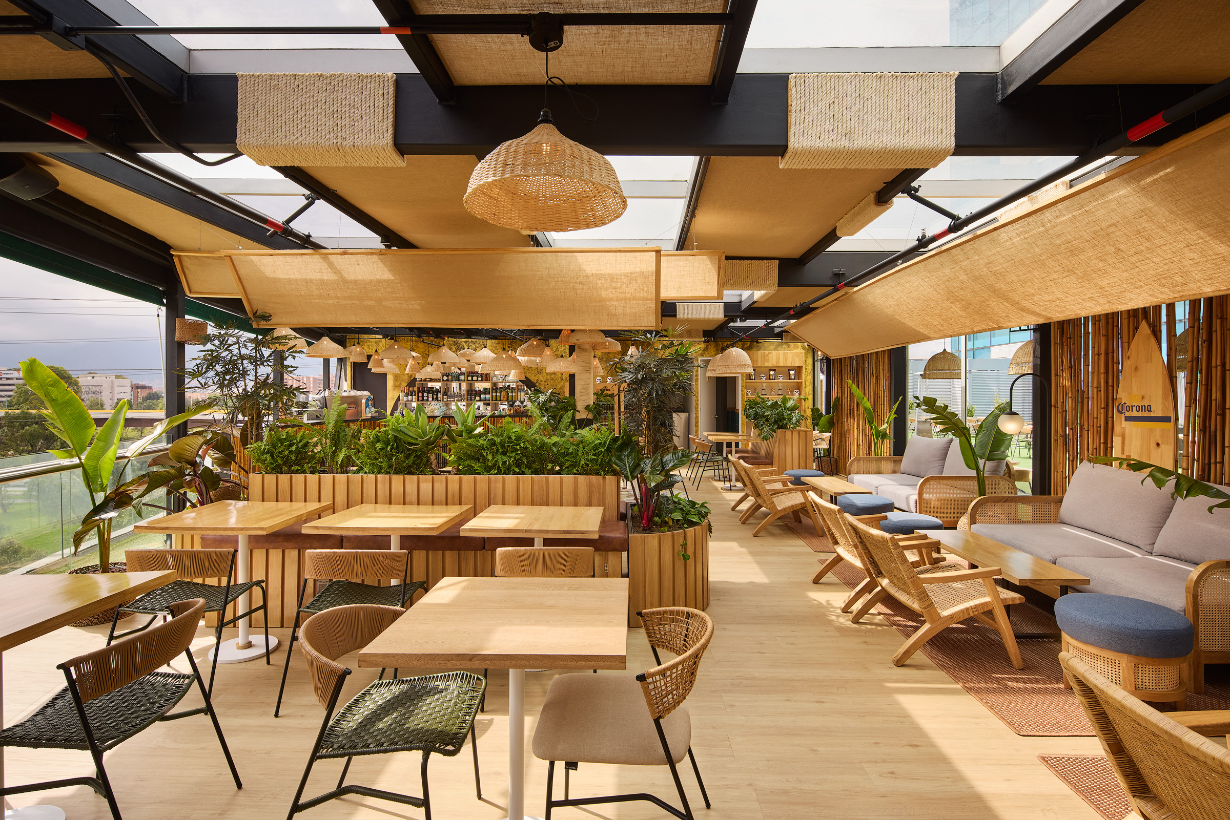 Diseñamos Vista Corona como una experiencia que transporta a la playa en medio de la ciudad. La esencia de la marca Corona, basada en la conexión con la naturaleza, el disfrute del momento y la aventura, se tradujo en un espacio relajado, fresco y acogedor. El diseño del restaurante/bar evoca un refugio tropical, donde los materiales naturales como la madera, el mimbre y la piedra se combinan con abundante vegetación para crear un ambiente cálido y orgánico. La iluminación tenue, con lámparas de fibras naturales suspendidas en diferentes alturas, aporta una sensación de intimidad y confort, mientras que los amplios ventanales permiten la entrada de luz natural y enmarcan la vista. Los espacios han sido diseñados para propiciar la desconexión y el disfrute, con áreas lounge, mesas comunales y rincones más íntimos. El mobiliario, con texturas suaves y tonos neutros, refuerza la sensación de frescura y armonía con el entorno. Los detalles gráficos y decorativos, inspirados en el sol, la arena y el mar, complementan la narrativa visual y refuerzan la identidad de la marca. Desde la disposición del espacio hasta la selección de materiales, cada elemento ha sido pensado para transmitir la esencia de Vista Corona: un lugar donde cada visita se convierte en una escapada, donde el tiempo se detiene y el único propósito es disfrutar del aquí y el ahora.
