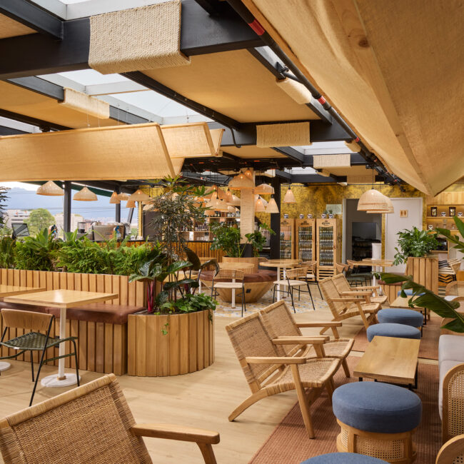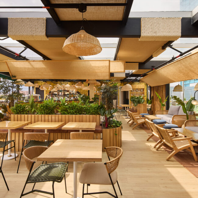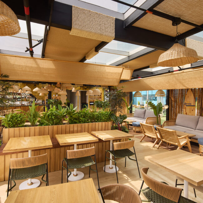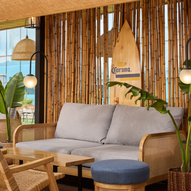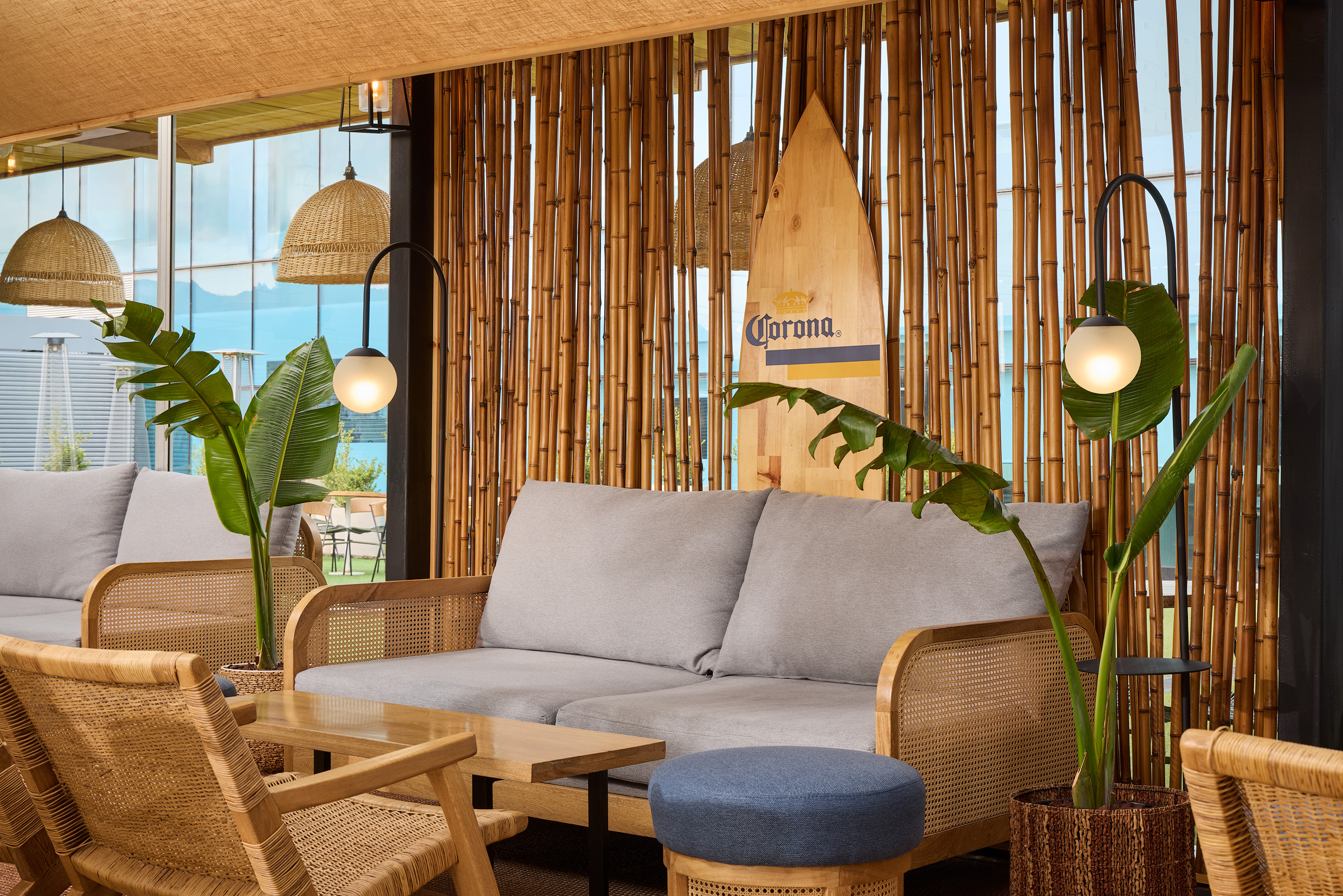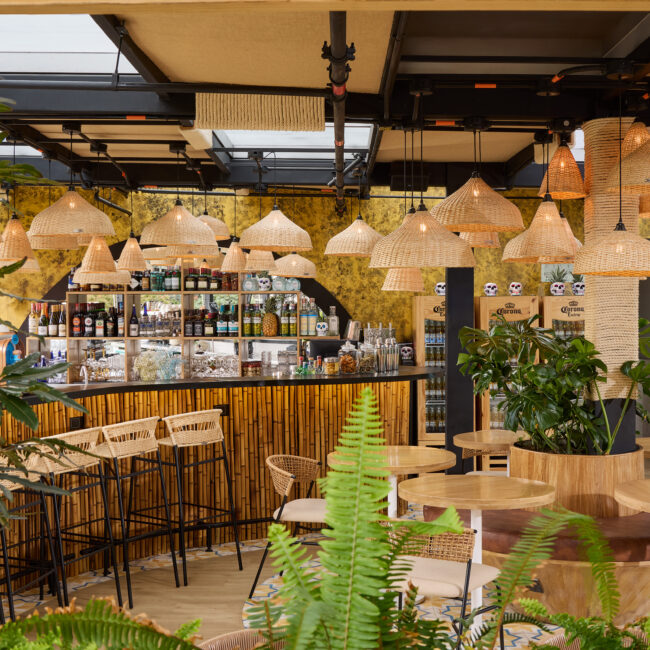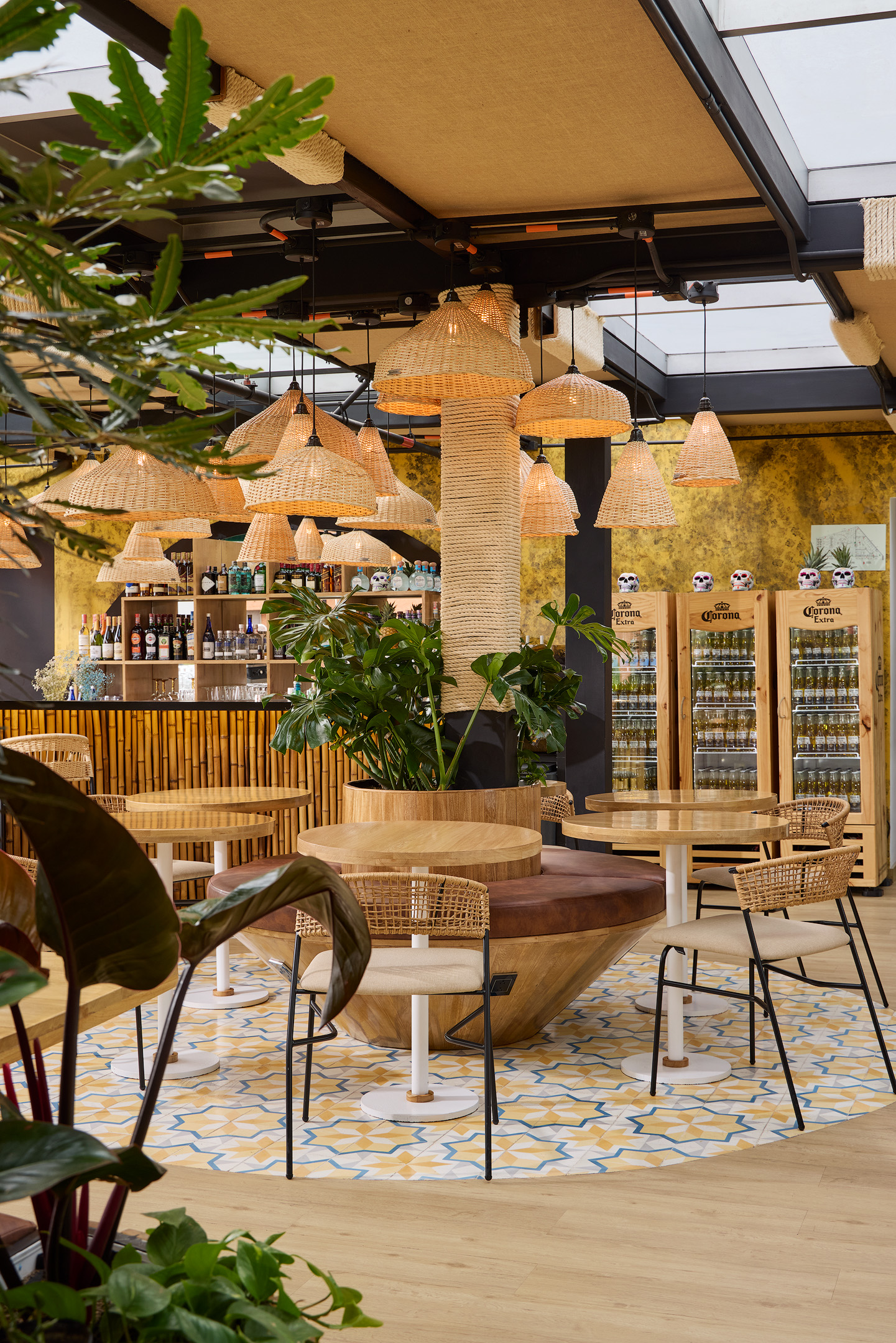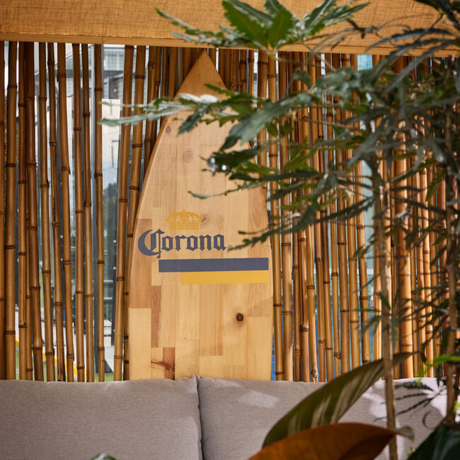 Diseñamos Vista Corona como una experiencia que transporta a la playa en medio de la ciudad. La esencia de la marca Corona, basada en la conexión con la naturaleza, el disfrute del momento y la aventura, se tradujo en un espacio relajado, fresco y acogedor. El diseño del restaurante/bar evoca un refugio tropical, donde los materiales naturales como la madera, el mimbre y la piedra se combinan con abundante vegetación para crear un ambiente cálido y orgánico. La iluminación tenue, con lámparas de fibras naturales suspendidas en diferentes alturas, aporta una sensación de intimidad y confort, mientras que los amplios ventanales permiten la entrada de luz natural y enmarcan la vista. Los espacios han sido diseñados para propiciar la desconexión y el disfrute, con áreas lounge, mesas comunales y rincones más íntimos. El mobiliario, con texturas suaves y tonos neutros, refuerza la sensación de frescura y armonía con el entorno. Los detalles gráficos y decorativos, inspirados en el sol, la arena y el mar, complementan la narrativa visual y refuerzan la identidad de la marca. Desde la disposición del espacio hasta la selección de materiales, cada elemento ha sido pensado para transmitir la esencia de Vista Corona: un lugar donde cada visita se convierte en una escapada, donde el tiempo se detiene y el único propósito es disfrutar del aquí y el ahora.
