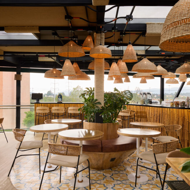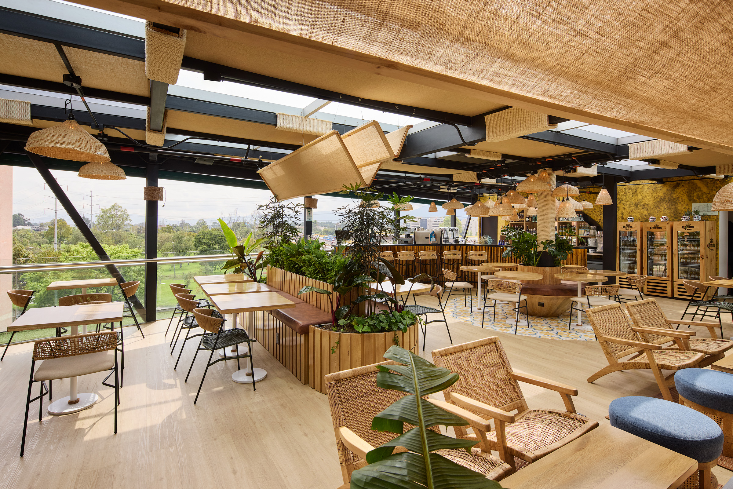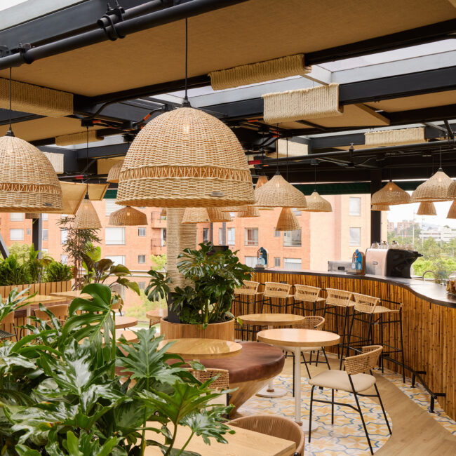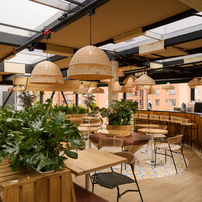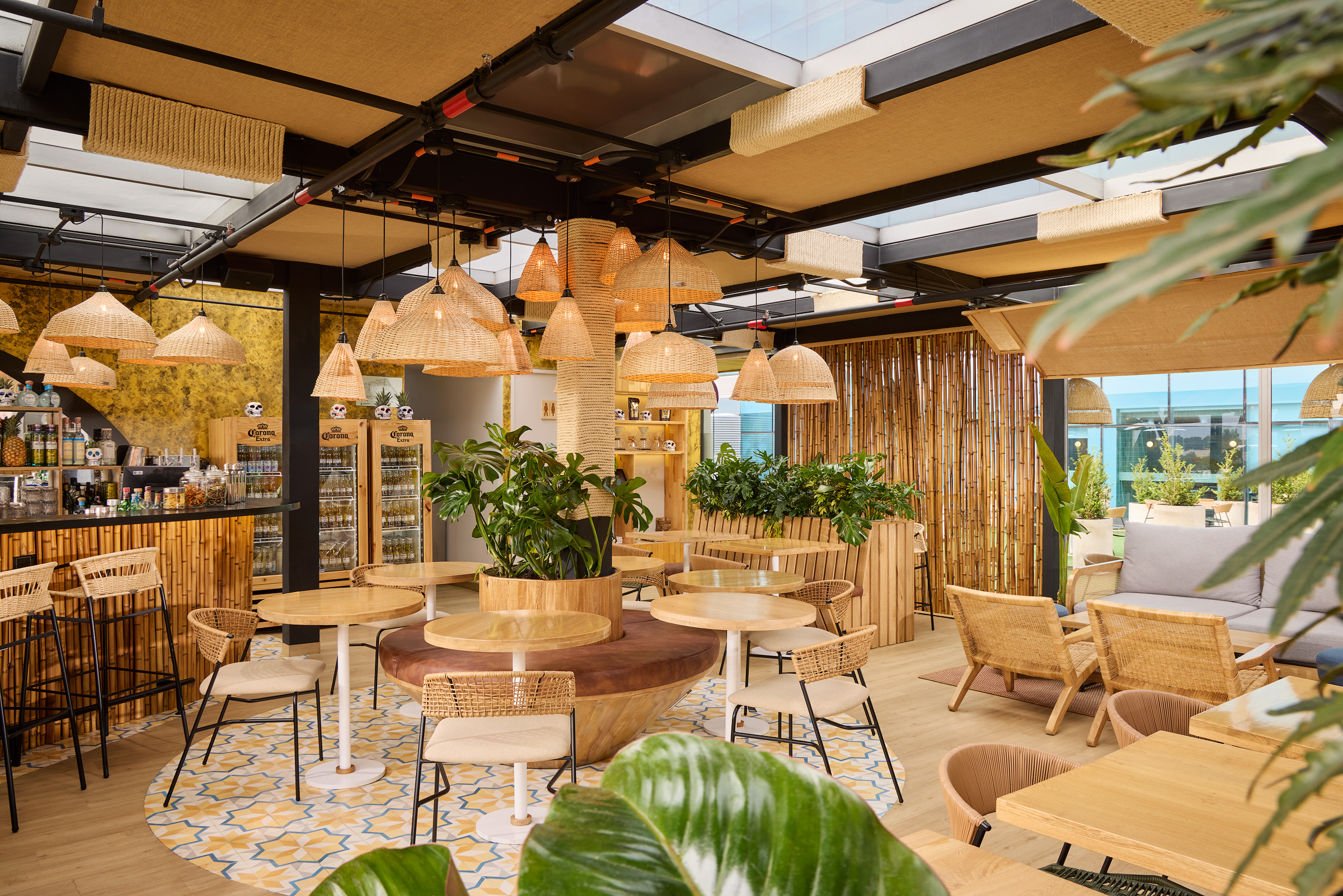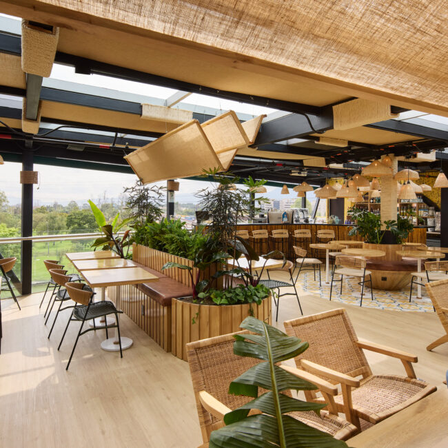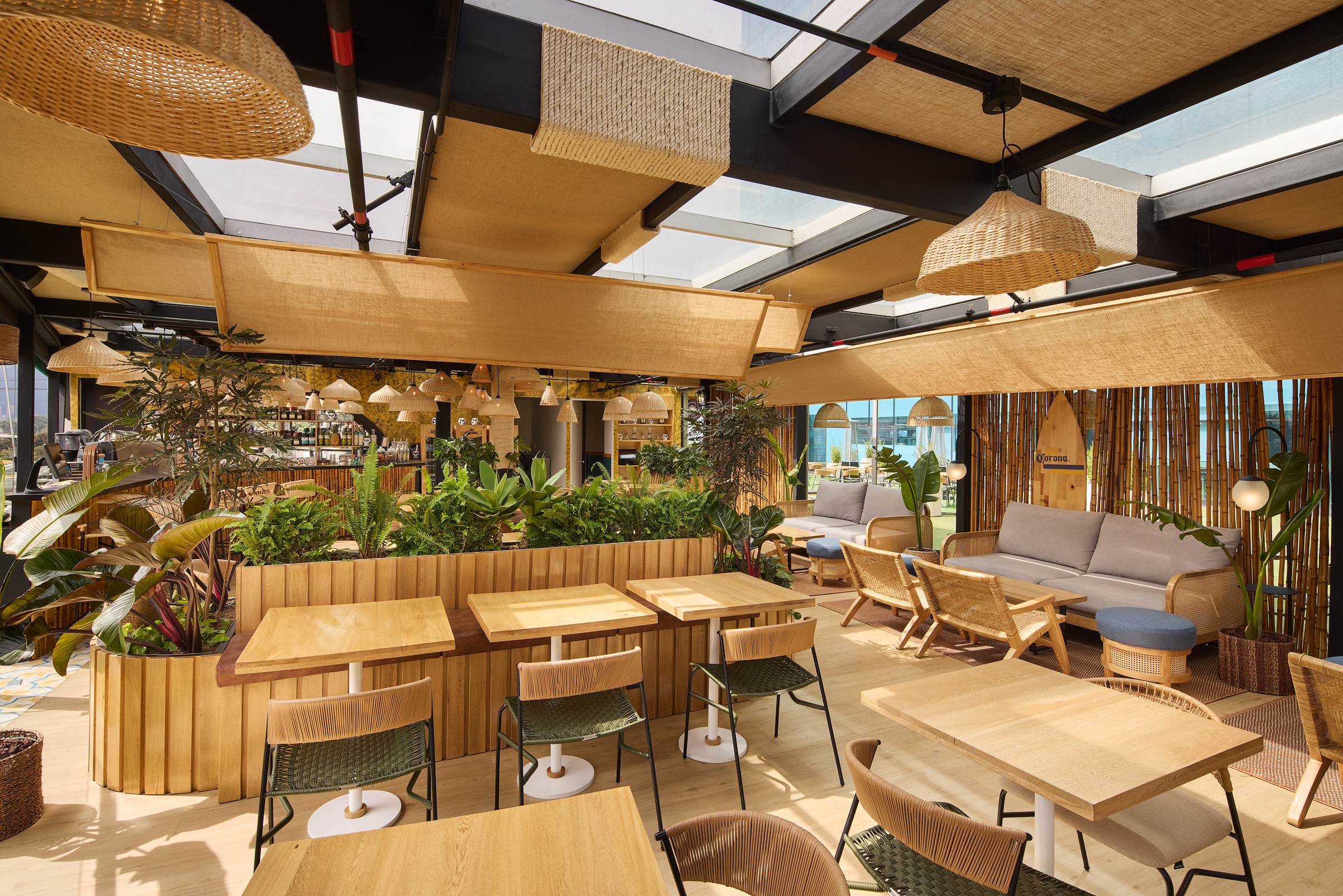 Diseñamos Vista Corona como una experiencia que transporta a la playa en medio de la ciudad. La esencia de la marca Corona, basada en la conexión con la naturaleza, el disfrute del momento y la aventura, se tradujo en un espacio relajado, fresco y acogedor. El diseño del restaurante/bar evoca un refugio tropical, donde los materiales naturales como la madera, el mimbre y la piedra se combinan con abundante vegetación para crear un ambiente cálido y orgánico. La iluminación tenue, con lámparas de fibras naturales suspendidas en diferentes alturas, aporta una sensación de intimidad y confort, mientras que los amplios ventanales permiten la entrada de luz natural y enmarcan la vista. Los espacios han sido diseñados para propiciar la desconexión y el disfrute, con áreas lounge, mesas comunales y rincones más íntimos. El mobiliario, con texturas suaves y tonos neutros, refuerza la sensación de frescura y armonía con el entorno. Los detalles gráficos y decorativos, inspirados en el sol, la arena y el mar, complementan la narrativa visual y refuerzan la identidad de la marca. Desde la disposición del espacio hasta la selección de materiales, cada elemento ha sido pensado para transmitir la esencia de Vista Corona: un lugar donde cada visita se convierte en una escapada, donde el tiempo se detiene y el único propósito es disfrutar del aquí y el ahora.