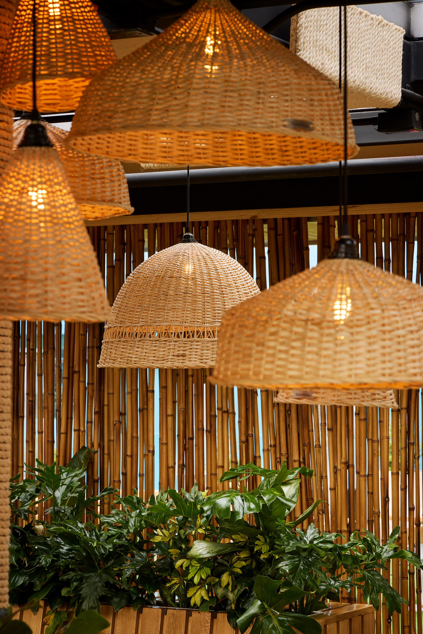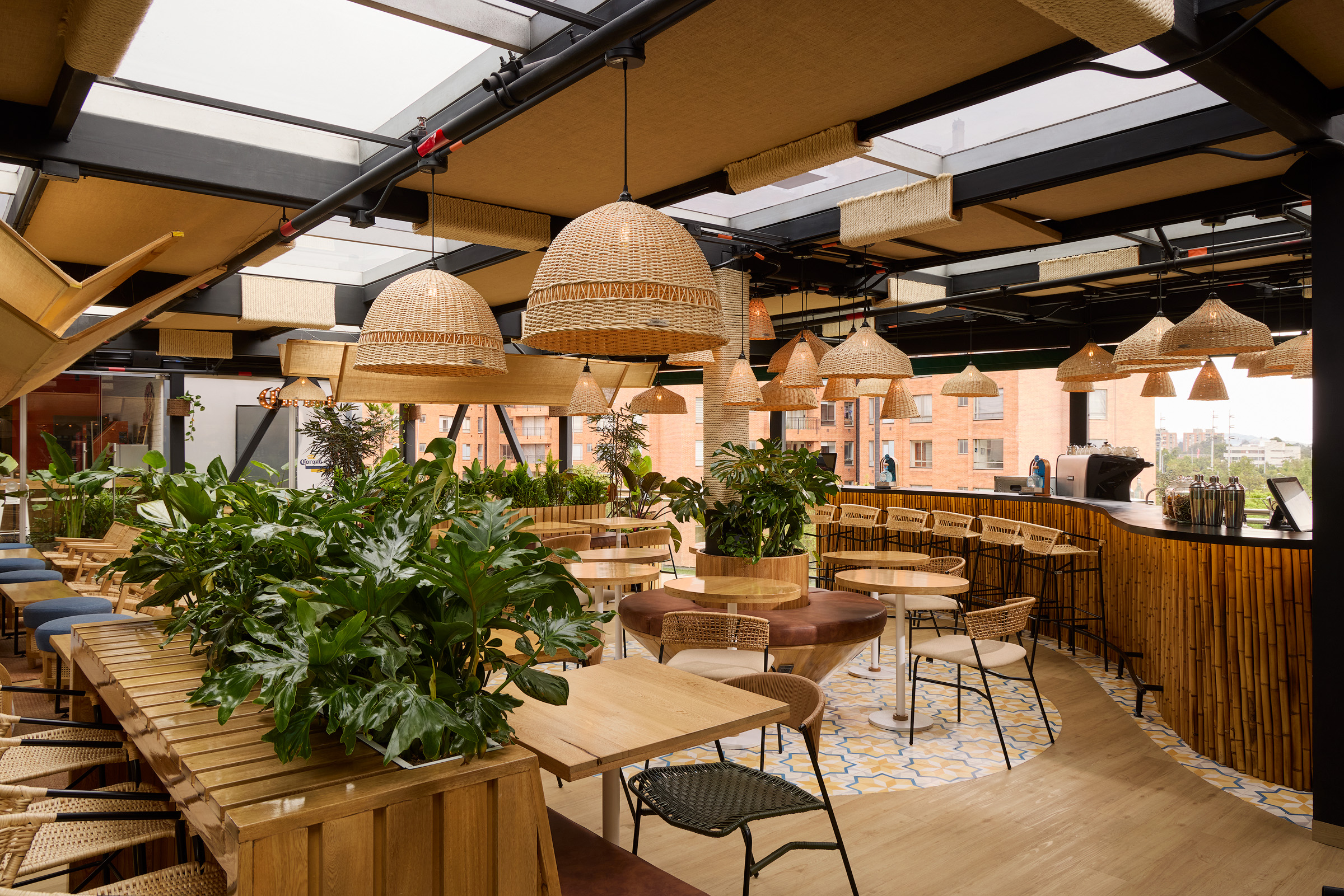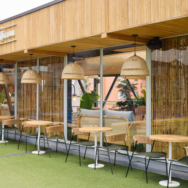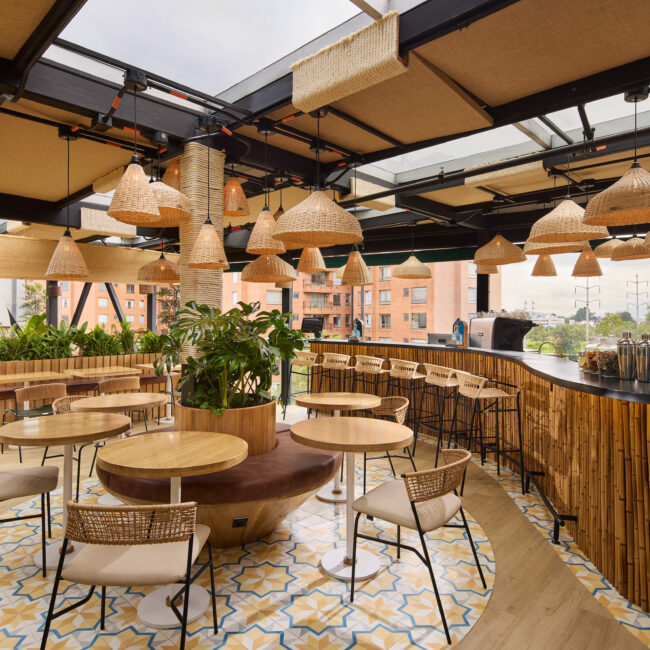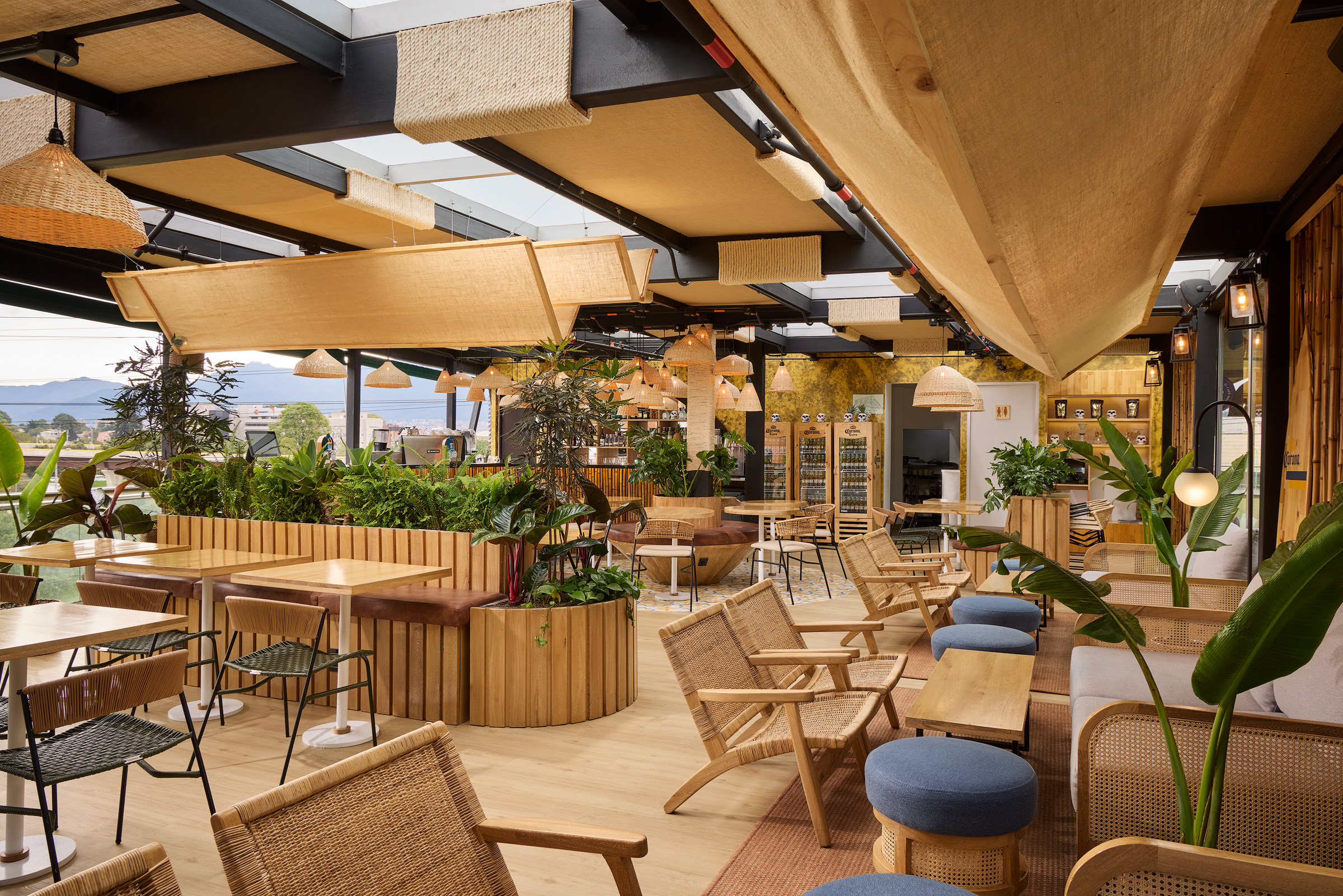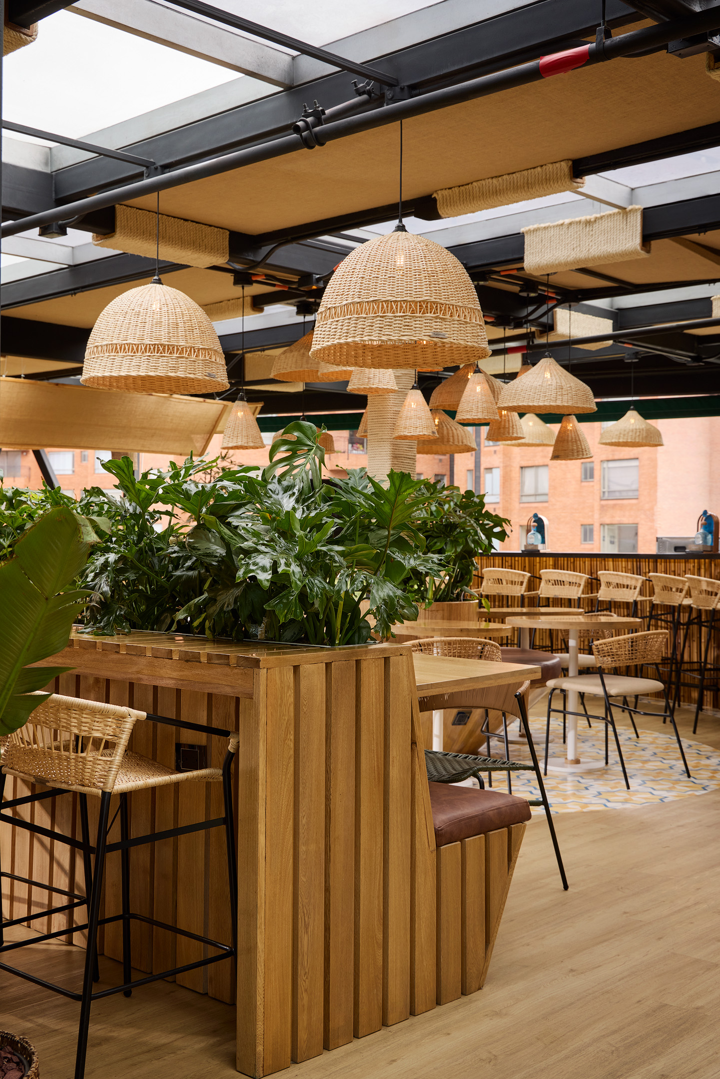 Diseñamos Vista Corona como una experiencia que transporta a la playa en medio de la ciudad. La esencia de la marca Corona, basada en la conexión con la naturaleza, el disfrute del momento y la aventura, se tradujo en un espacio relajado, fresco y acogedor. El diseño del restaurante/bar evoca un refugio tropical, donde los materiales naturales como la madera, el mimbre y la piedra se combinan con abundante vegetación para crear un ambiente cálido y orgánico. La iluminación tenue, con lámparas de fibras naturales suspendidas en diferentes alturas, aporta una sensación de intimidad y confort, mientras que los amplios ventanales permiten la entrada de luz natural y enmarcan la vista. Los espacios han sido diseñados para propiciar la desconexión y el disfrute, con áreas lounge, mesas comunales y rincones más íntimos. El mobiliario, con texturas suaves y tonos neutros, refuerza la sensación de frescura y armonía con el entorno. Los detalles gráficos y decorativos, inspirados en el sol, la arena y el mar, complementan la narrativa visual y refuerzan la identidad de la marca. Desde la disposición del espacio hasta la selección de materiales, cada elemento ha sido pensado para transmitir la esencia de Vista Corona: un lugar donde cada visita se convierte en una escapada, donde el tiempo se detiene y el único propósito es disfrutar del aquí y el ahora.