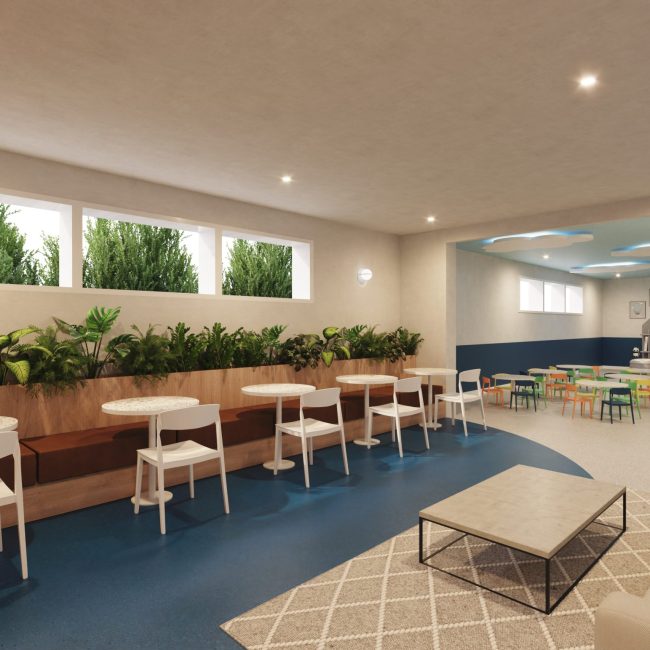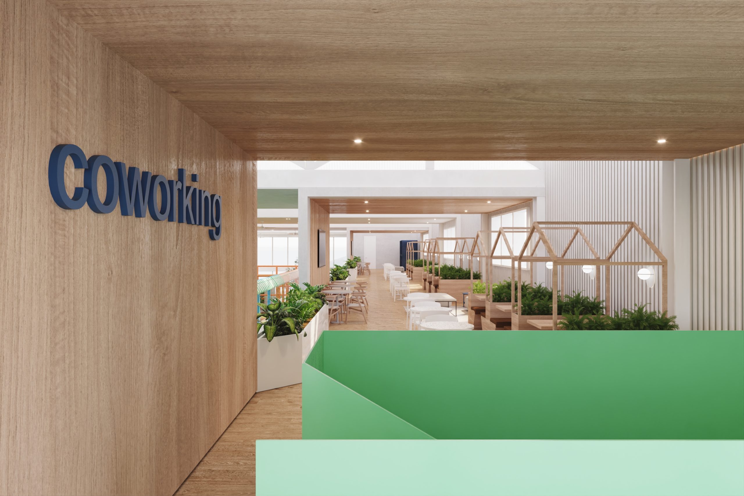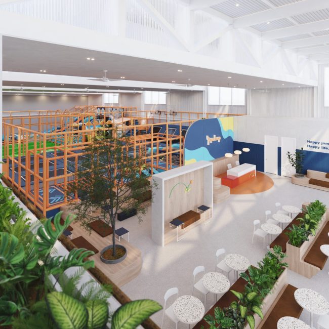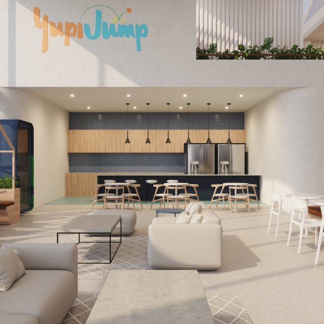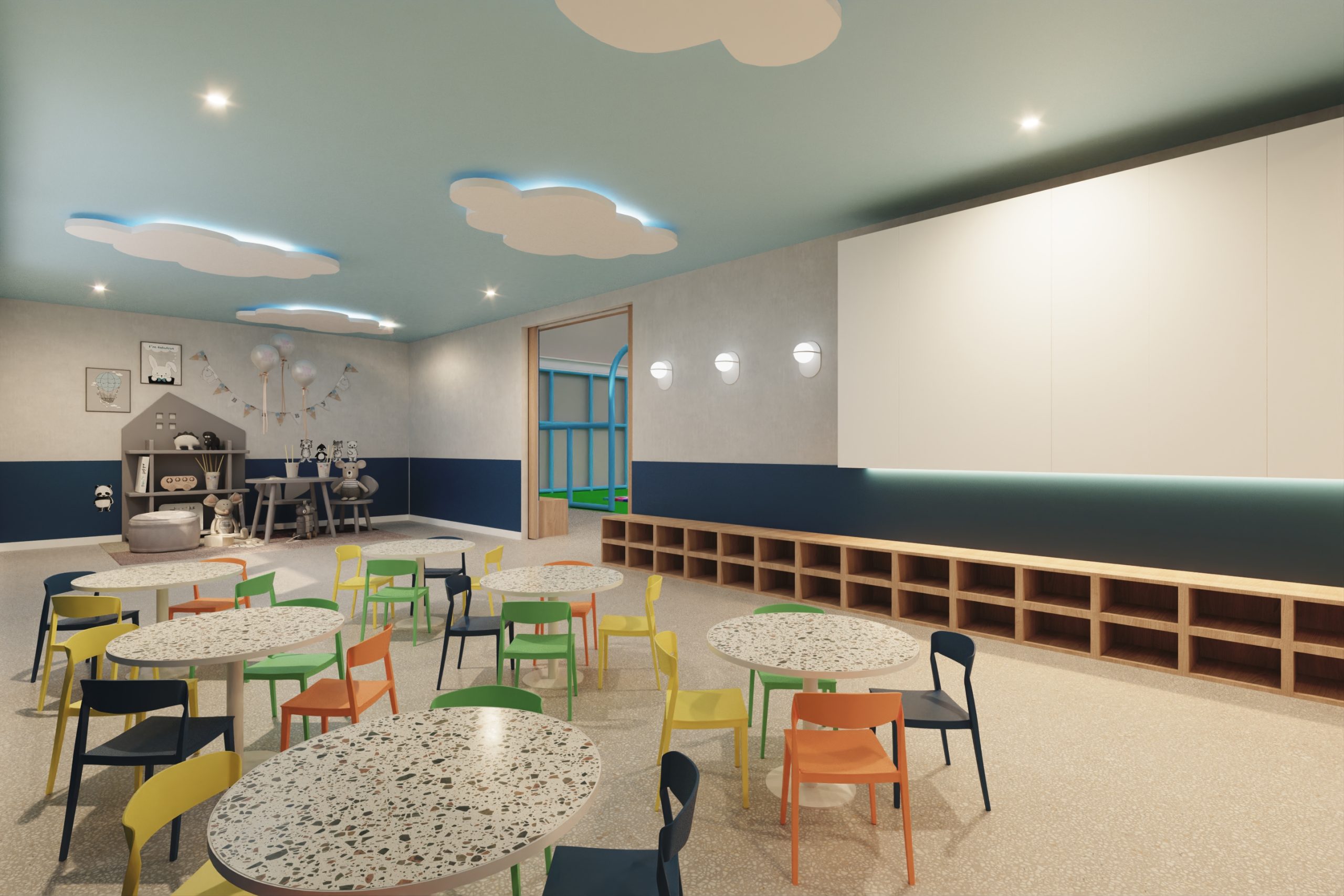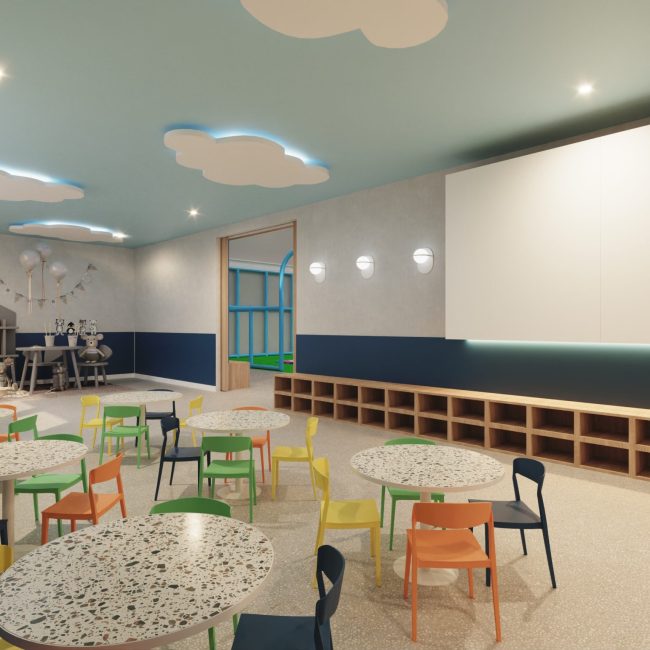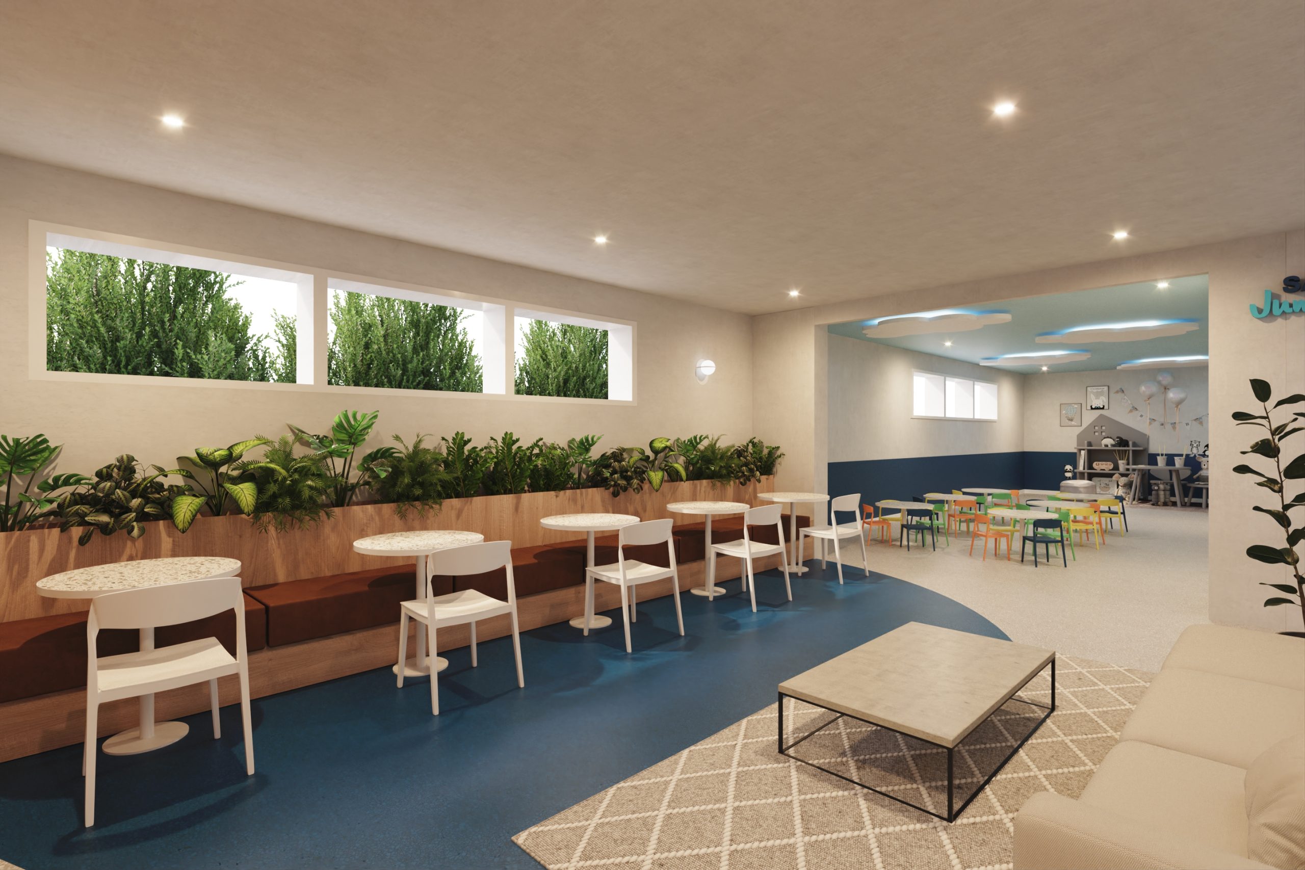 La arquitectura del proyecto no solo se centra en los más pequeños. También incluye áreas cómodas y acogedoras para los padres: espacios de coworking, zonas de descanso y salones de fiesta que hacen de este lugar un centro de experiencias para toda la familia. La atmósfera combina diseño lúdico y contemporáneo, con colores vibrantes, mobiliario cálido y abundante vegetación que aportan frescura y vitalidad.