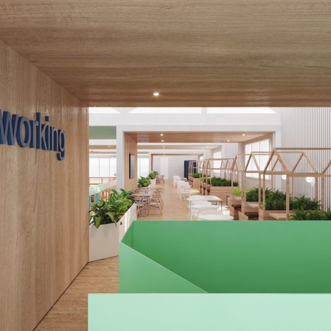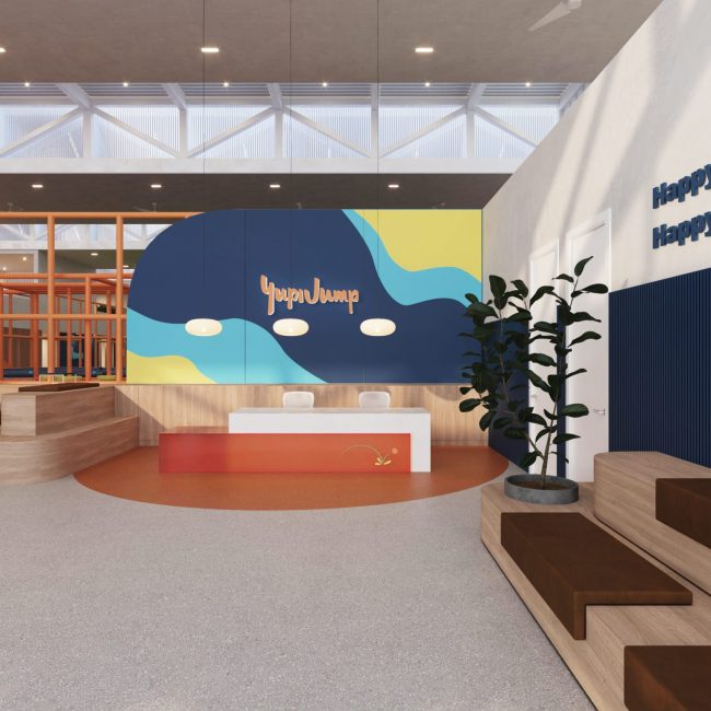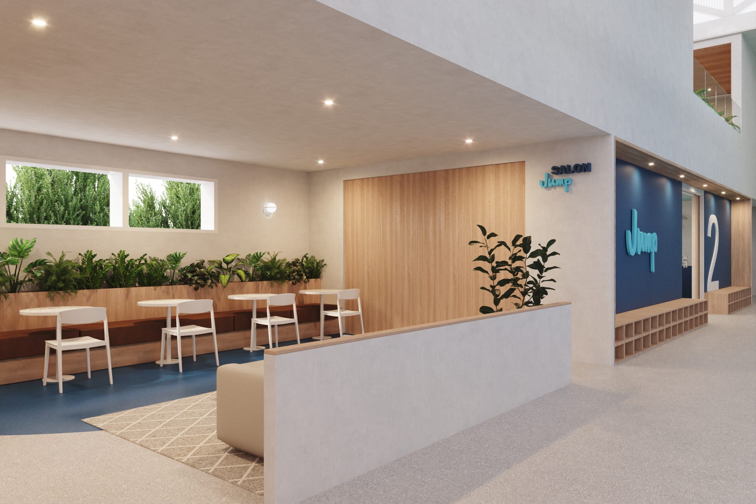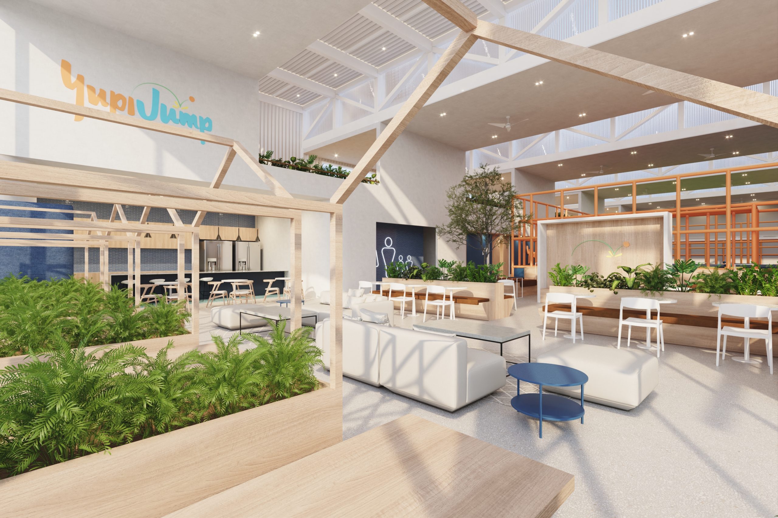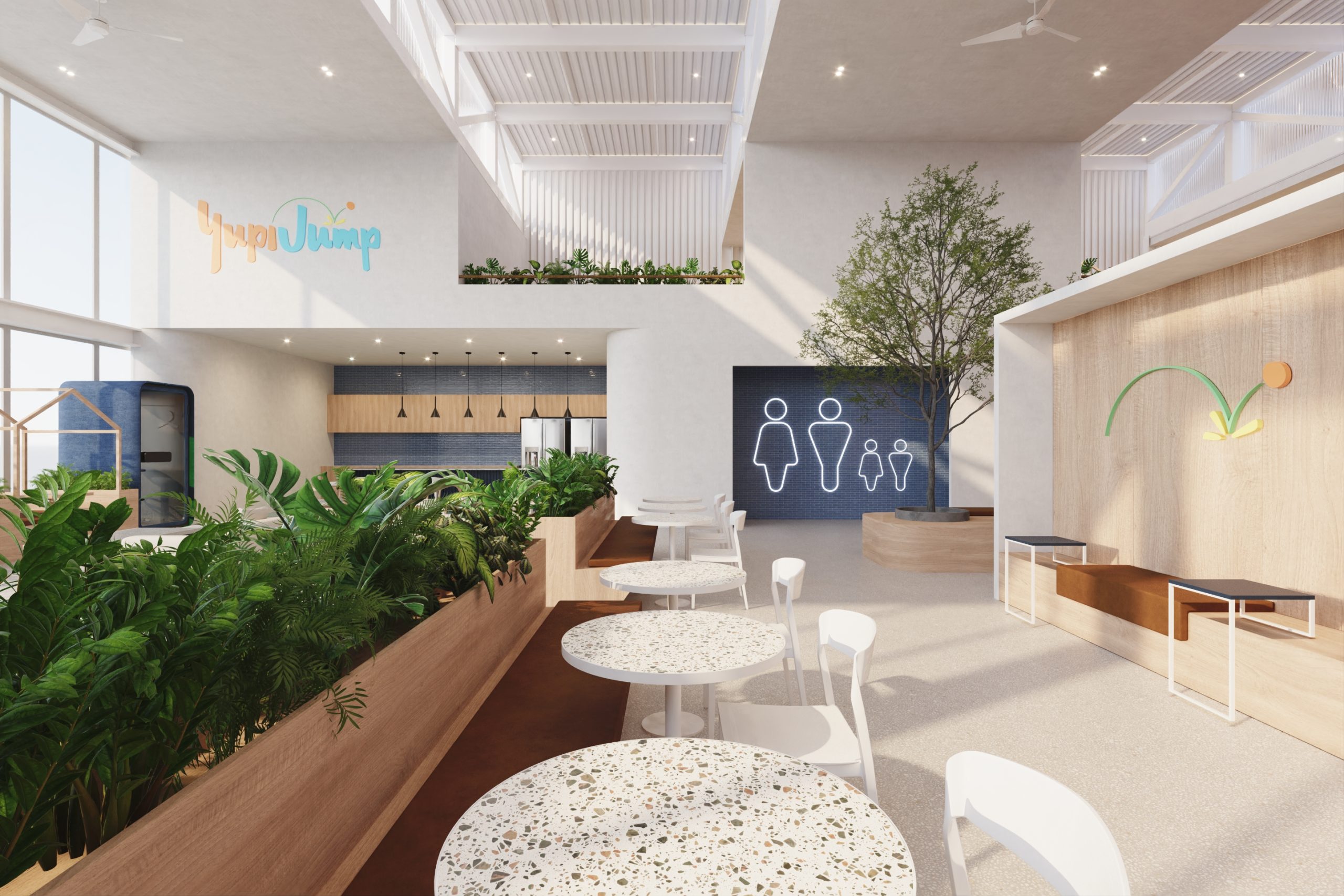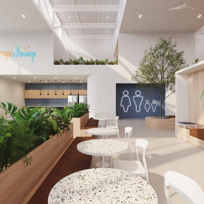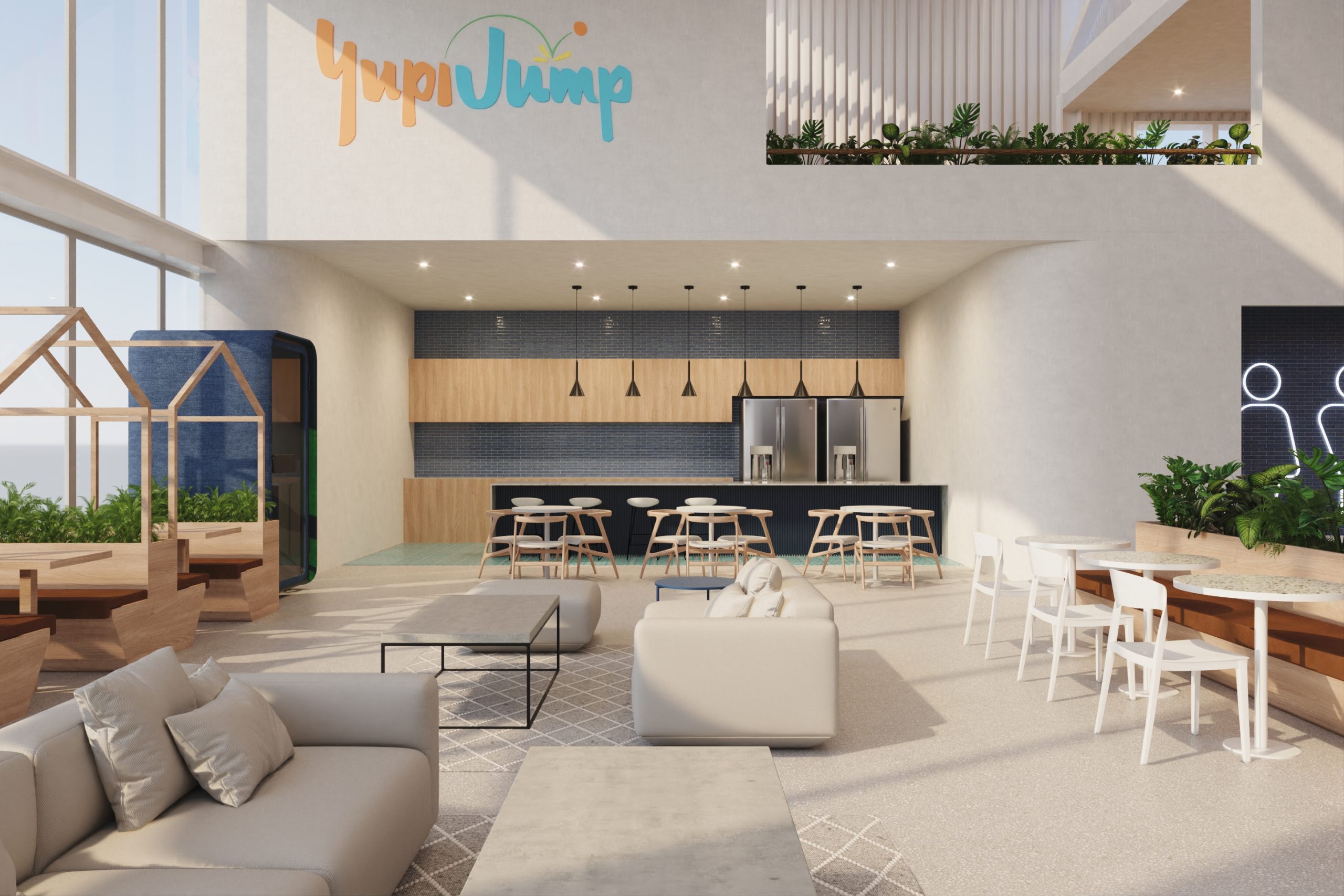 La arquitectura del proyecto no solo se centra en los más pequeños. También incluye áreas cómodas y acogedoras para los padres: espacios de coworking, zonas de descanso y salones de fiesta que hacen de este lugar un centro de experiencias para toda la familia. La atmósfera combina diseño lúdico y contemporáneo, con colores vibrantes, mobiliario cálido y abundante vegetación que aportan frescura y vitalidad.